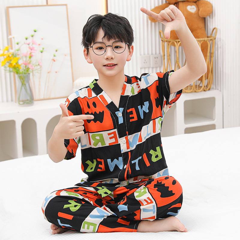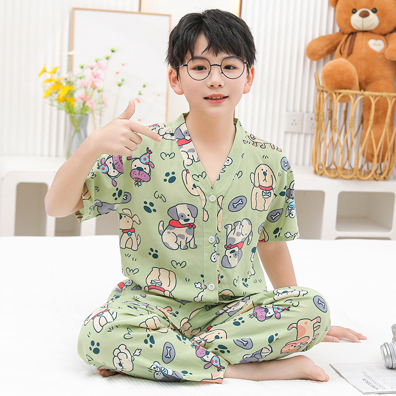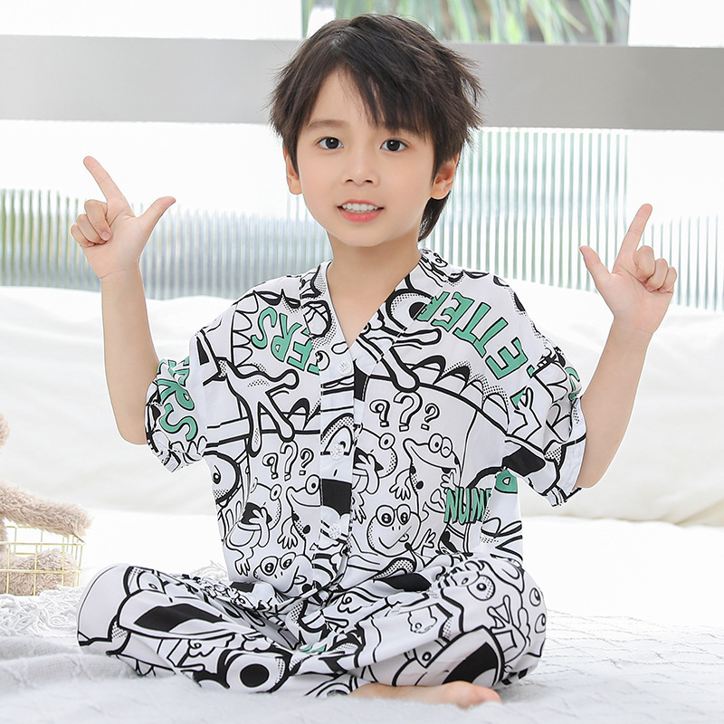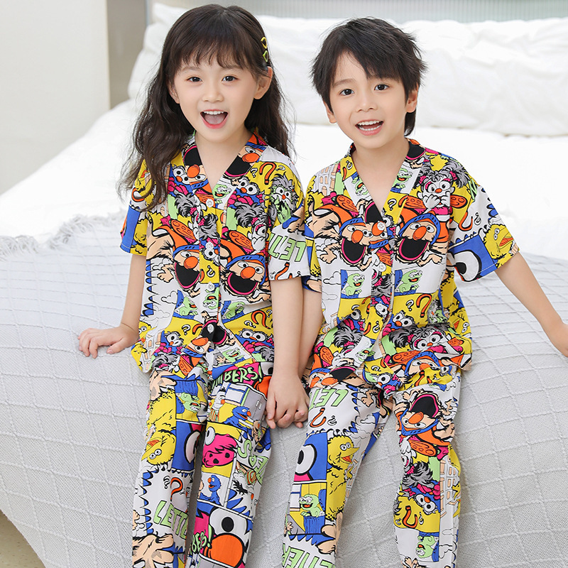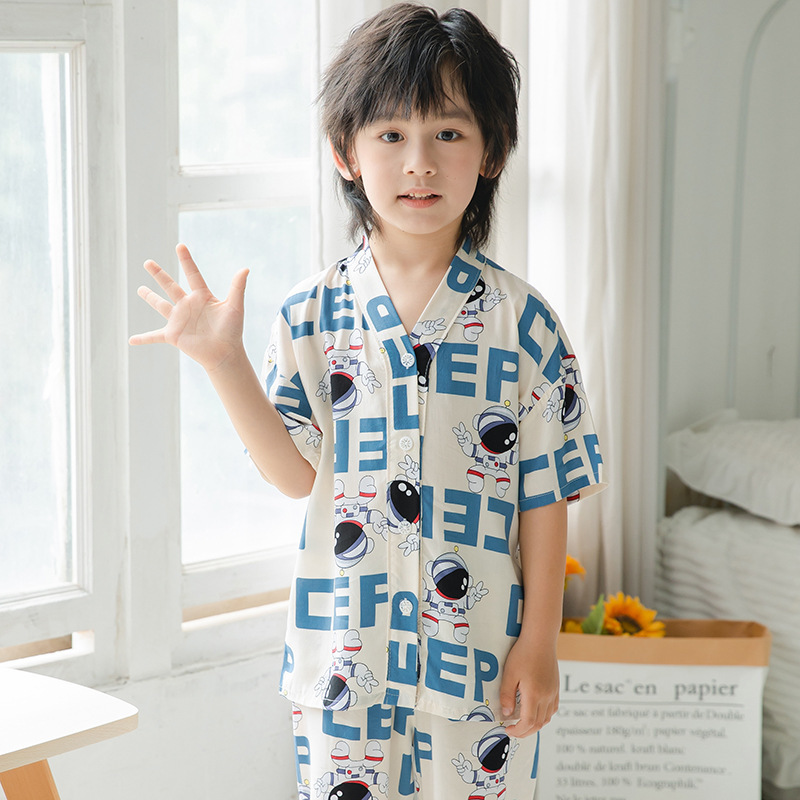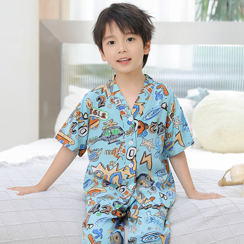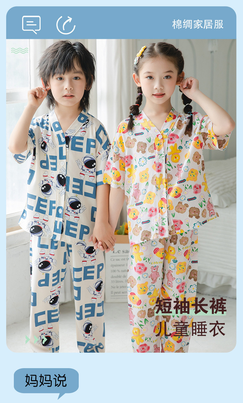 여름 어린이 코튼 실크 세트 새 소년 및 소녀 반팔 에어컨 의류 아기 만화 파자마 면 실크 홈 의류스토어 가기
