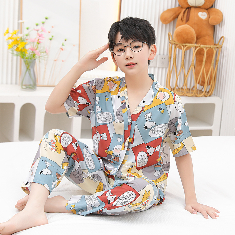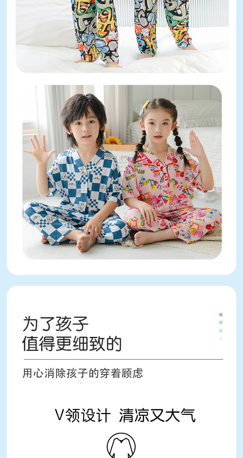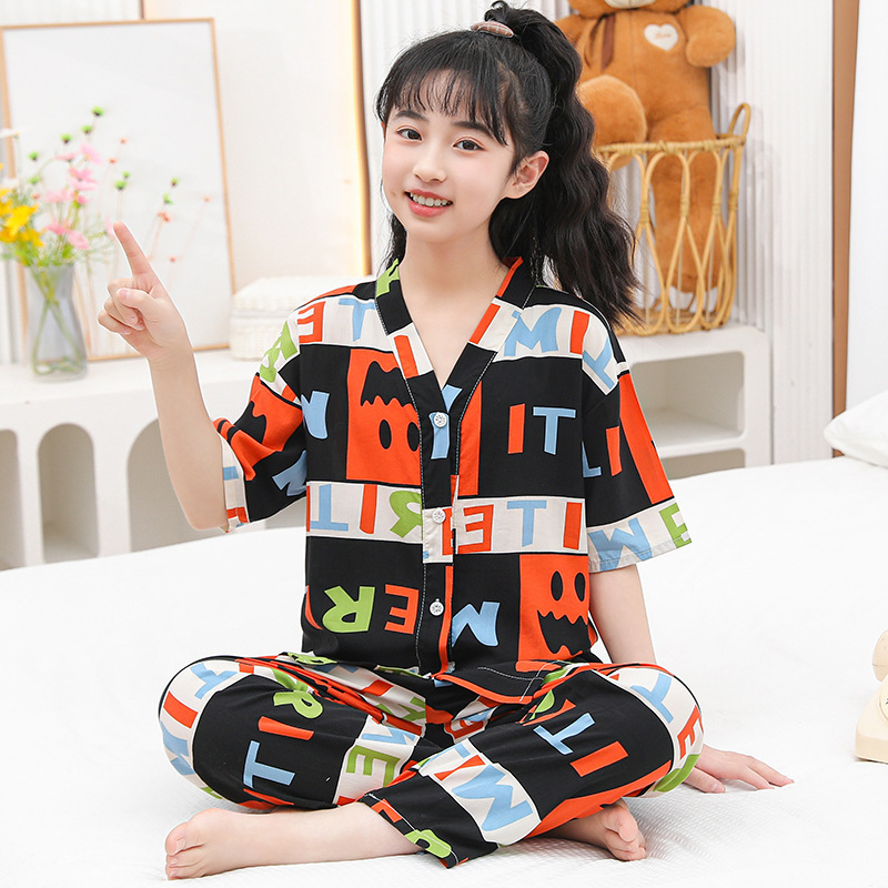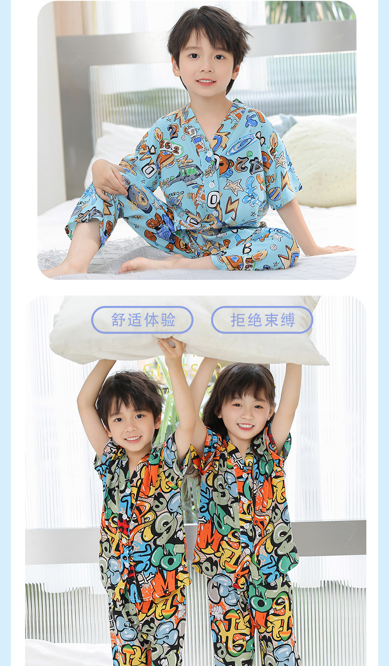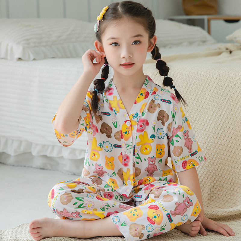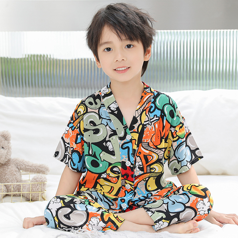 여름 어린이 코튼 실크 세트 새 소년 및 소녀 반팔 에어컨 의류 아기 만화 파자마 면 실크 홈 의류스토어 가기