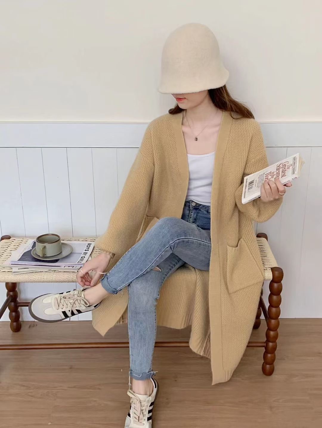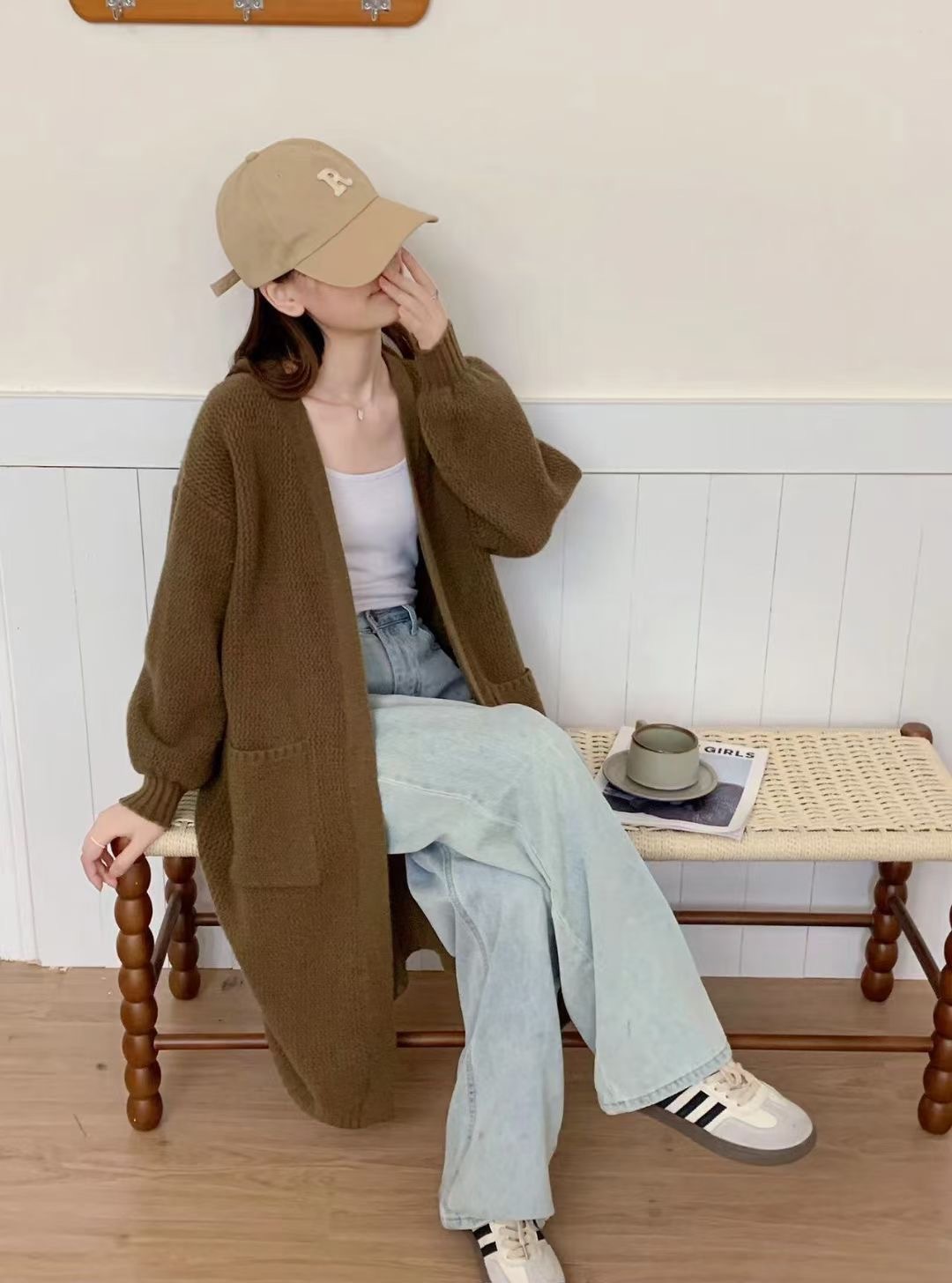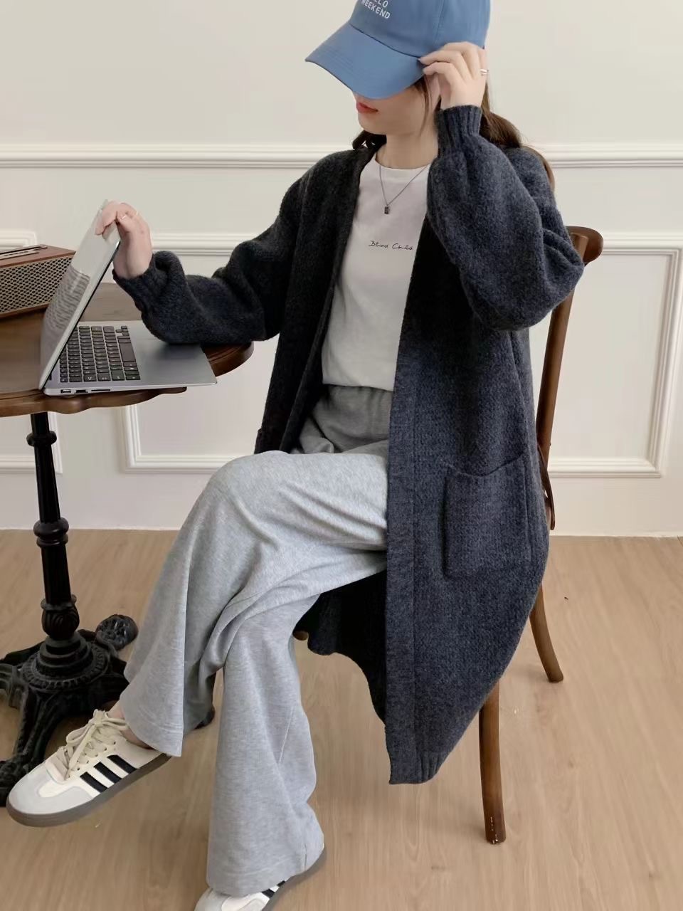 한국 스타일 게으른 스타일 긴 무릎 니트 카디건 여성 2024 새로운 가을과 겨울 느슨한 슬리밍 솔리드 컬러 스웨터스토어 가기