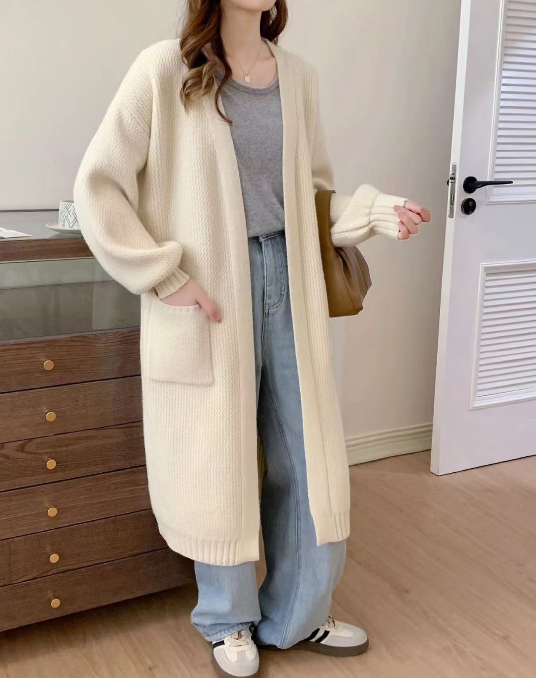 한국 스타일 게으른 스타일 긴 무릎 니트 카디건 여성 2024 새로운 가을과 겨울 느슨한 슬리밍 솔리드 컬러 스웨터
