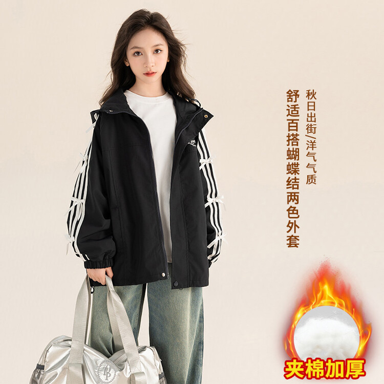 여자 봄, 가을 재킷 새로운 캐주얼 탑 큰 어린이 여자 유행 후드 재킷 보우 지퍼 셔츠