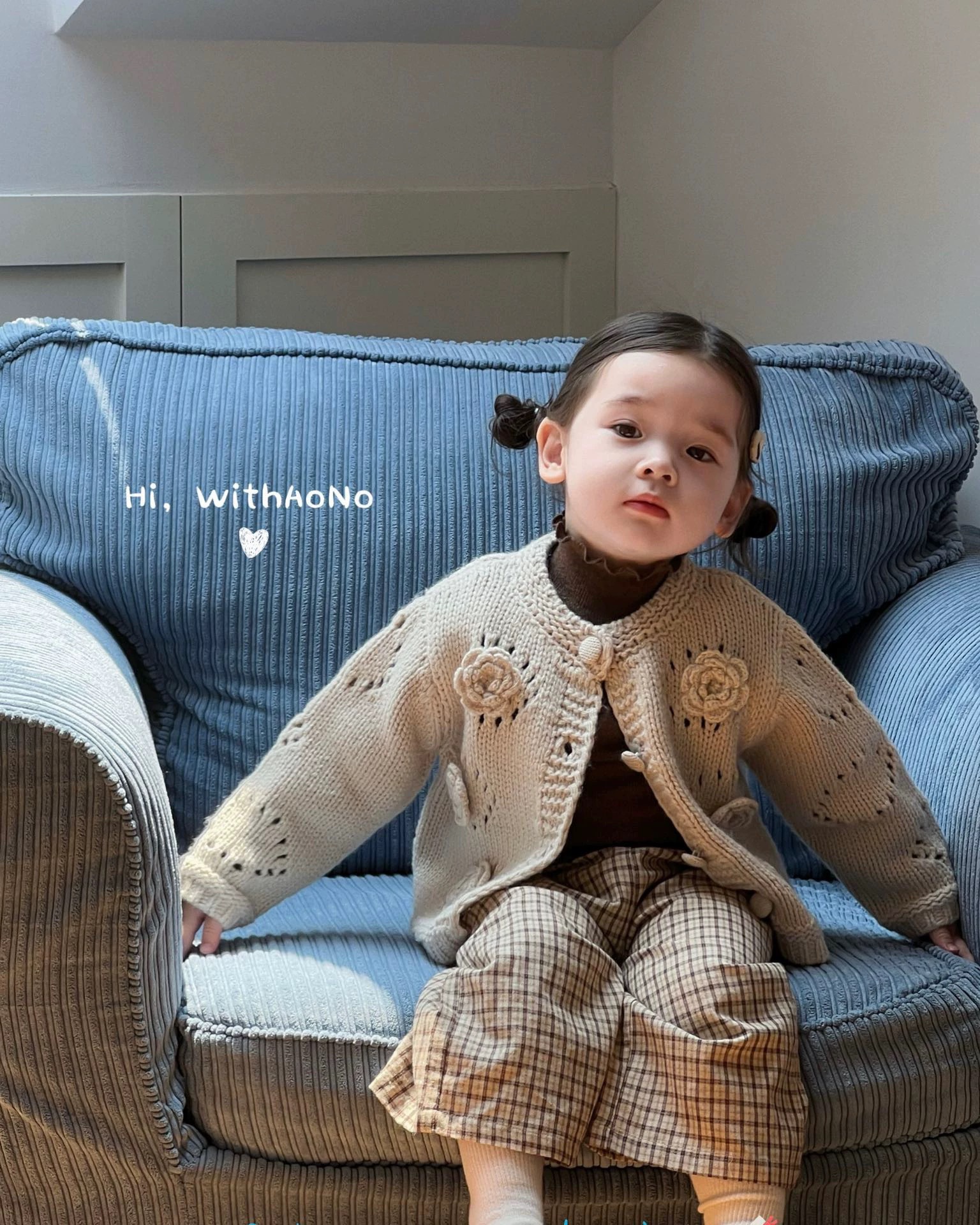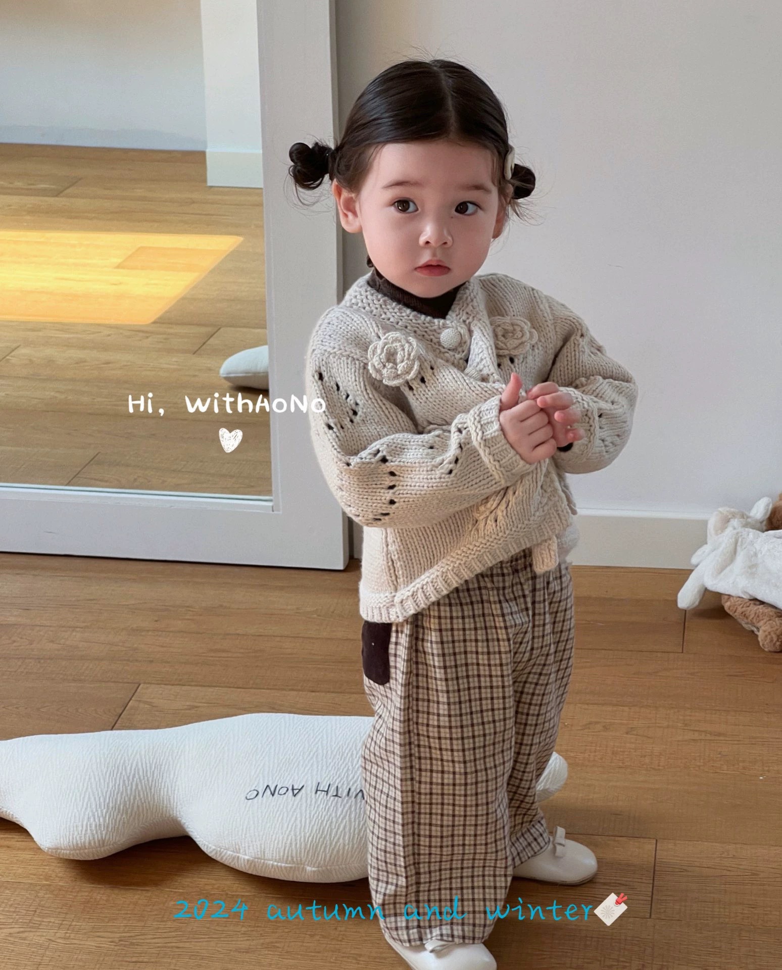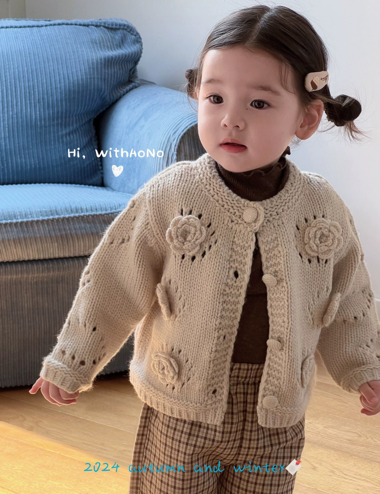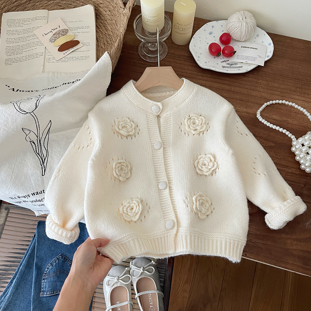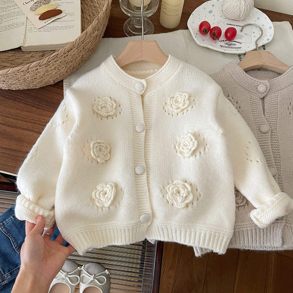 여자 라운드 넥 스웨터 2025 가을 아기 손으로 짠 꽃 면화 코트 한국어 버전 어린이 단색 카디건스토어 가기
