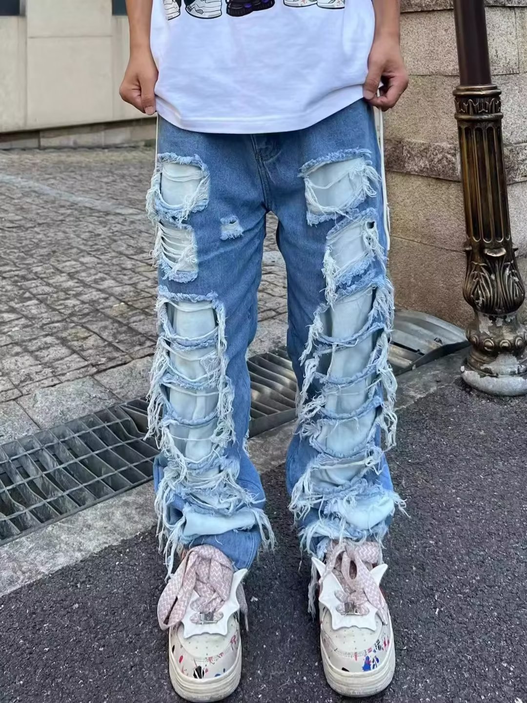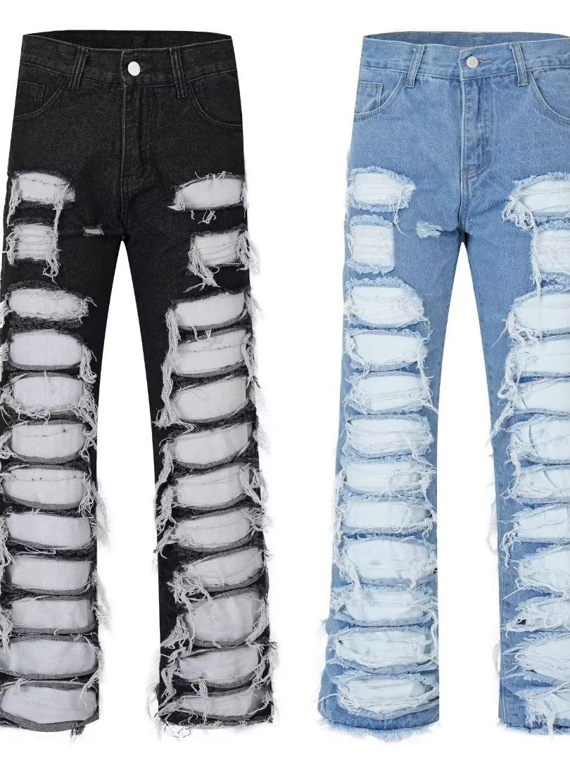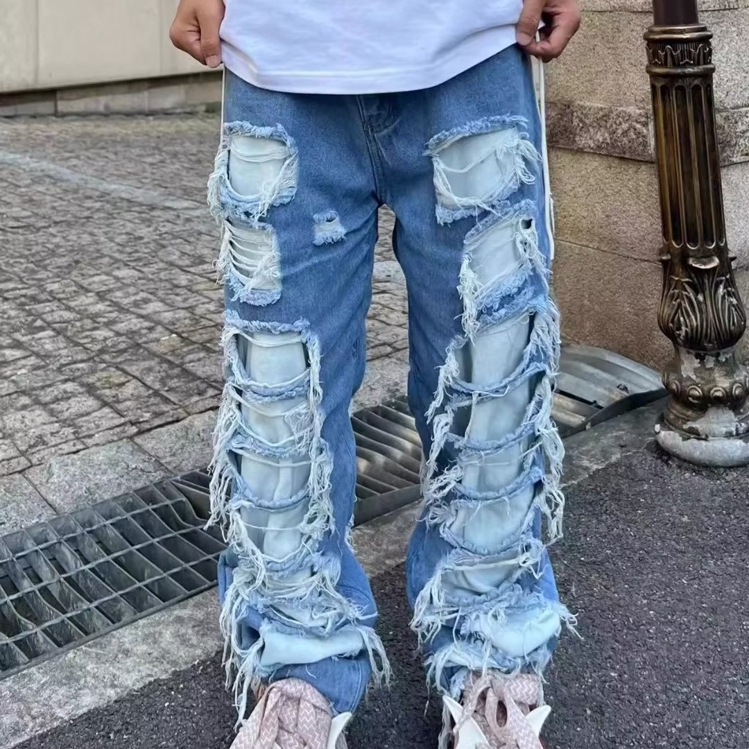 헐렁한 유럽과 미국의 침식 슬릿 패치 청바지 남성용 하이 스트리트 느슨한 스트레이트 거지 바지 대외 무역 국경스토어 가기