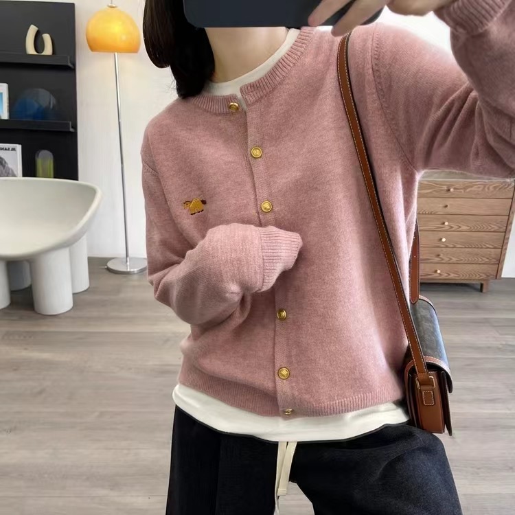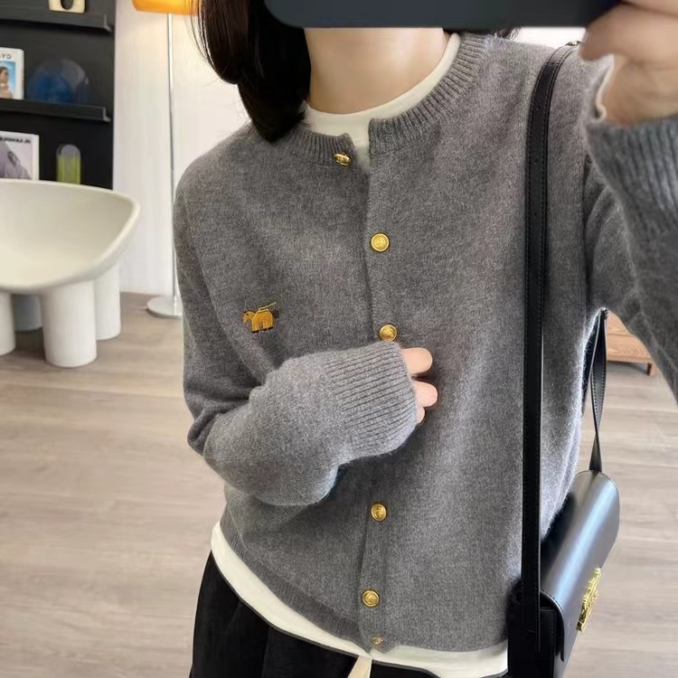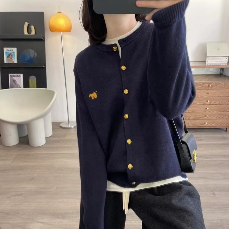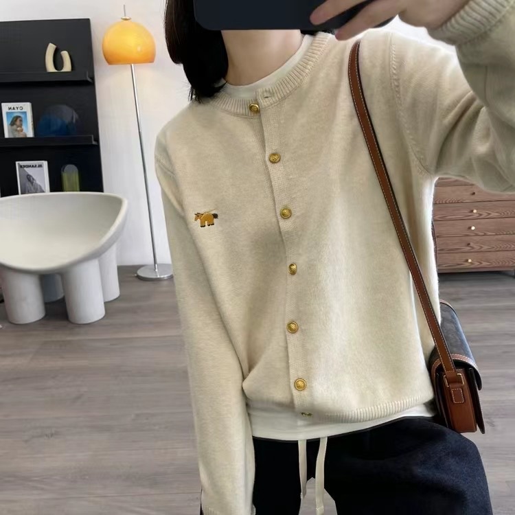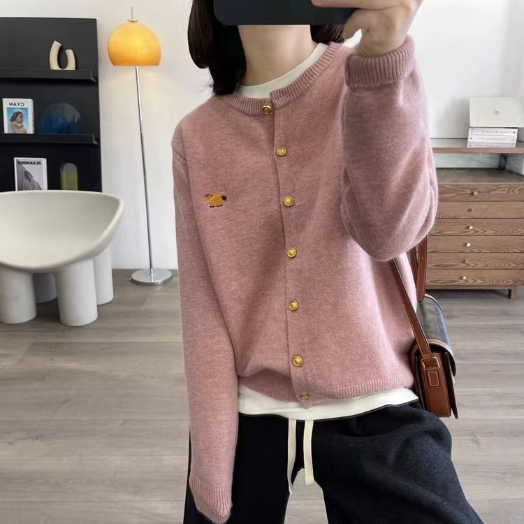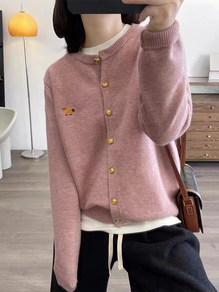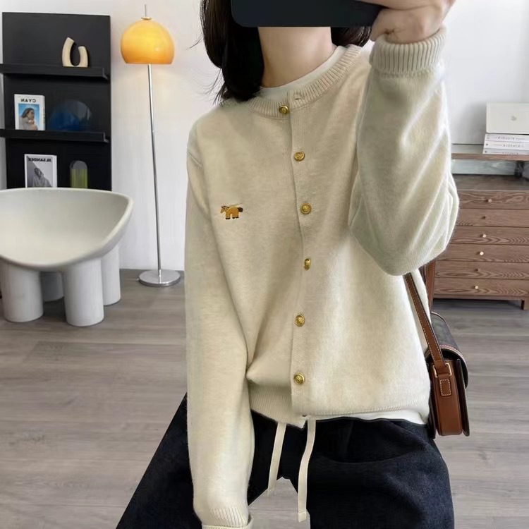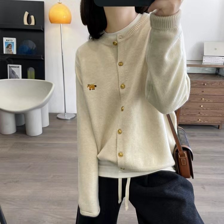 봄과 가을 유럽 역 둥근 목 금속 버클 울 카디건 여성 느슨한 자수 포니 스웨터 코트 스웨터 소프트 왁스스토어 가기