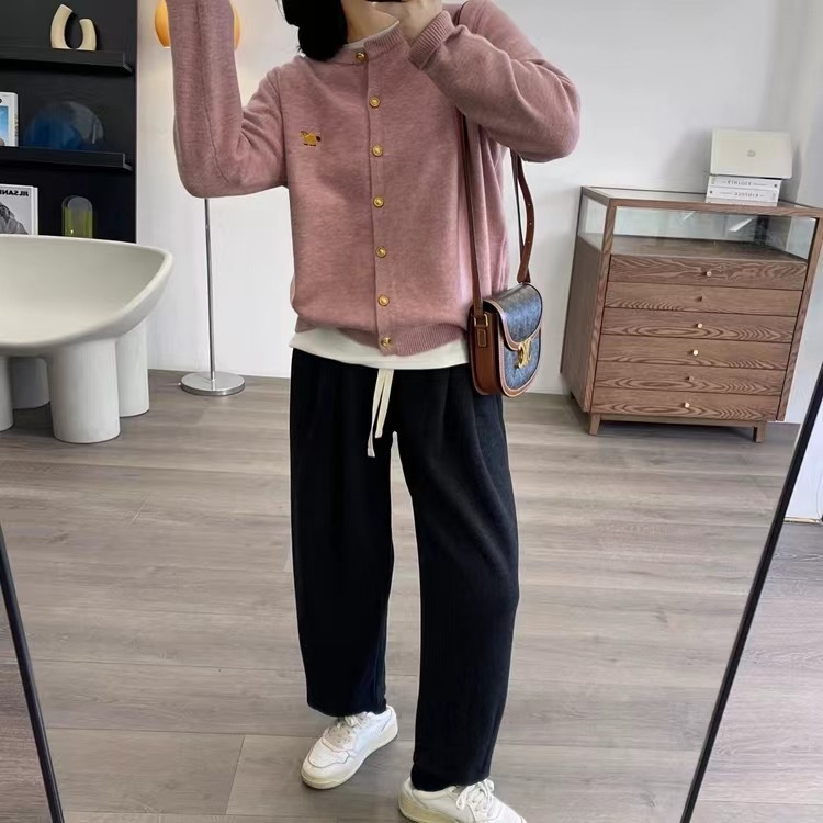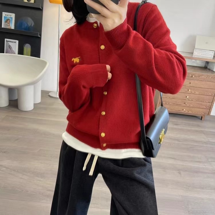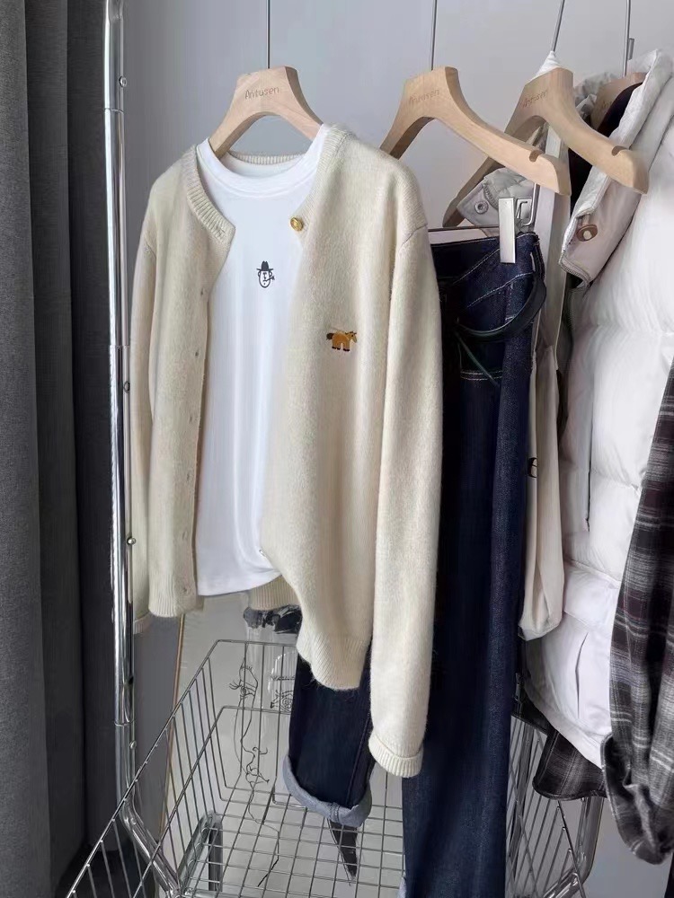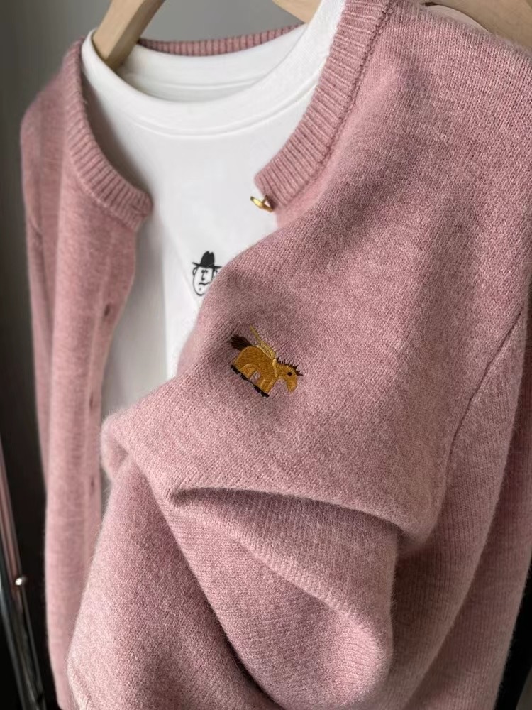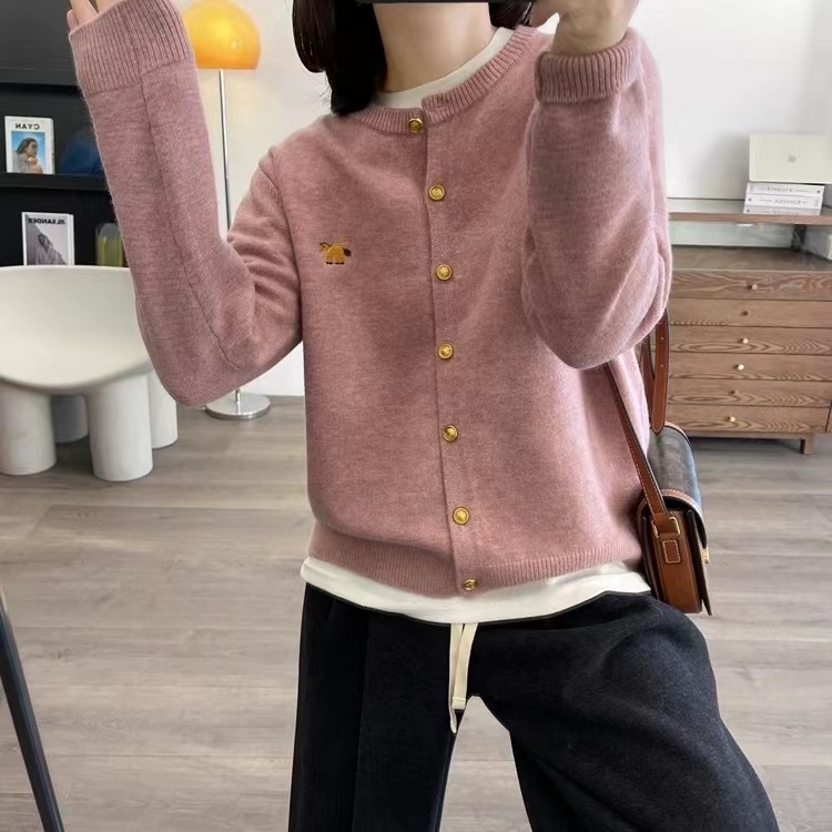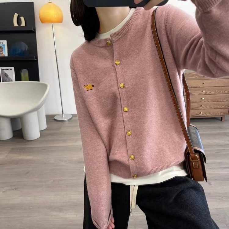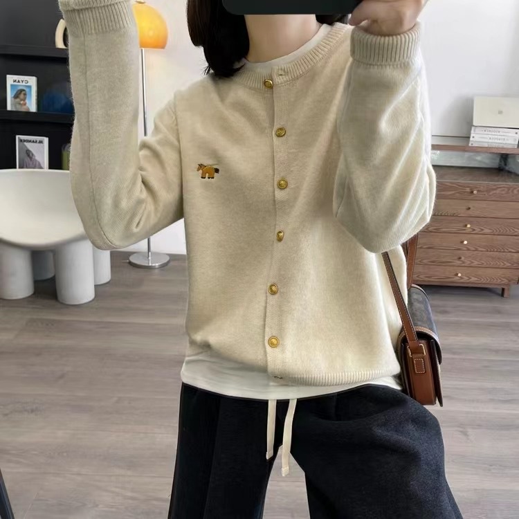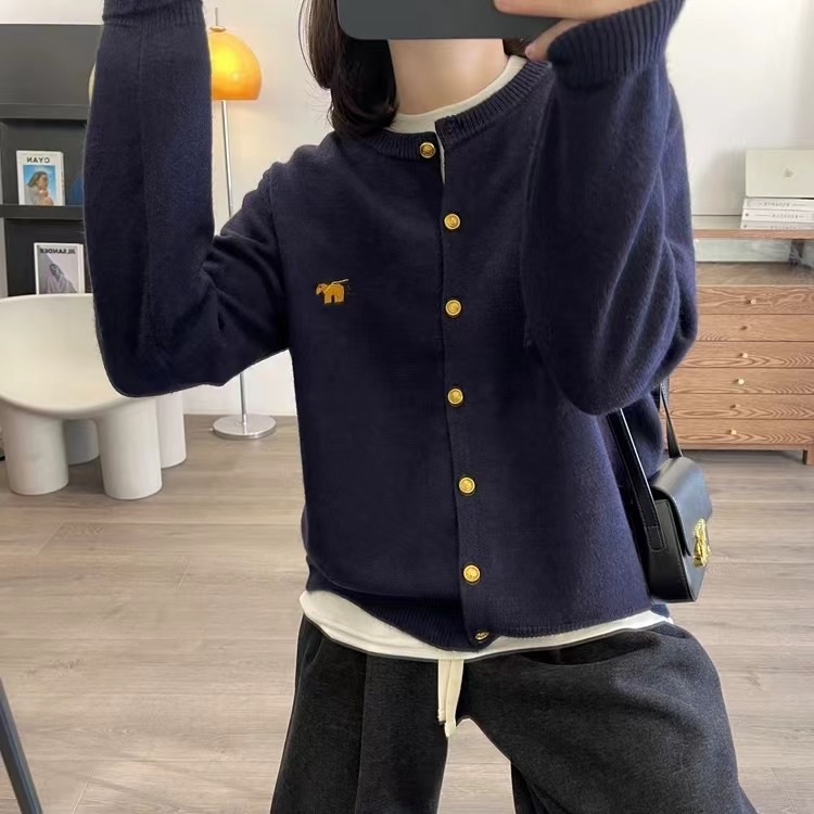 봄과 가을 유럽 역 둥근 목 금속 버클 울 카디건 여성 느슨한 자수 포니 스웨터 코트 스웨터 소프트 왁스스토어 가기