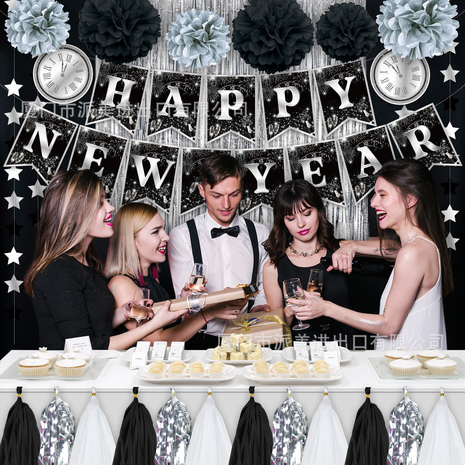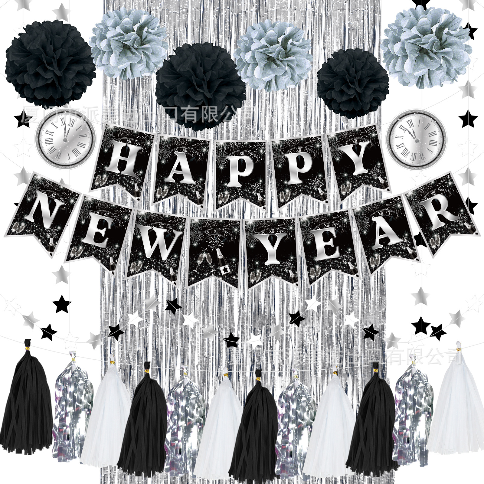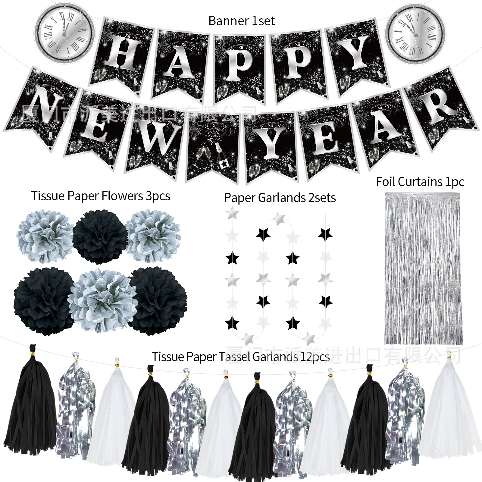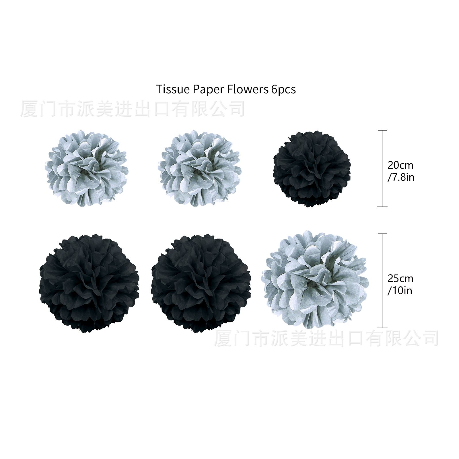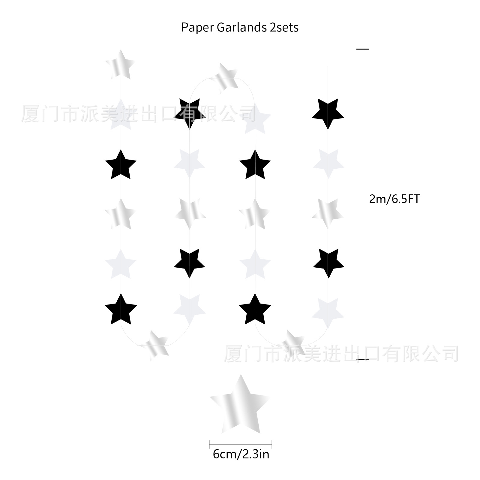 套装5包括:1条拉旗+纸花25cm 3个(5201+5103)+纸花20cm3个(5201+5103)+7cm星星纸串2米2条(250-1白色+250-43 黑色+双面-大度-300-6银)+雨丝帘(银色)+流苏12个(0001+5201+银色铝膜)