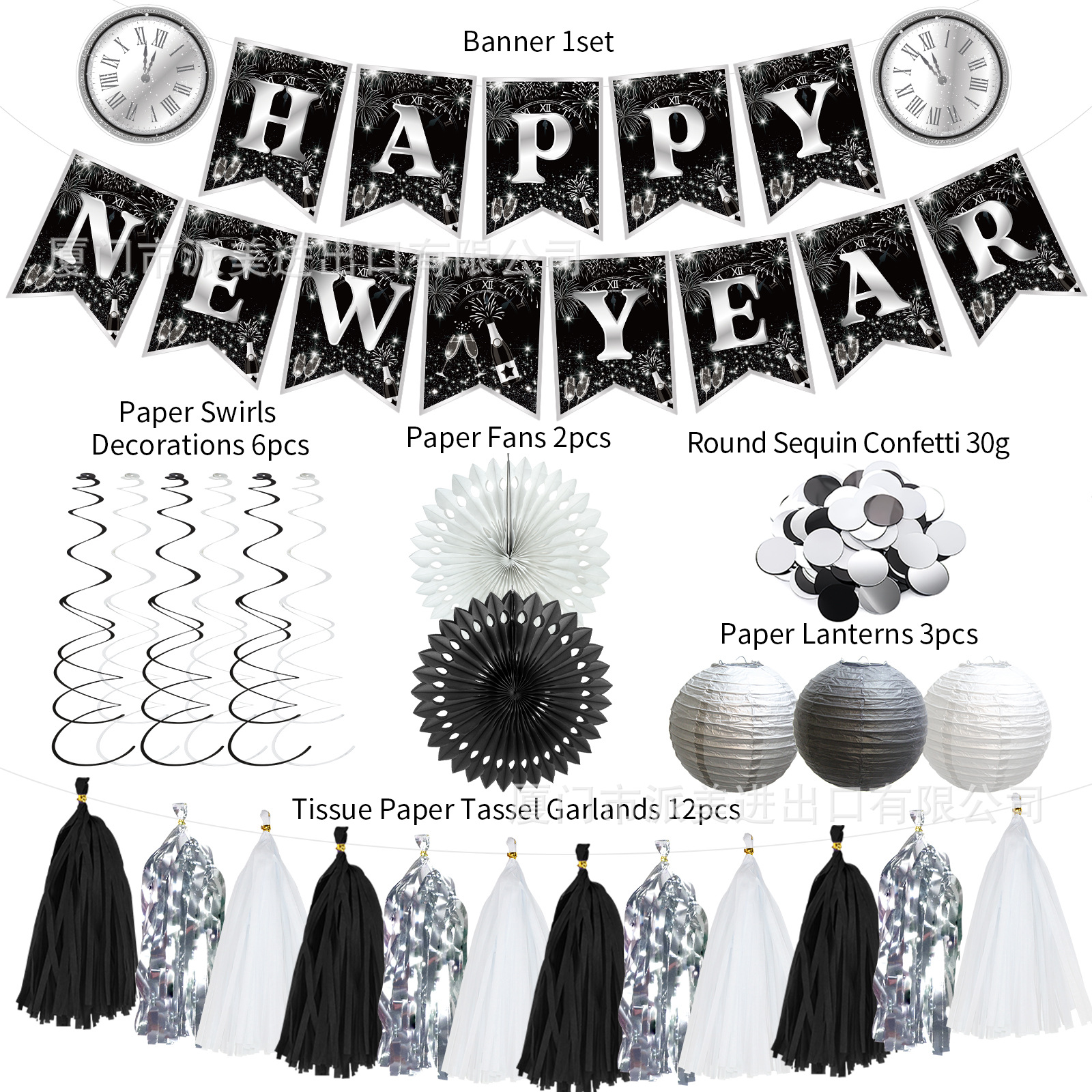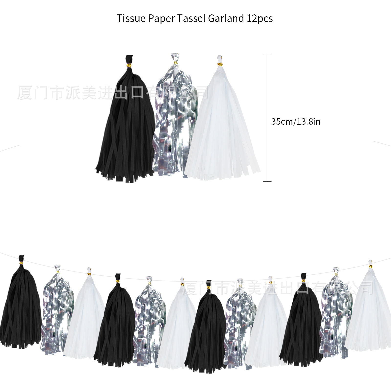 套装4包括:1条拉旗+纸扇25cm 2个(009黑+045白)+灯笼20cm3个(白色+银色+黑色)+彩胶纸螺旋2色6条(250-43 黑色+双面-大度-300-6银)+流苏12个(0001+5201+银色铝膜)+纸屑:双面黑色+双面银色(30g一包)+流苏12个(0001+5201+银色铝膜)