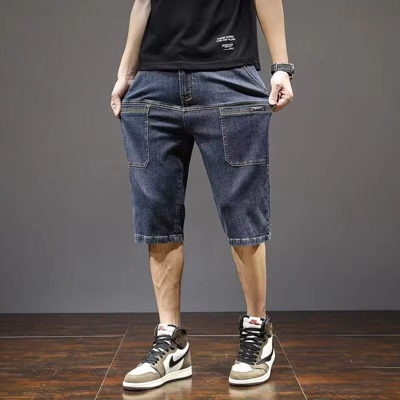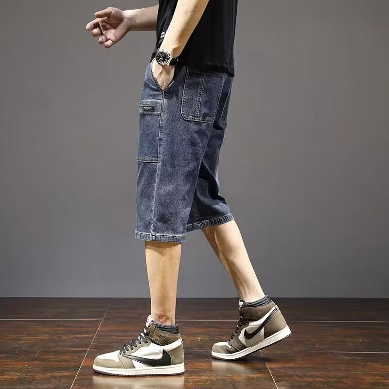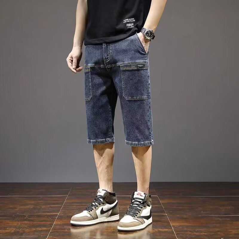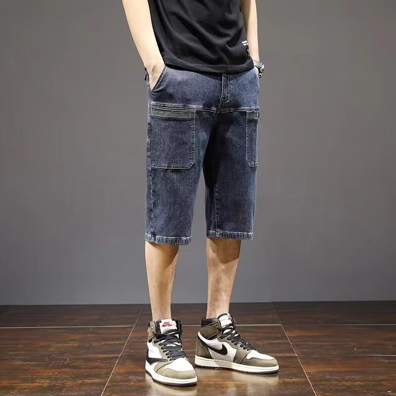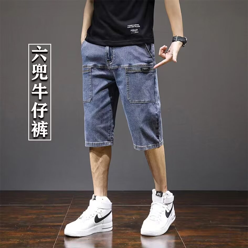 봄과 여름 멀티 가방 느슨한 스트레치 자른 바지 남자 바지 한국 유행 청바지 슬림 핏 패션 반바지