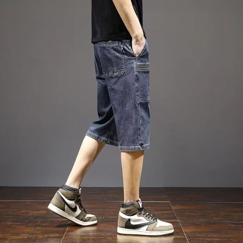 봄과 여름 멀티 가방 느슨한 스트레치 자른 바지 남자 바지 한국 유행 청바지 슬림 핏 패션 반바지스토어 가기