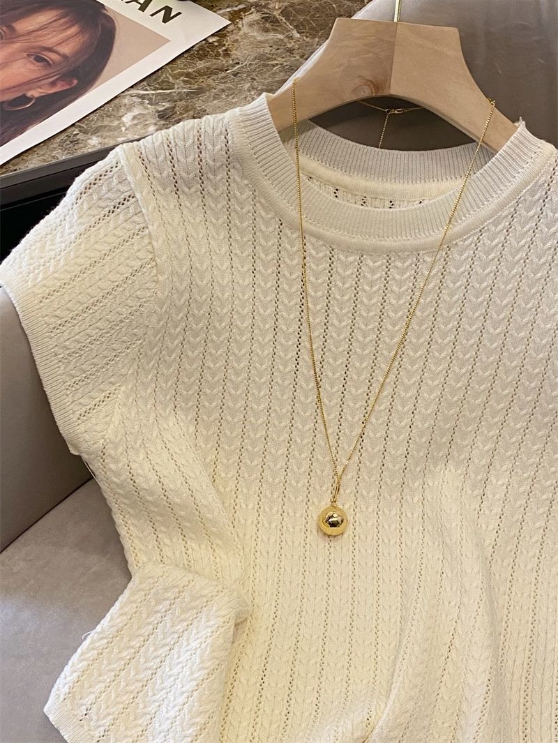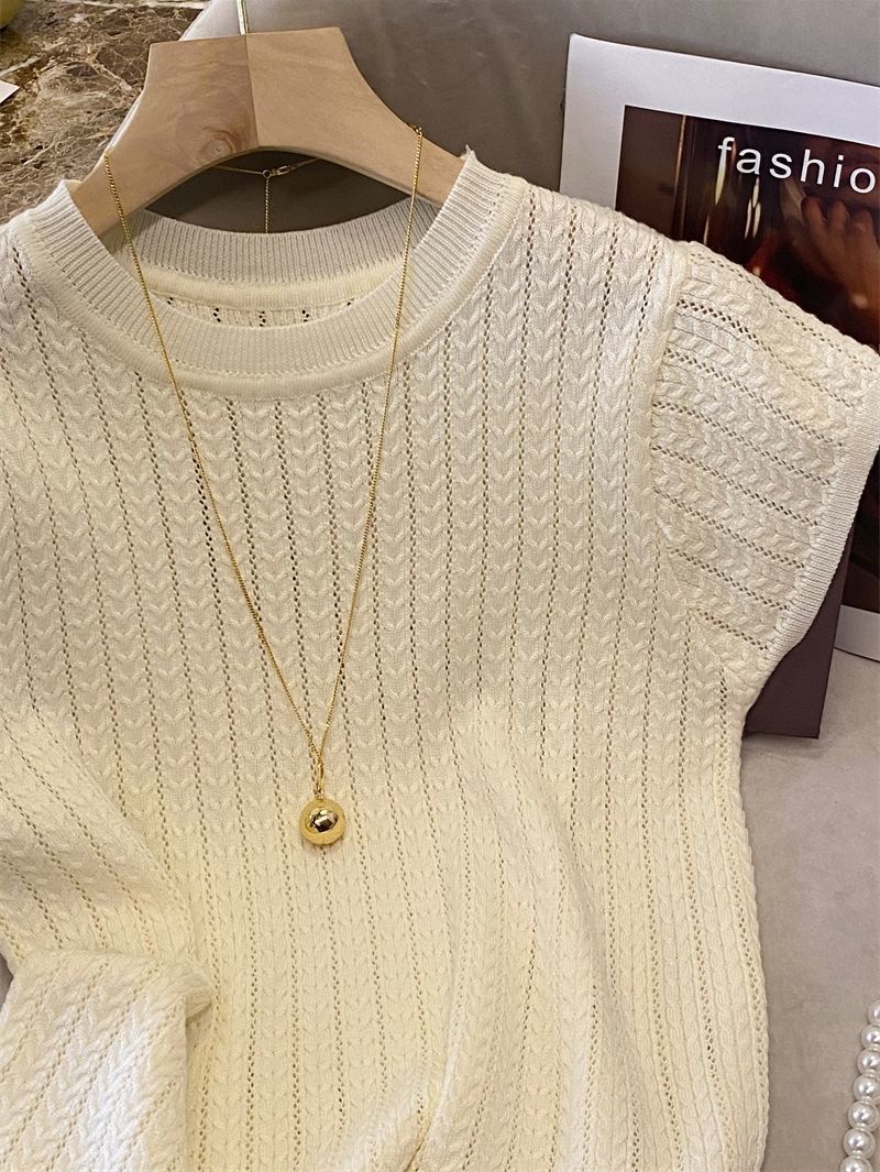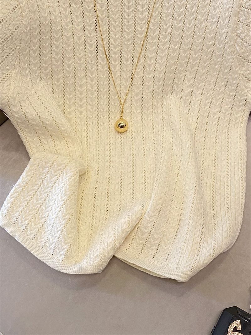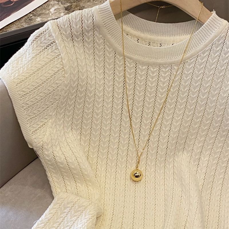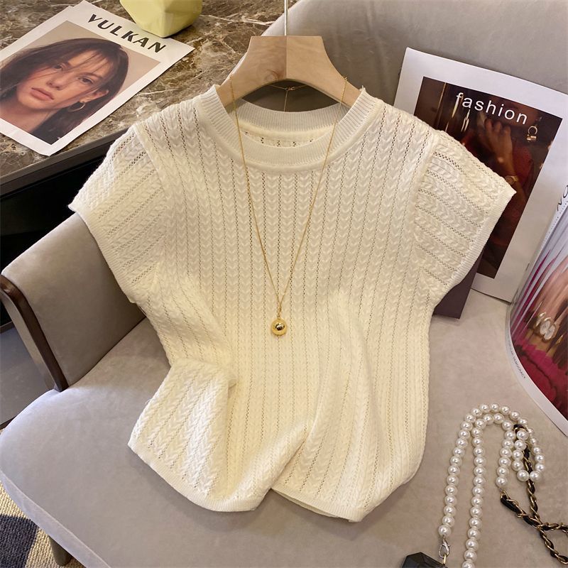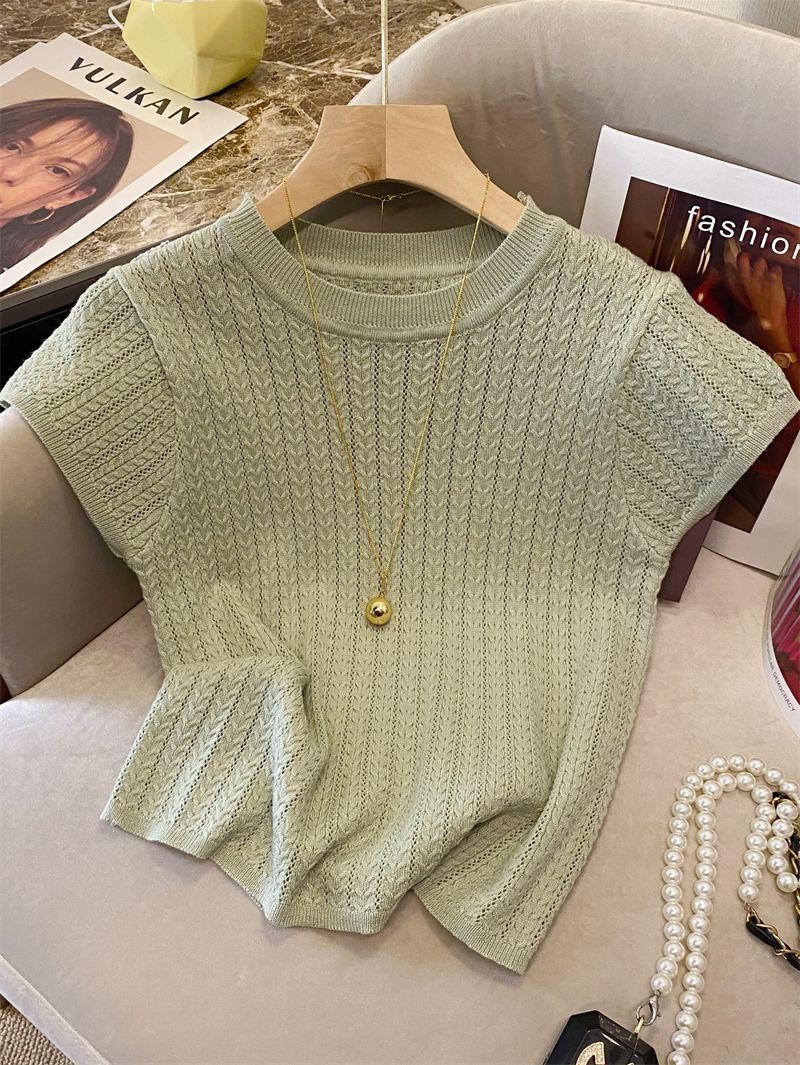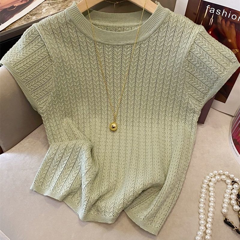 소금 달콤한 반팔 스웨터 여자 여름 하이 엔드 슈퍼 잘 생긴 기질 시대 감소 라운드 넥 트위스트 쇼트 탑