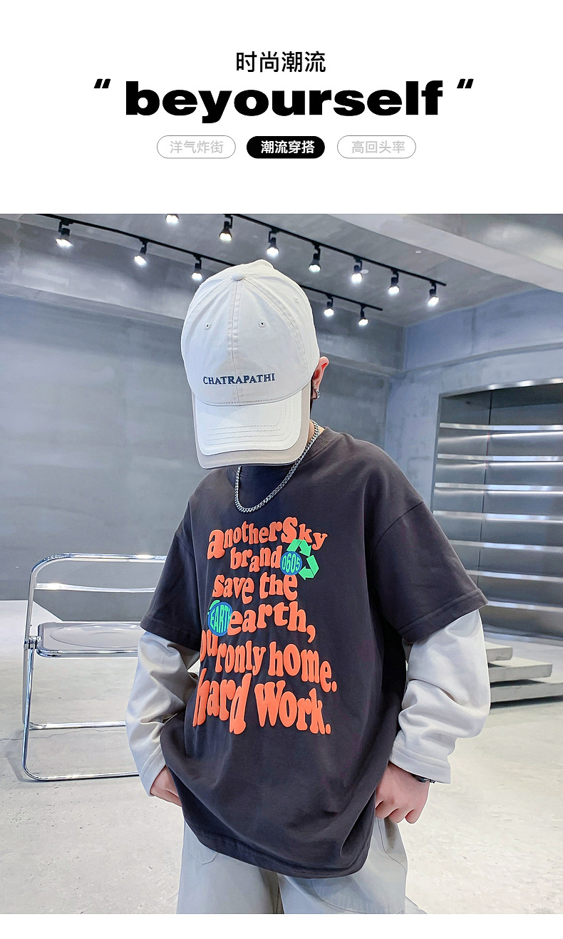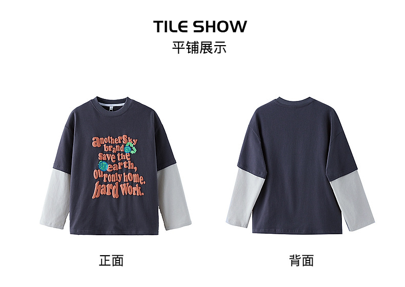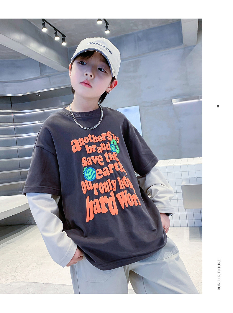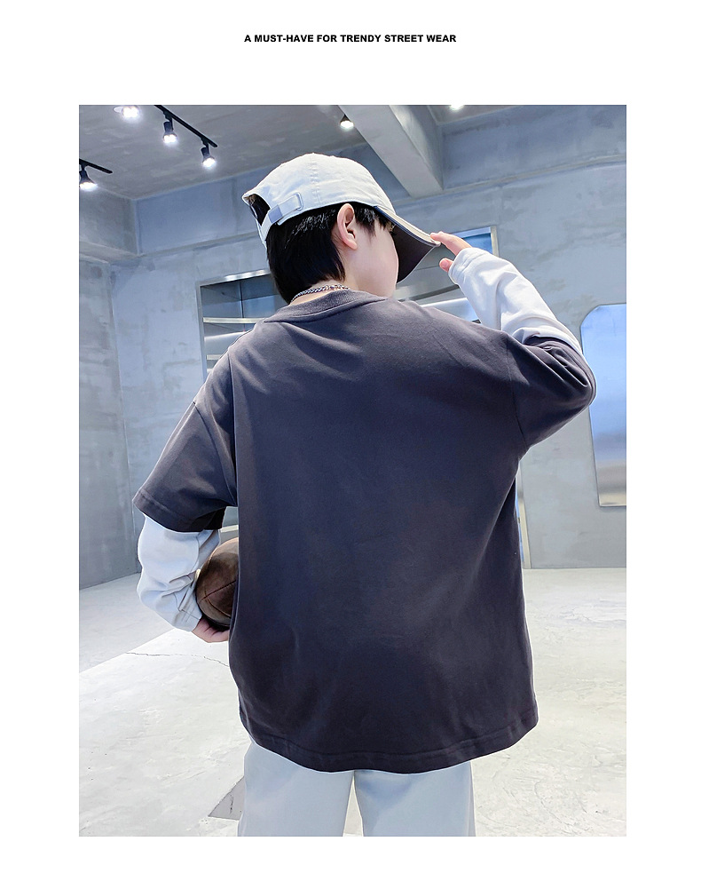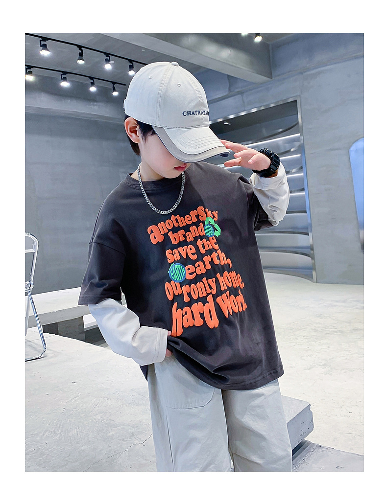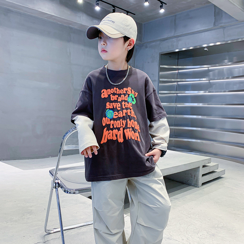 트렌디 브랜드 소년 가을 가짜 투피스 긴팔 티셔츠 2025 새로운 아동 의류 소년 가을 느슨한 큰 어린이상의스토어 가기