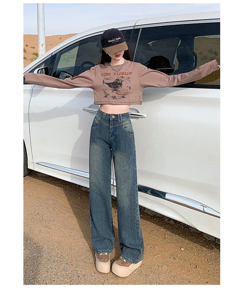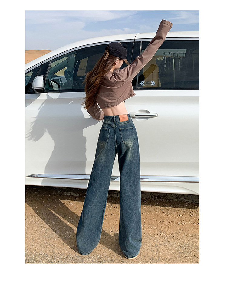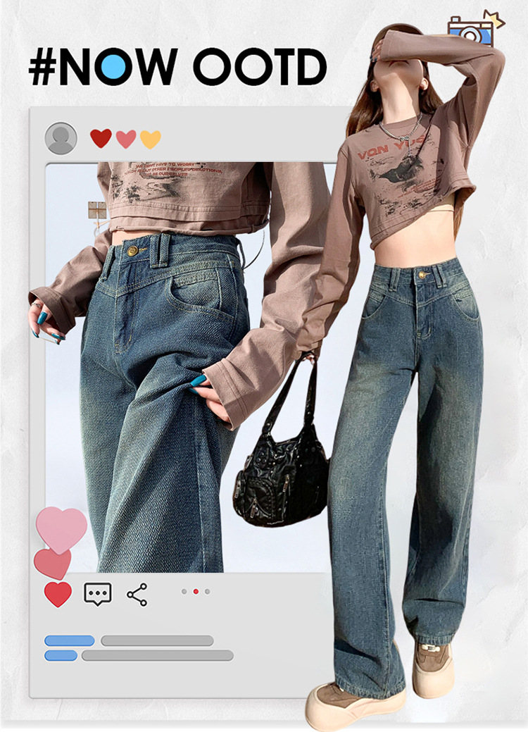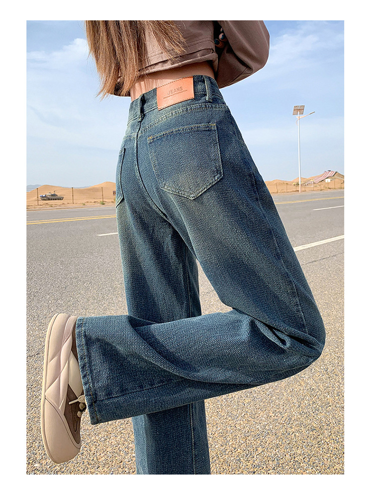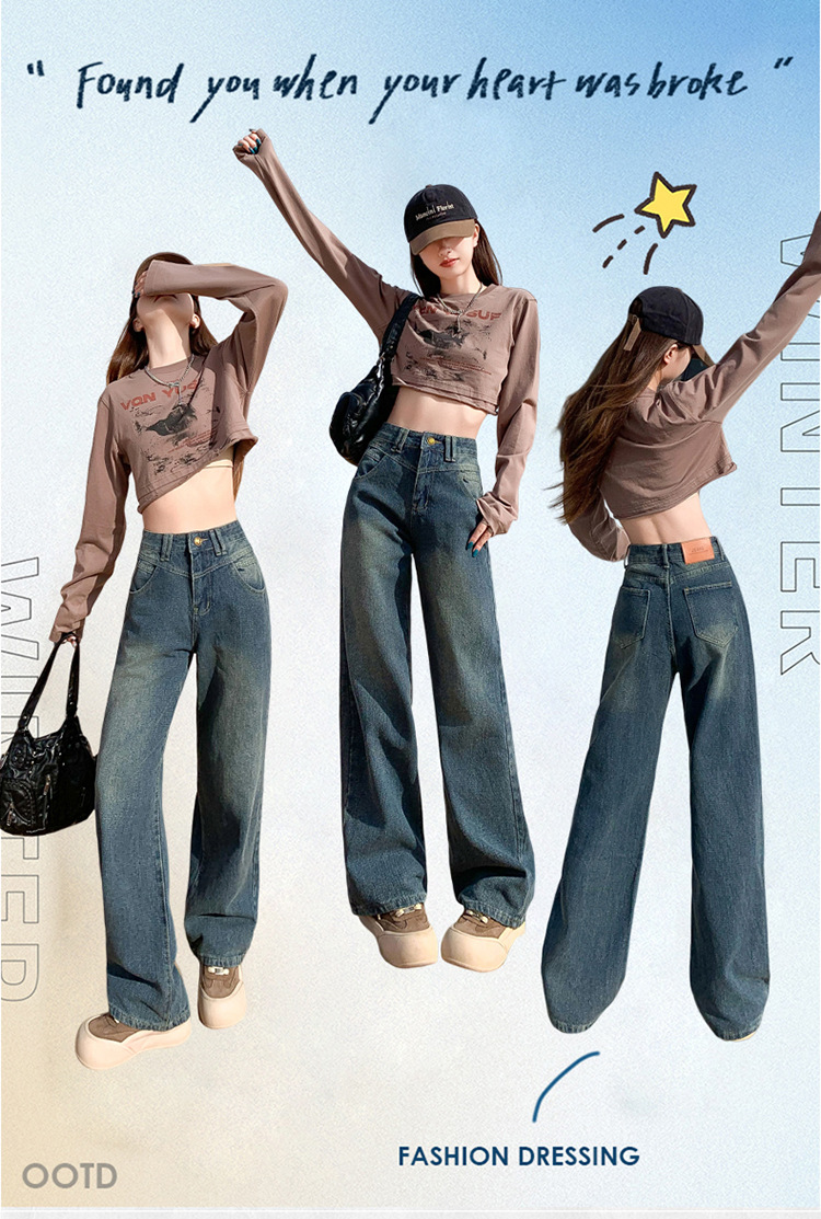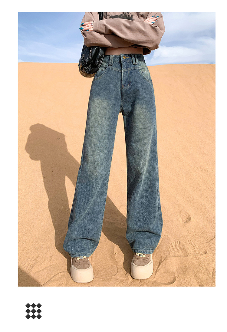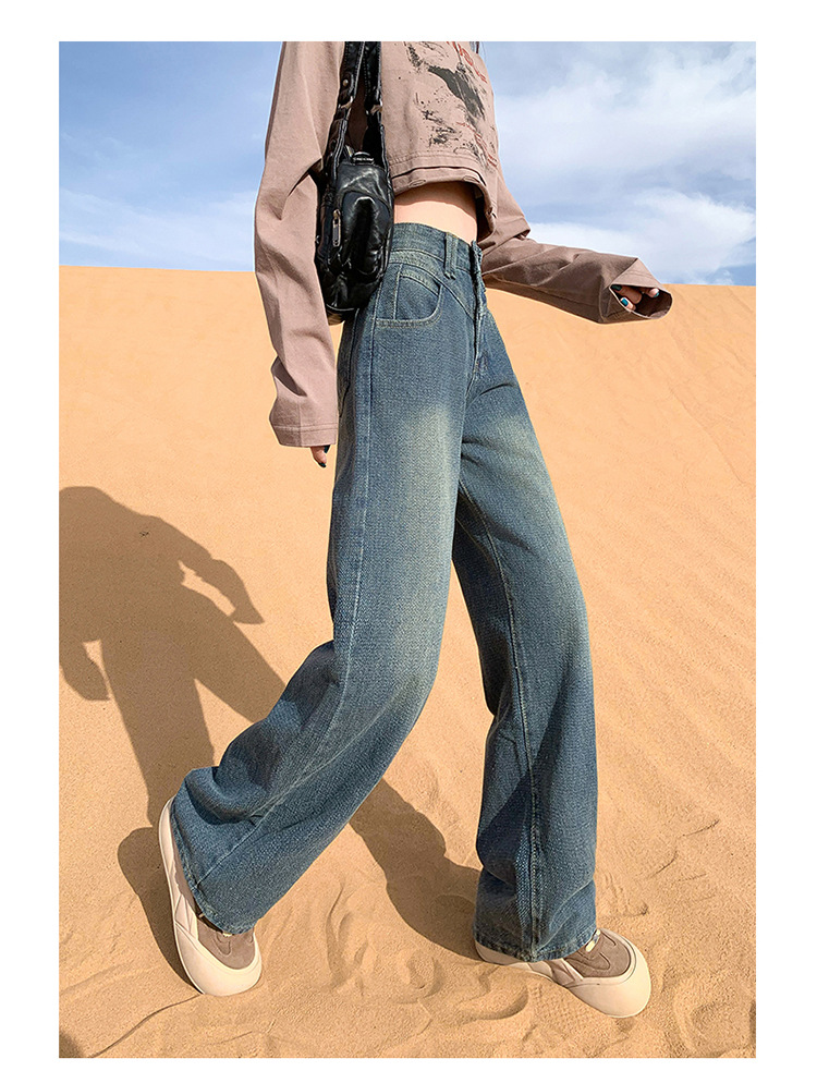 빈티지 블루 양각 별 패턴 넓은 다리 청바지 여성용 느슨한 높은 허리 슬림 다운 스타일 캐주얼 좁은 걸레 바지스토어 가기