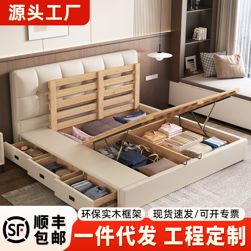 크림 스타일 가죽 침대 얇은 헤드 사이드 침대 이탈리아 스타일 미니멀리스트 작은 아파트 현대 간단한 더블 침대 3 펌핑 저장 바닥-스탠딩 침대스토어 가기