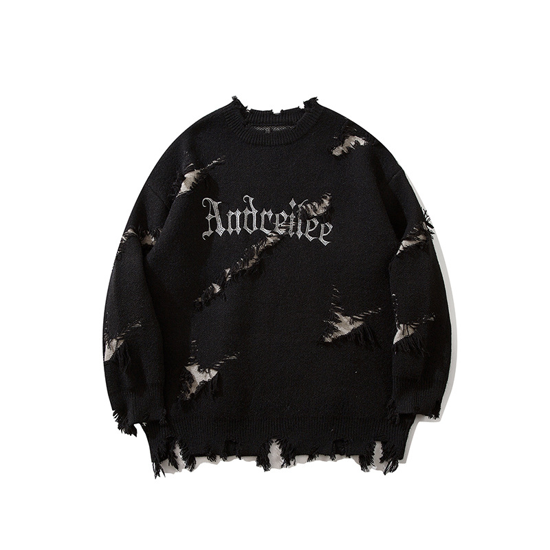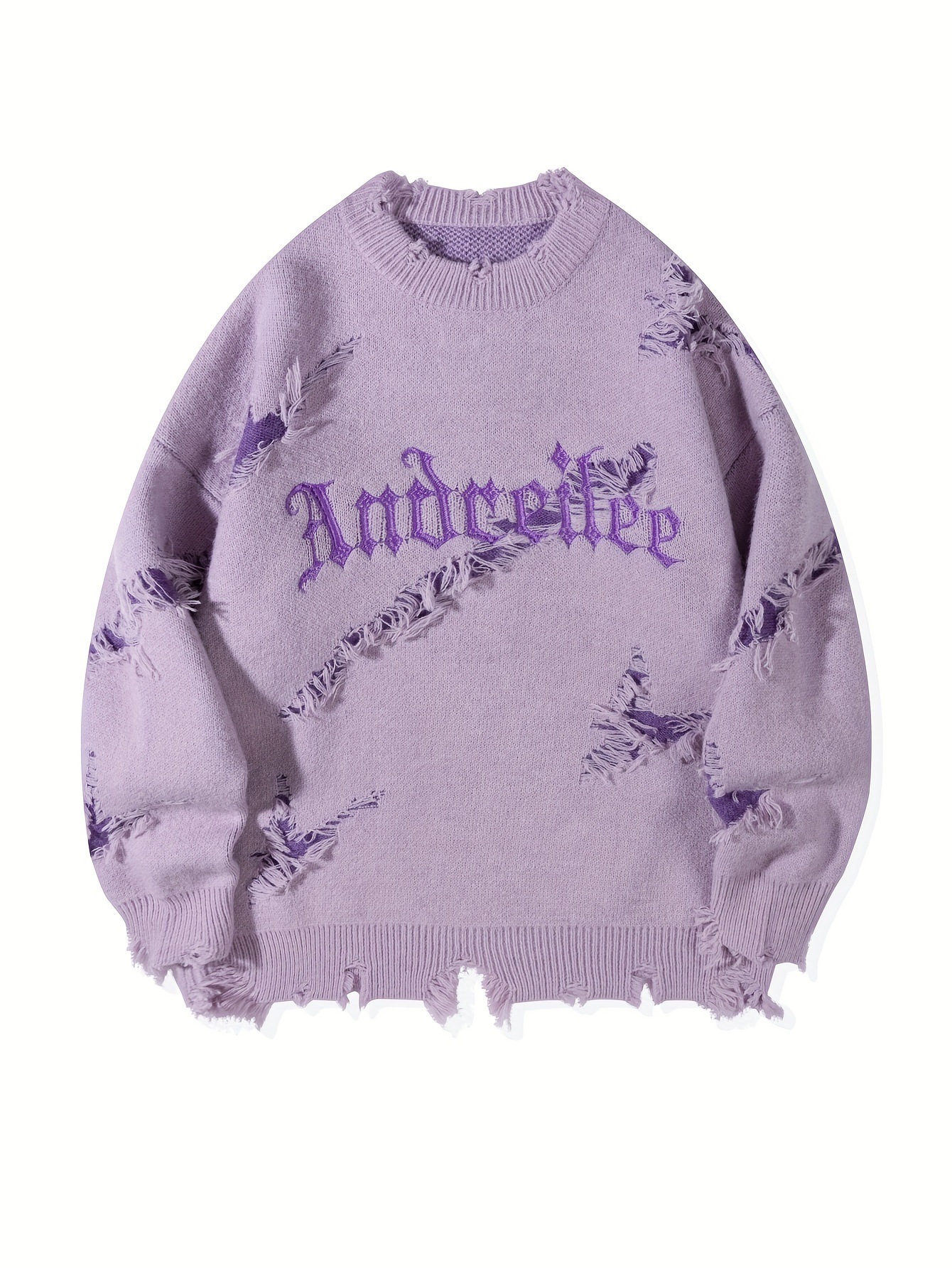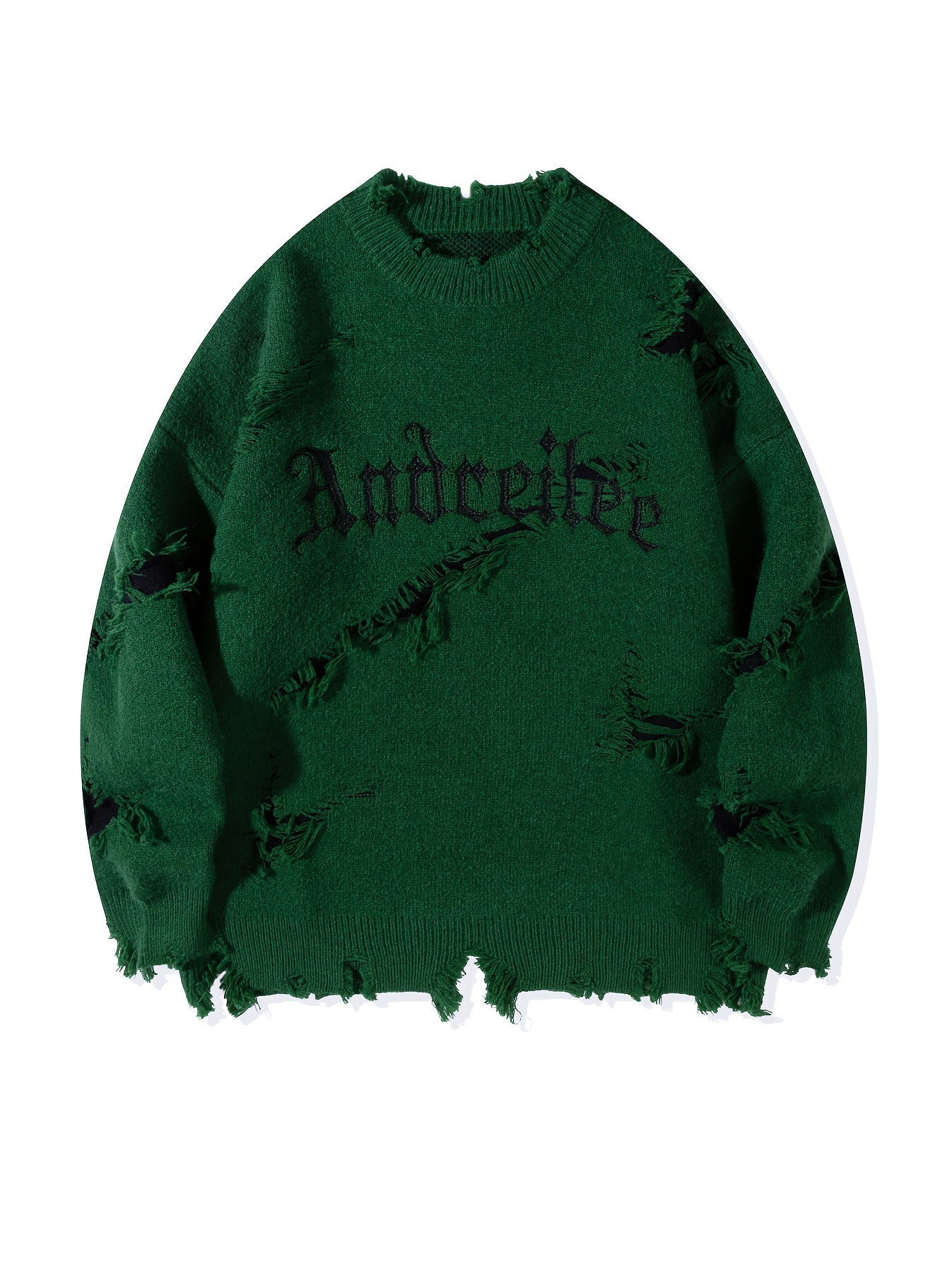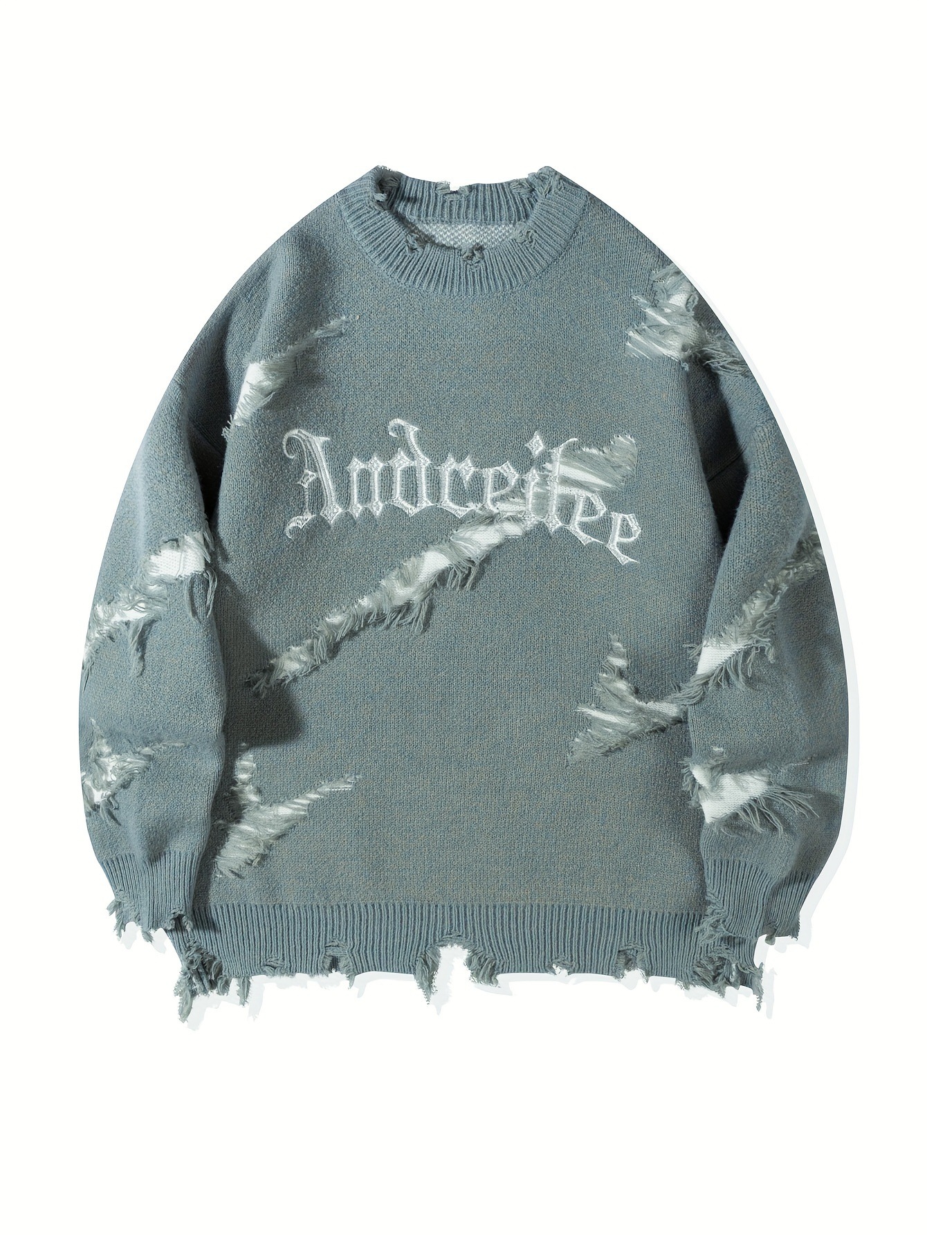 안드레 | 남성용 레트로 레터링 프린트 데미지 가공 가을 겨울 루즈핏 커플용 라운드넥 긴팔 니트 스웨터
