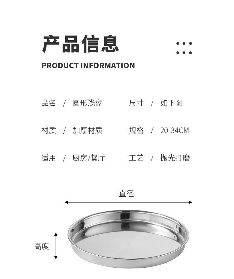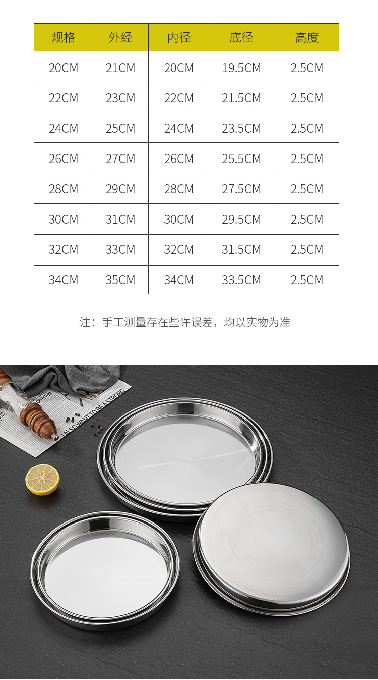 두꺼운 스테인레스 스틸 디스크 얕은 플레이트 쿨 가죽 트레이 라운드 퓨어 플랫 바닥 좁은 측면 스트레이트 대형 플레이트 접시