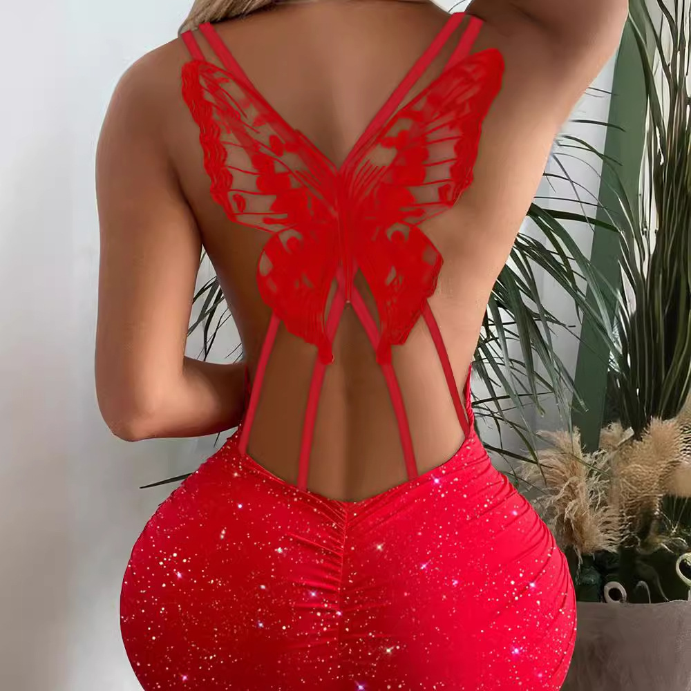 2024欧美跨境时尚后背蝴蝶镂空闪光弹力连衣裙