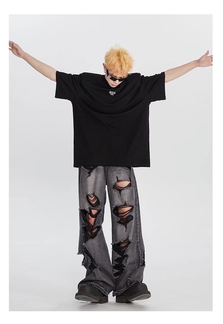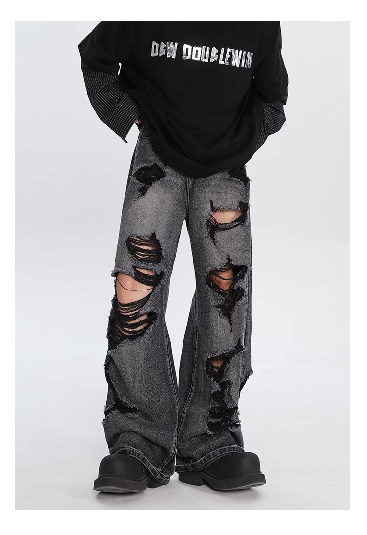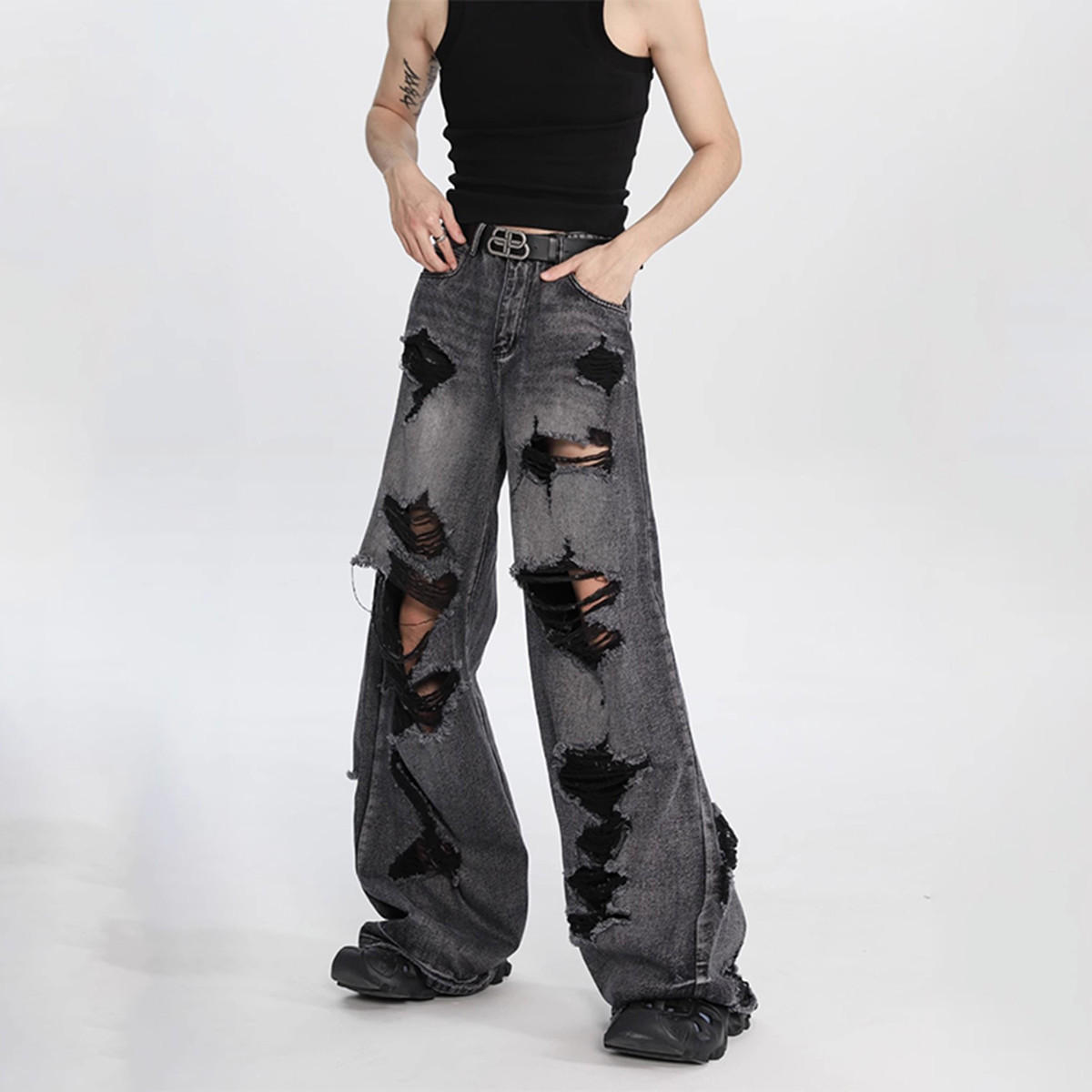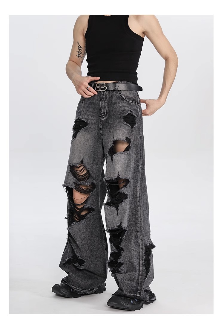아메리칸 스타일 하이 스트리트 틈새 디자인 센스 슈퍼 파이어 홀 바지 남성 봄과 가을 새로운 Ins 다크 스타일 데님 넓은 다리 바지스토어 가기