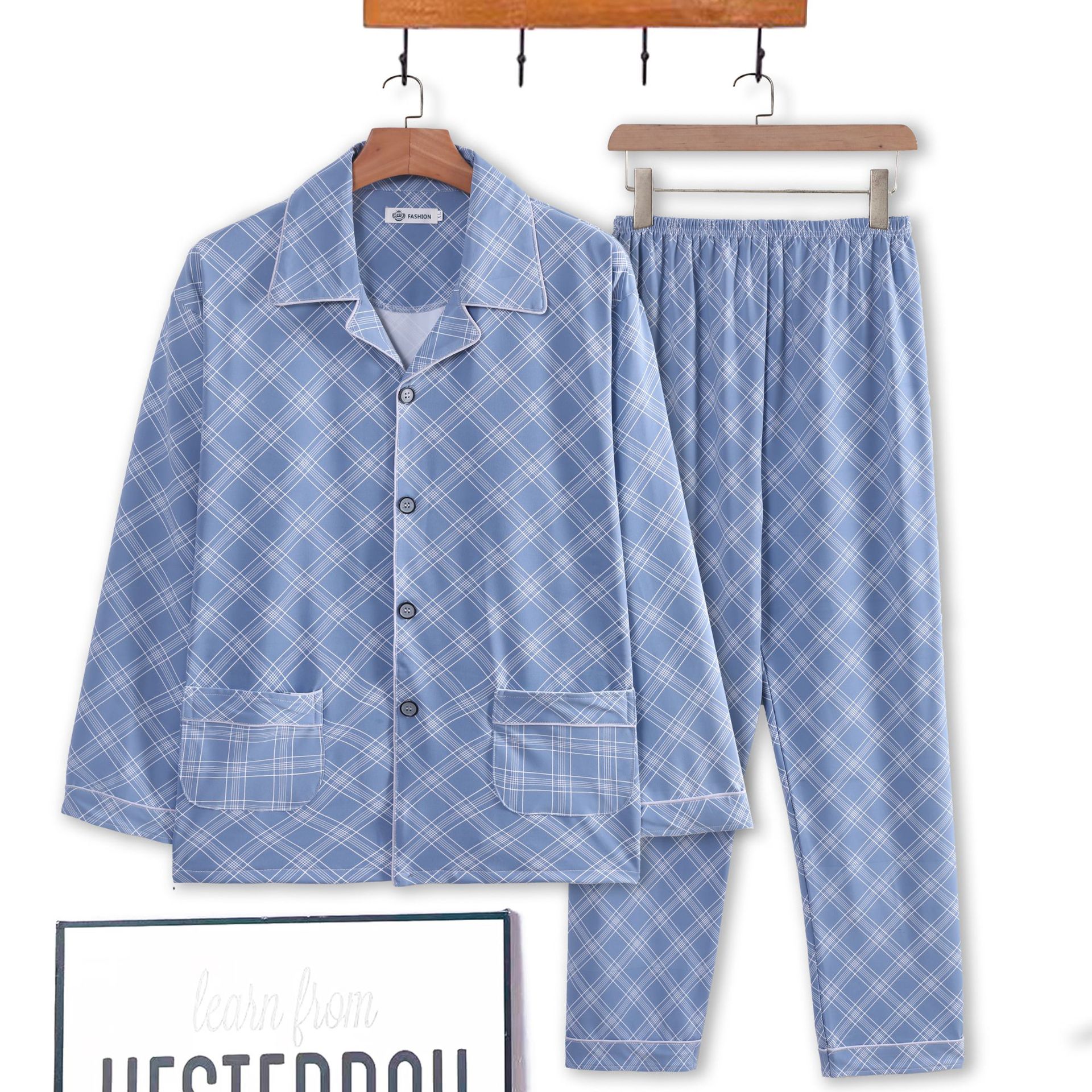 새로운 잠옷 남자의 양면 우유 실크 긴 소매 얇은 남자의 회색 만화 느슨한 플러스 사이즈 홈 옷 세트스토어 가기
