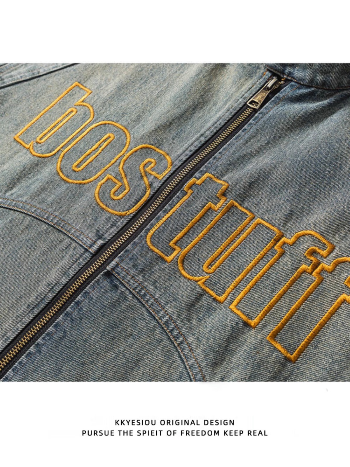 세탁 된 그레이 칼라 데님 재킷 남자 봄 레트로 트렌디 브랜드 지퍼 자수 재킷 미국식 해링턴 재킷스토어 가기