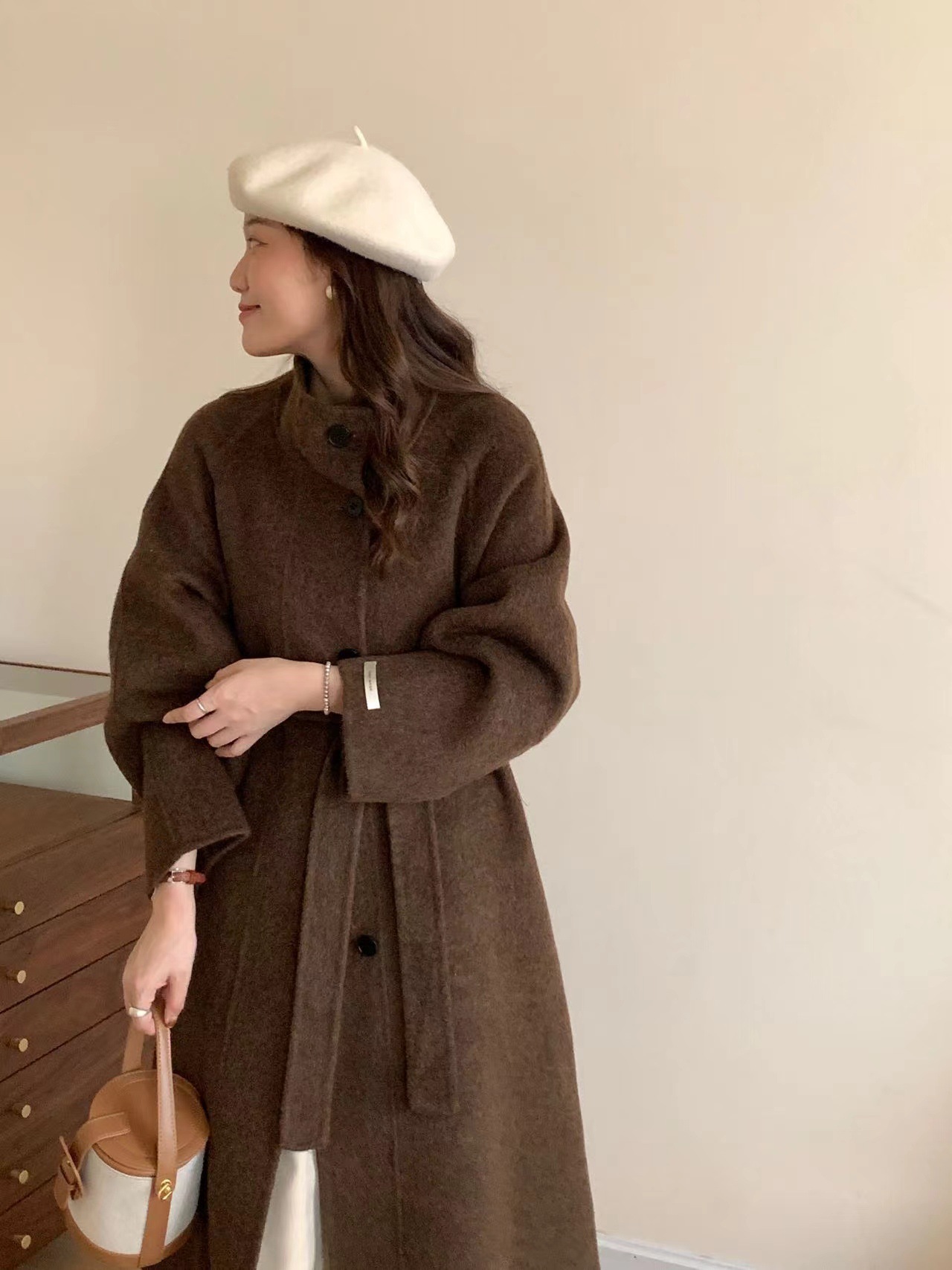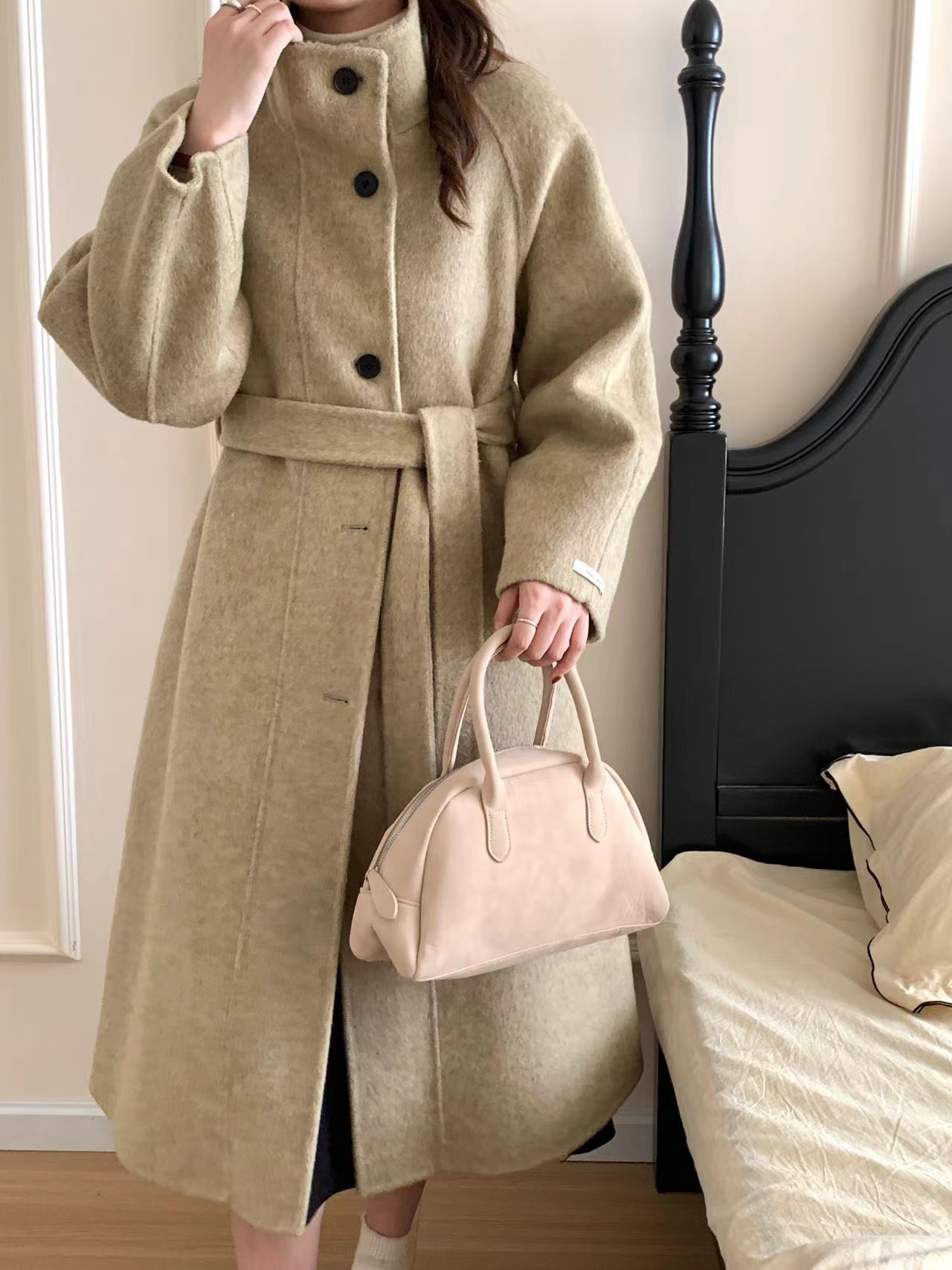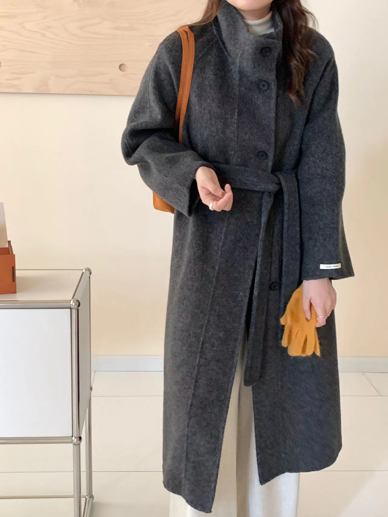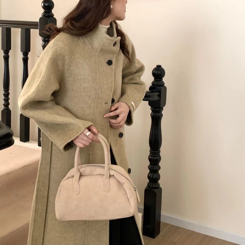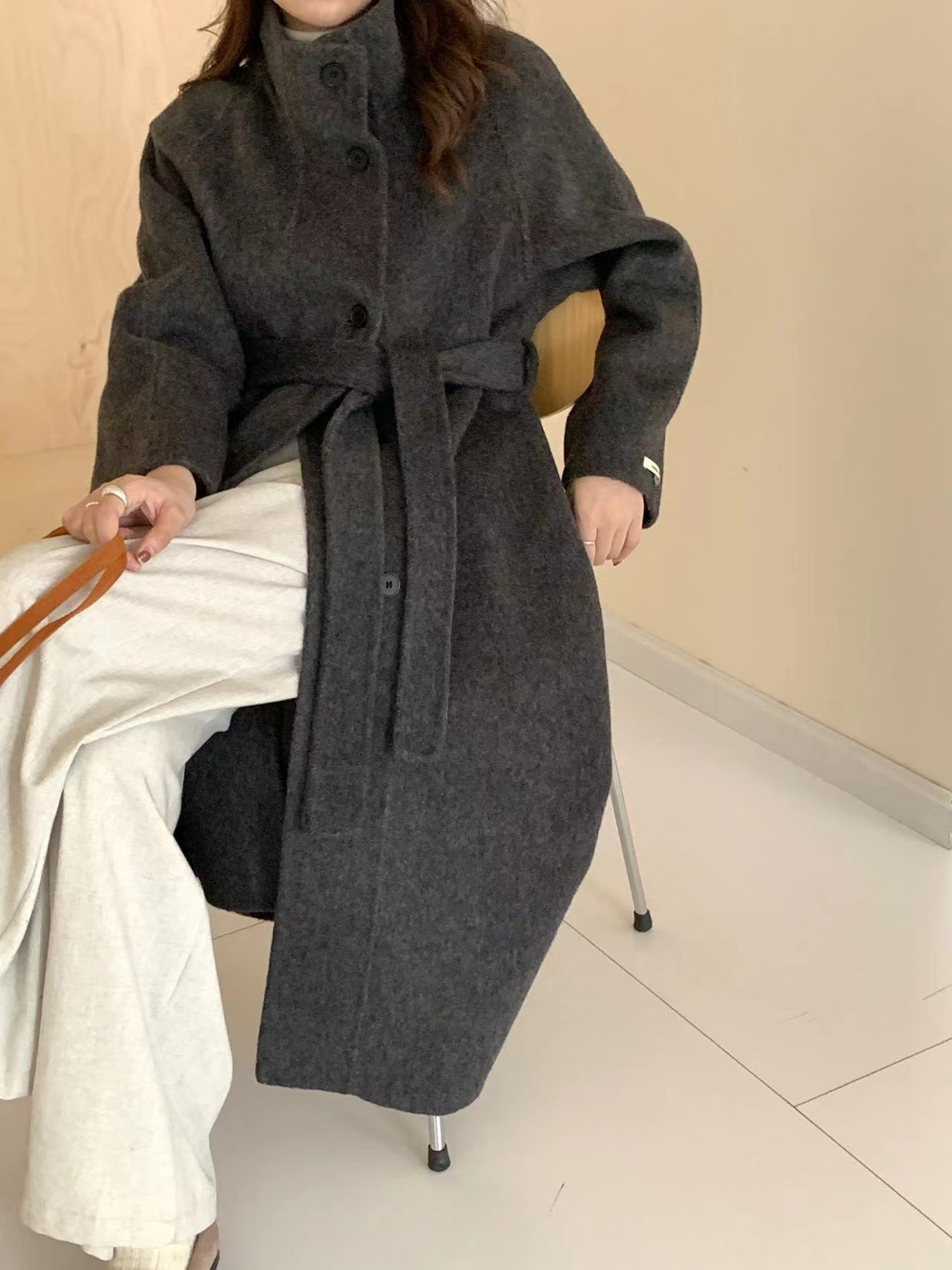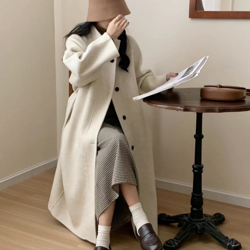 한국 스타일의 카라, 싱글 브레스트, 레이스업, 양면 울 코트, 루즈한 한국 스타일 모직 코트, 가을 겨울 신상 스타일