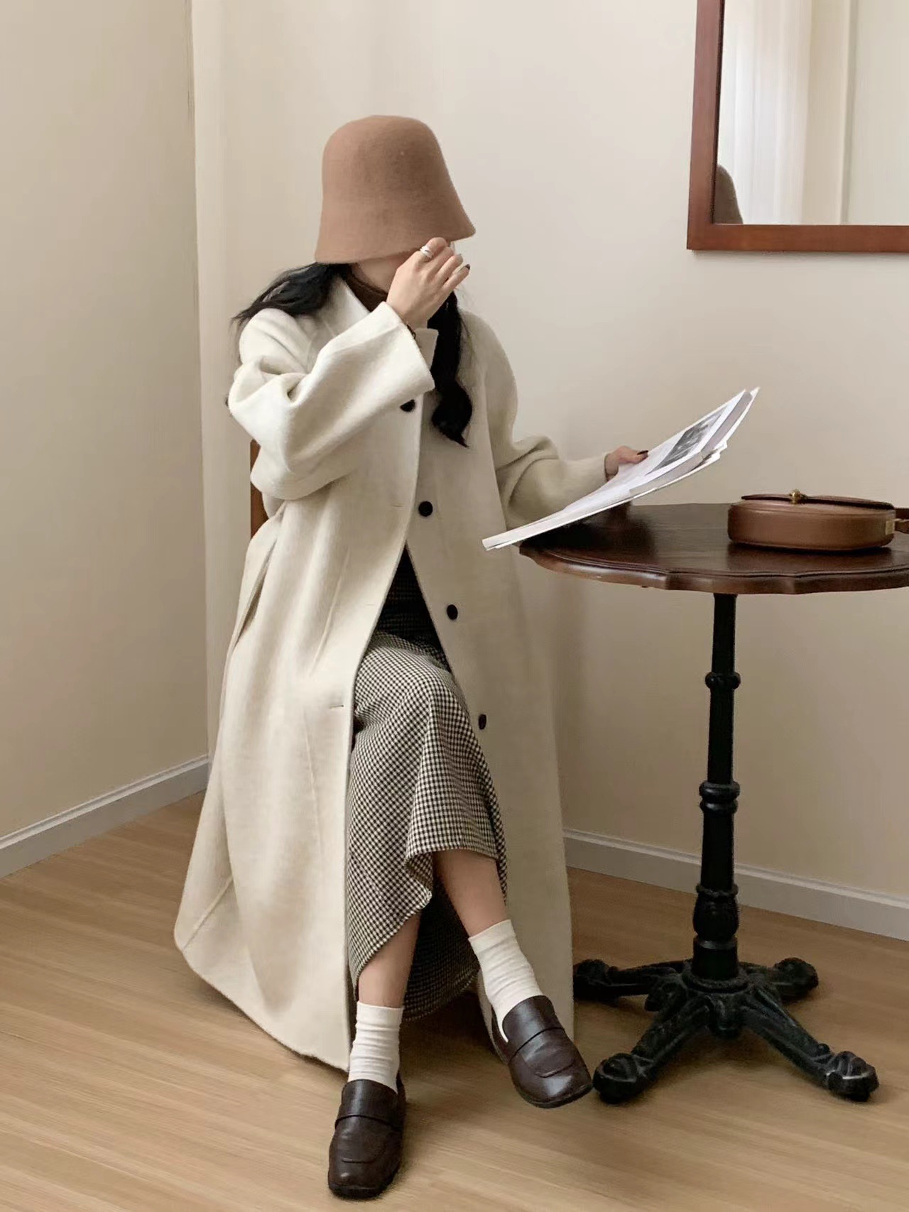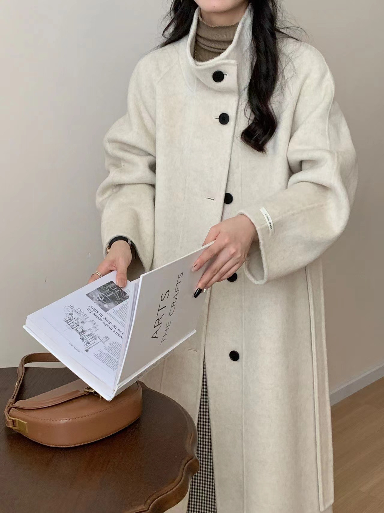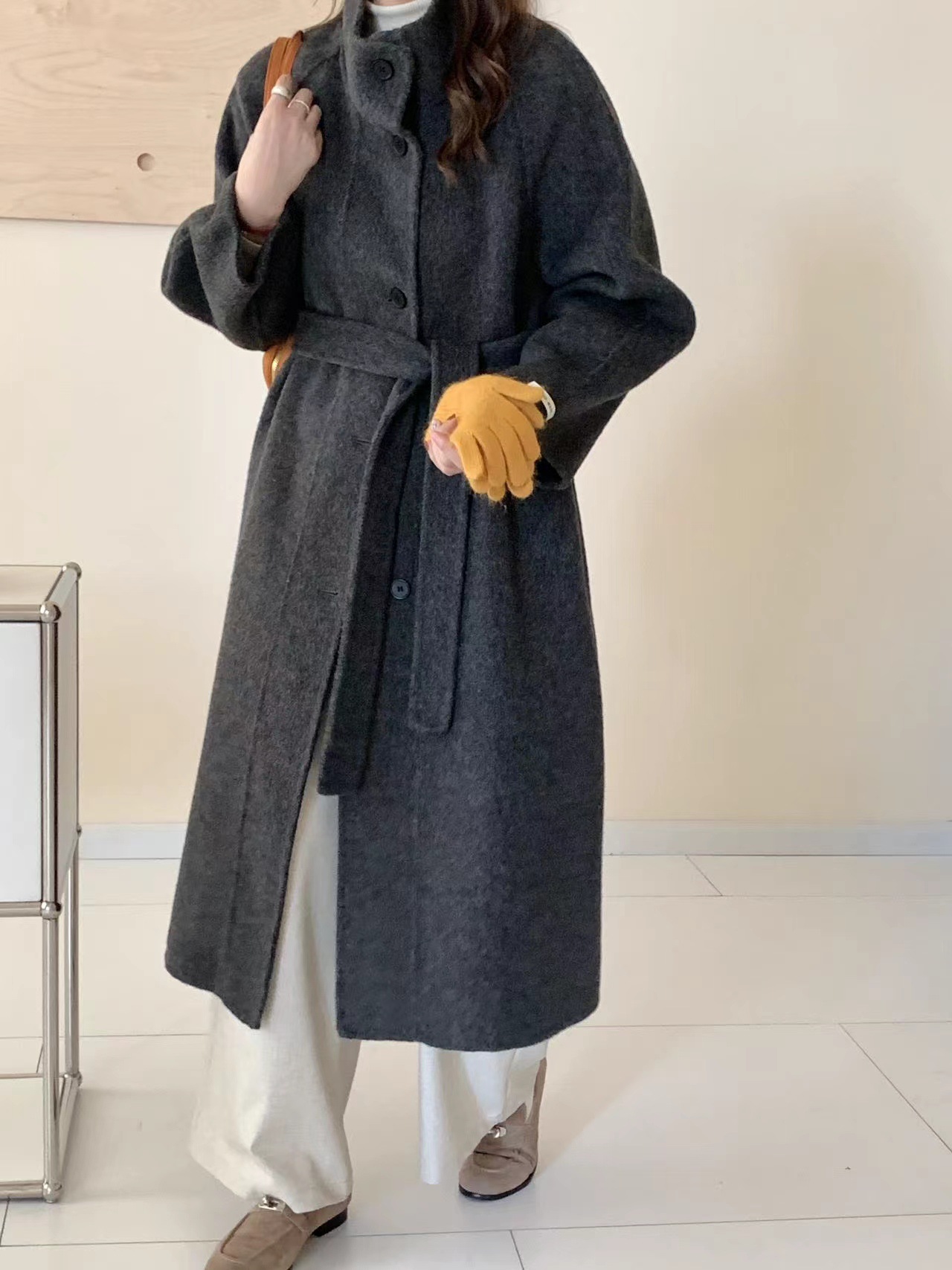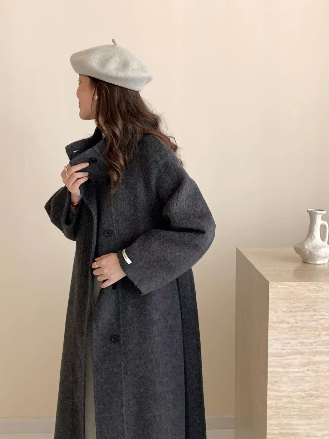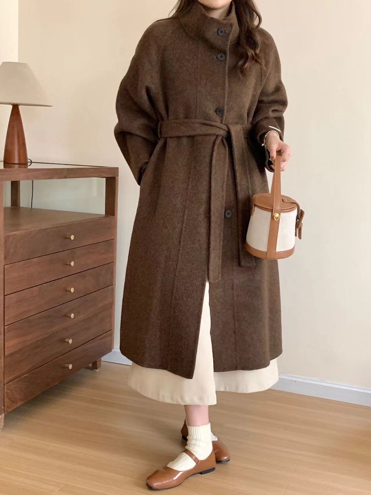 한국 스타일의 카라, 싱글 브레스트, 레이스업, 양면 울 코트, 루즈한 한국 스타일 모직 코트, 가을 겨울 신상 스타일