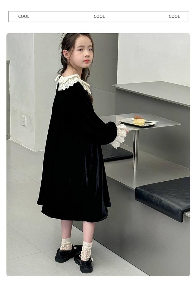 소녀의 가을 2024 새로운 한국 스타일 복고풍 단색 느슨한 공주 원피스 큰 어린이 중공 레이스 칼라 원피스