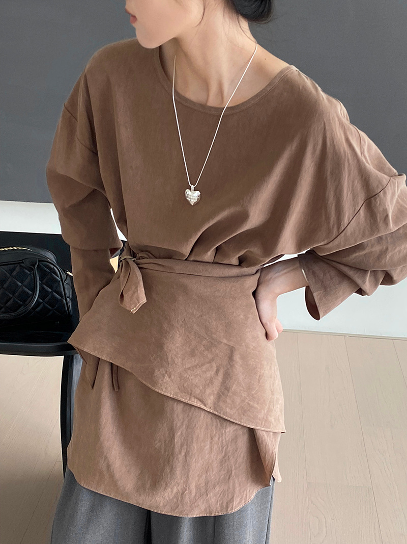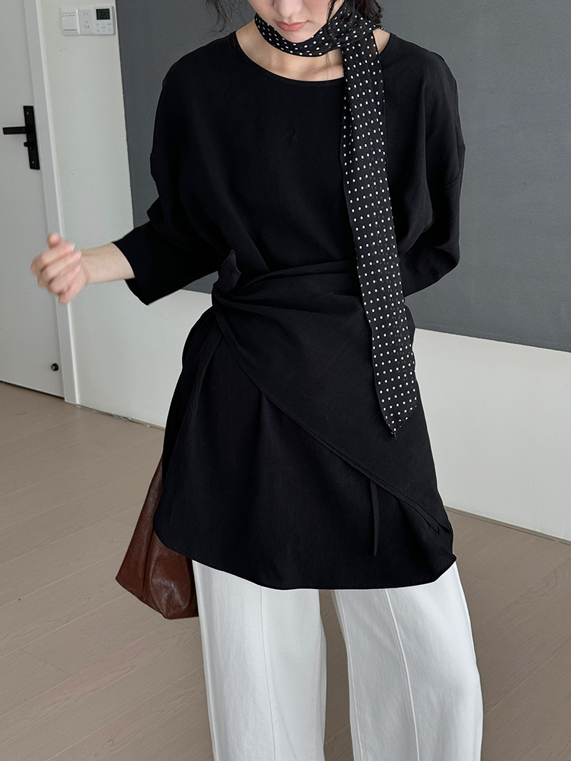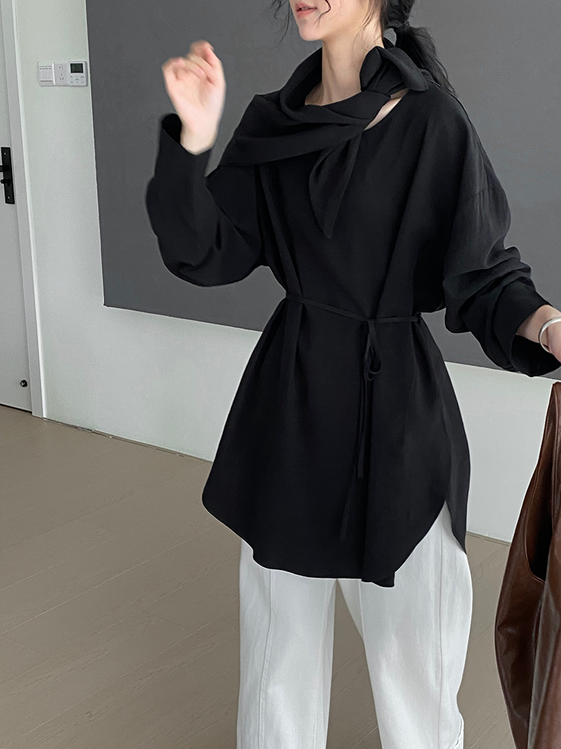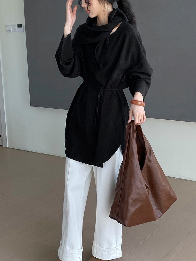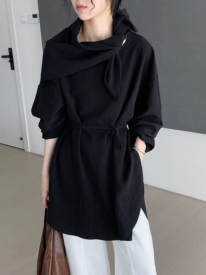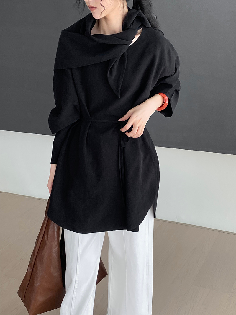 【특가 상품, 반품/교환 불가】나모 라운드넥 루즈핏 셔츠, 허리끈 셔츠, 동일 색상 스카프 포함 2133