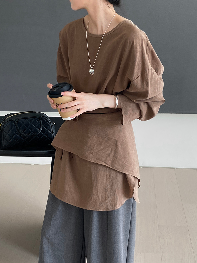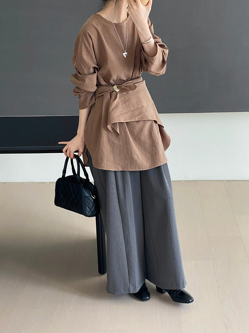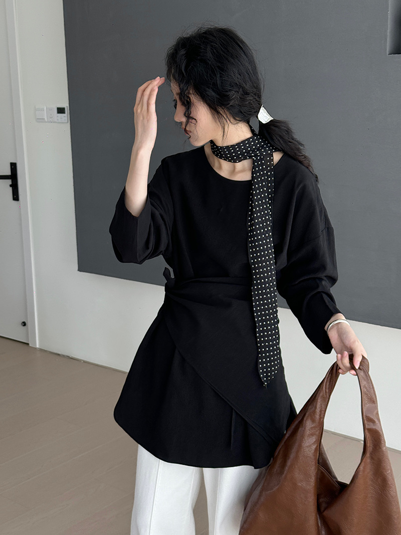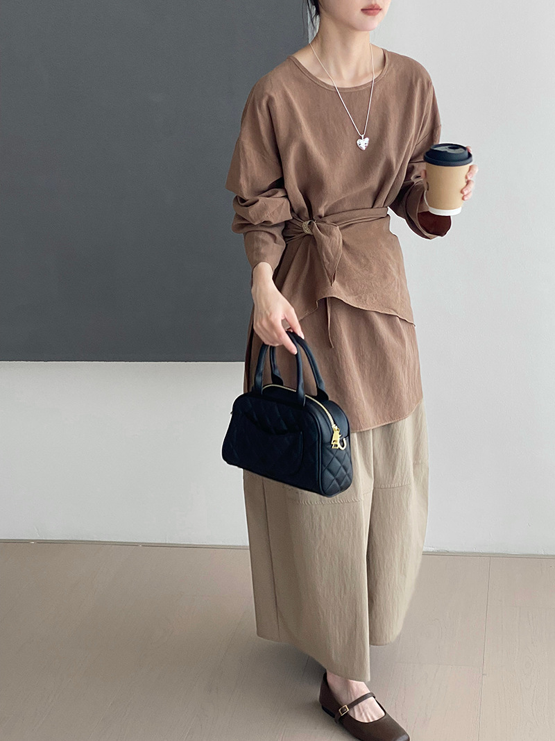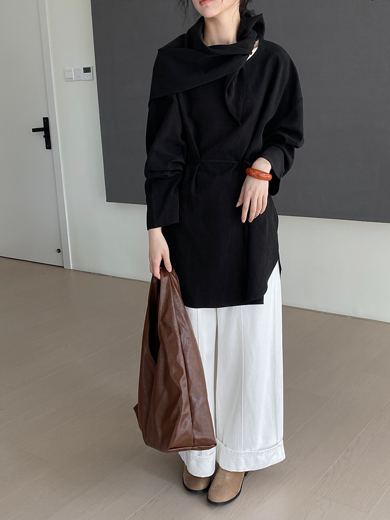 【특가 상품, 반품/교환 불가】나모 라운드넥 루즈핏 셔츠, 허리끈 셔츠, 동일 색상 스카프 포함 2133
