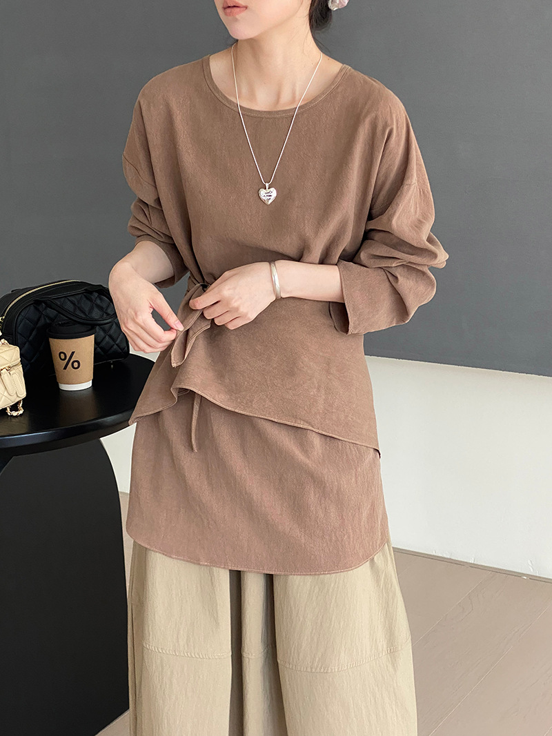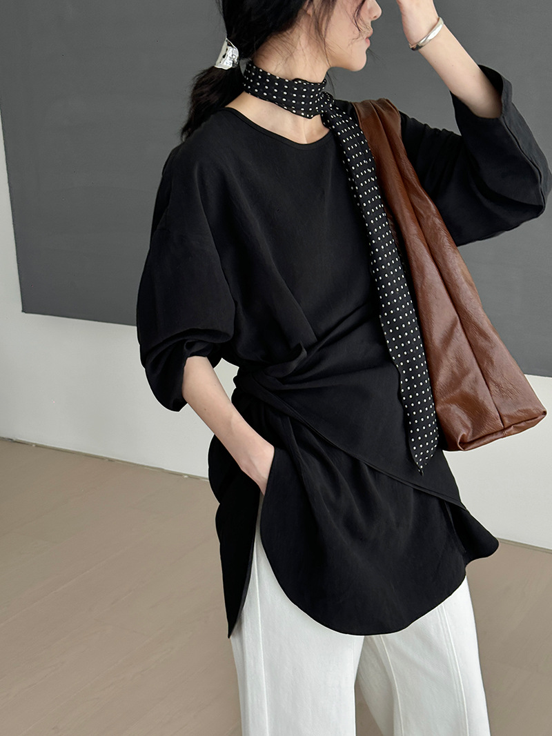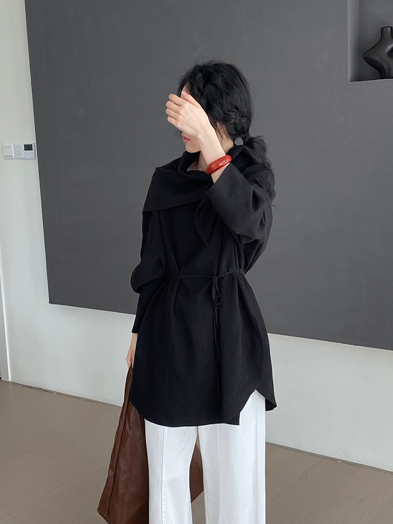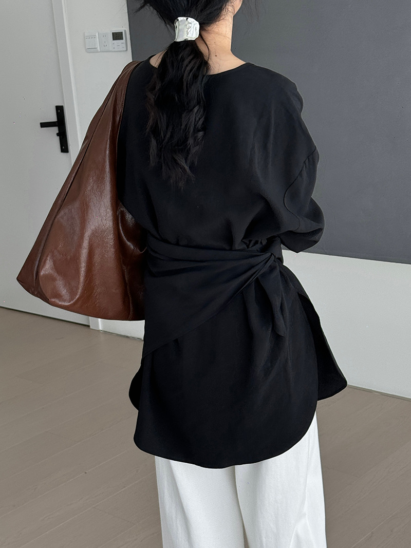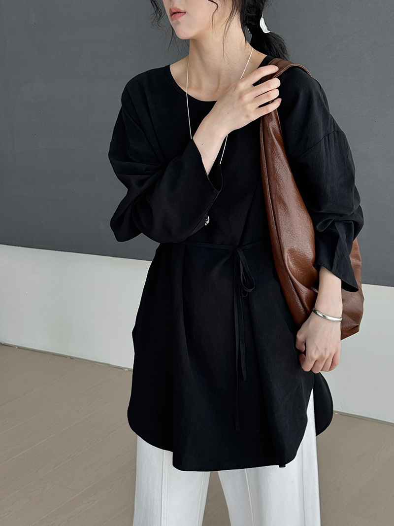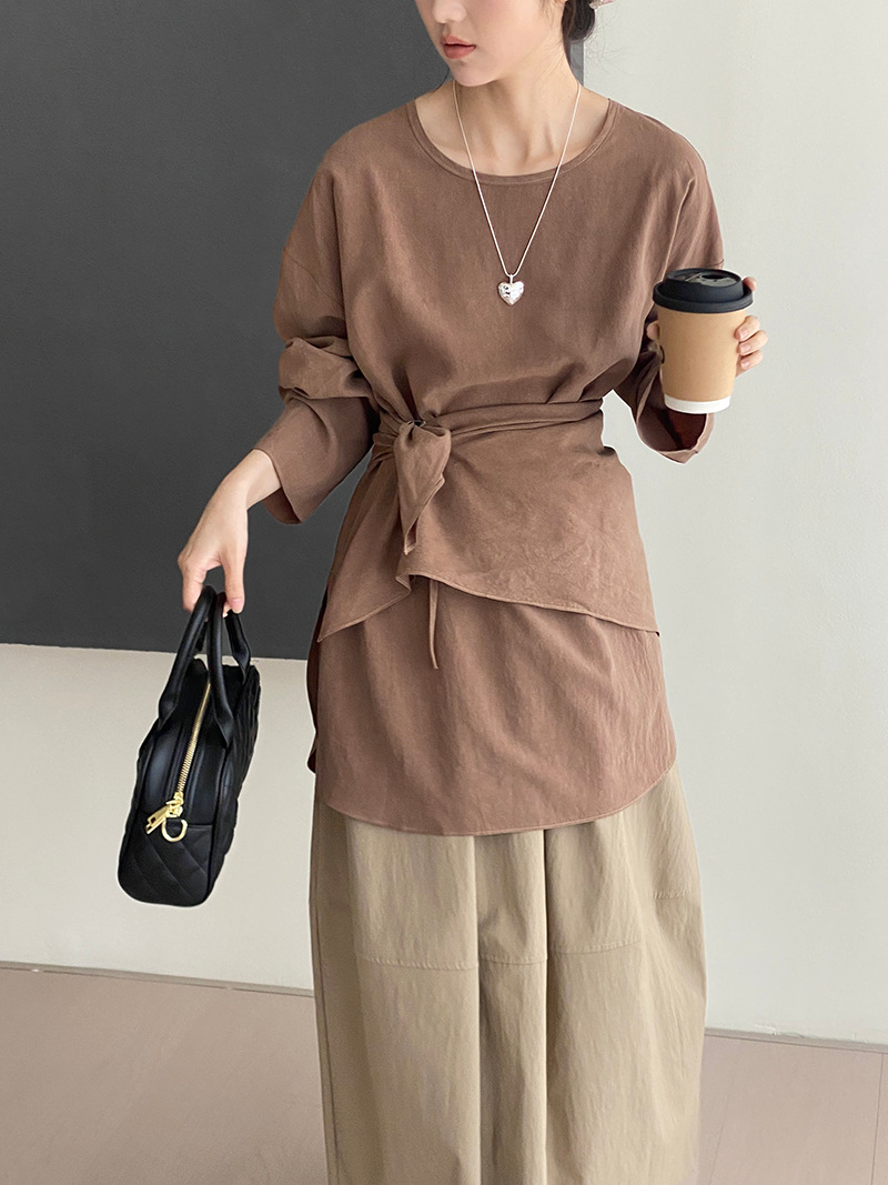 【특가 상품, 반품/교환 불가】나모 라운드넥 루즈핏 셔츠, 허리끈 셔츠, 동일 색상 스카프 포함 2133