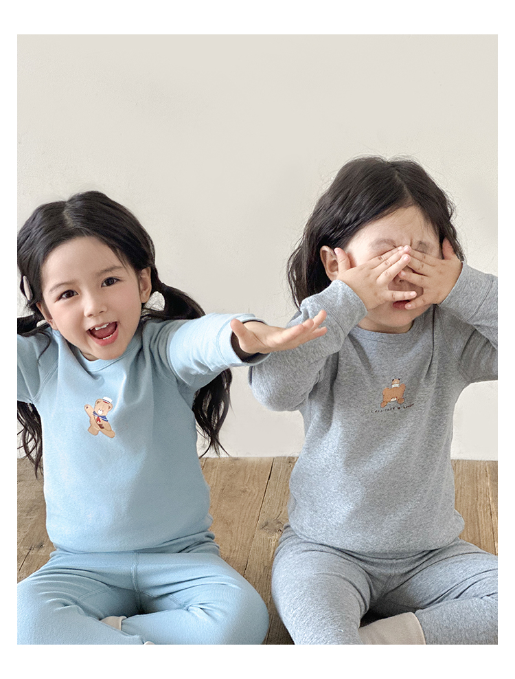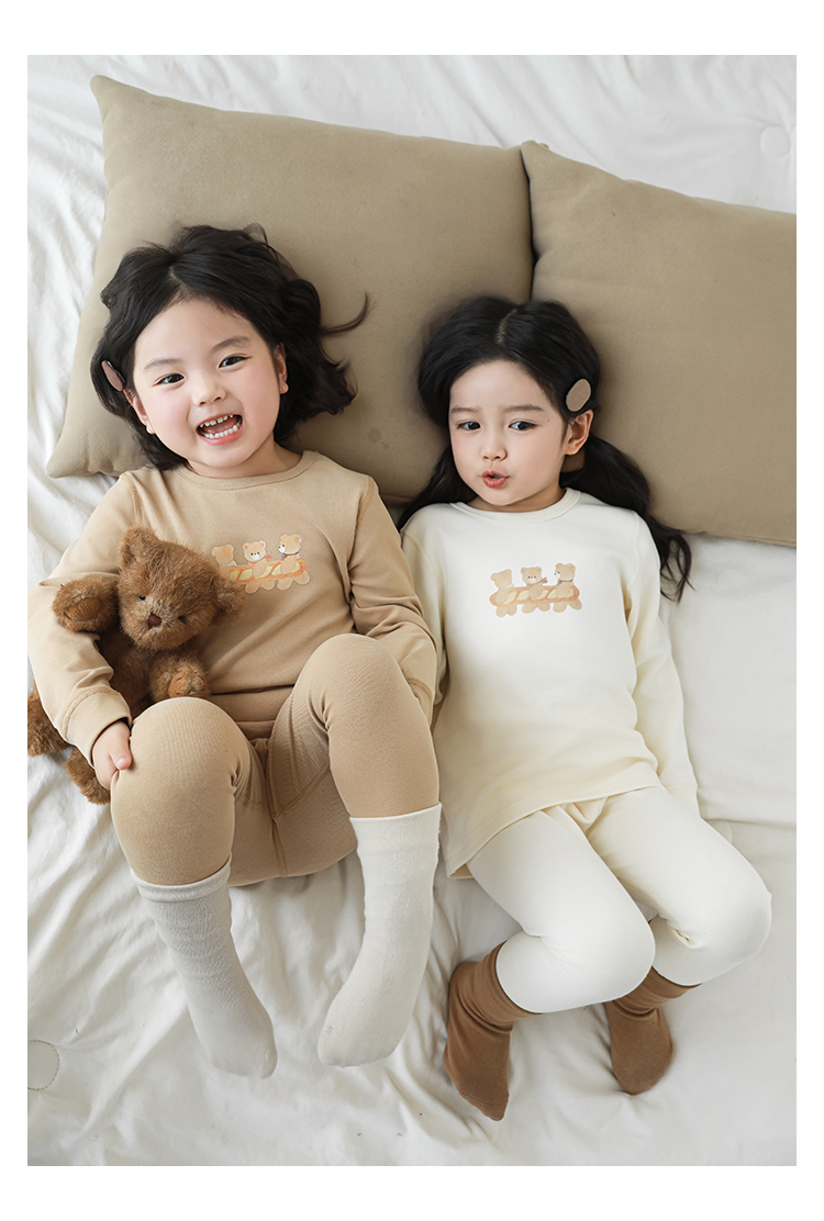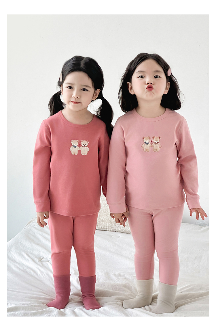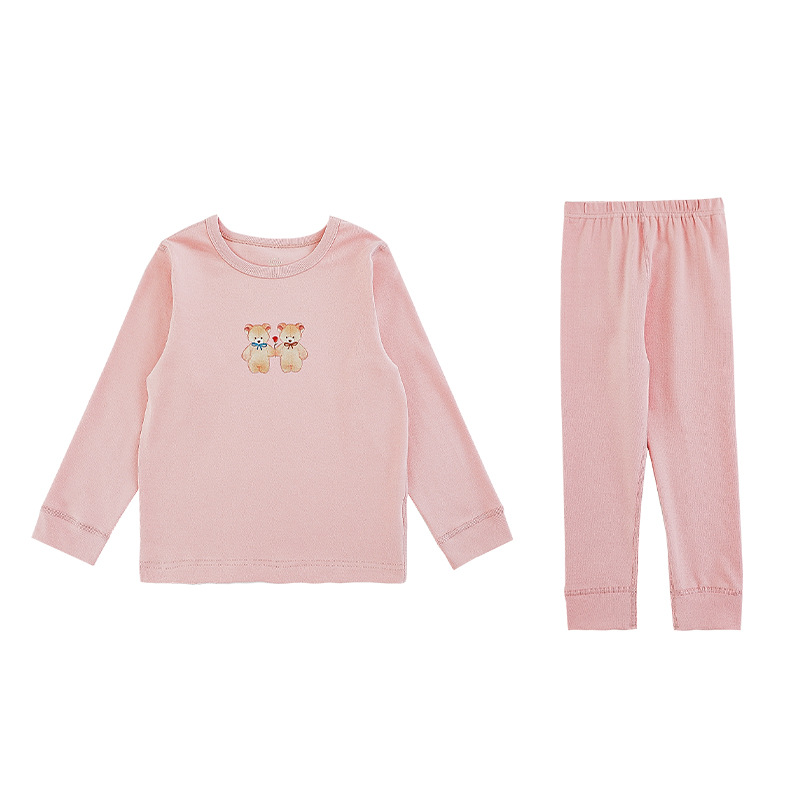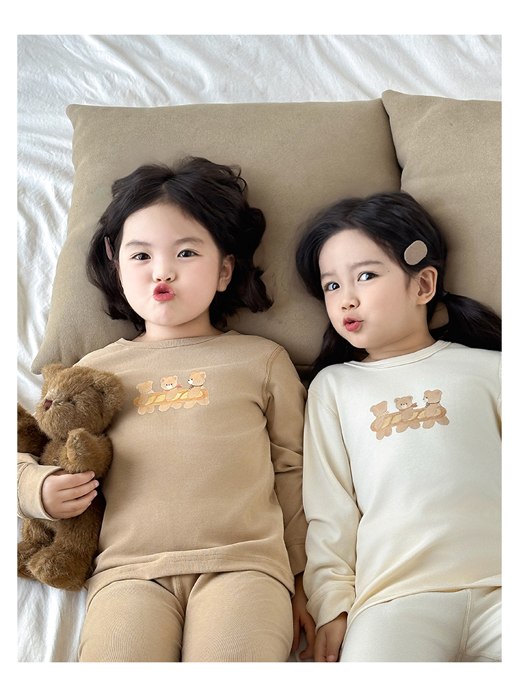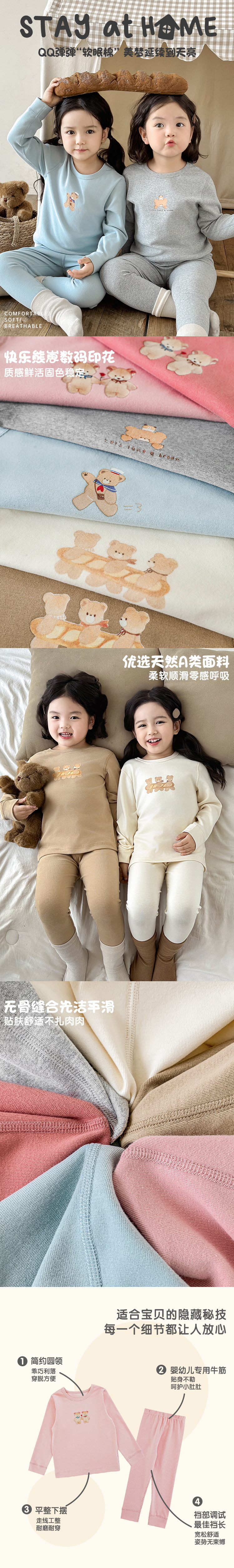 Wurib Girl's Happy Bear Cub 인쇄 홈 의류 세트 가을 귀엽고 깔끔한 라운드 넥 파자마 2 피스 세트