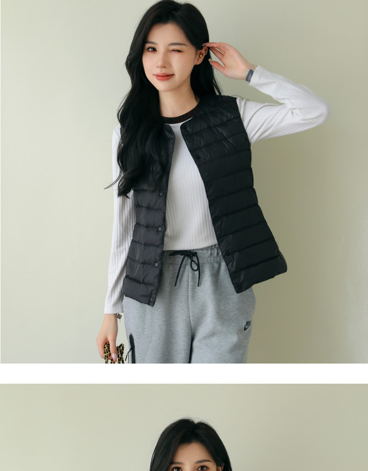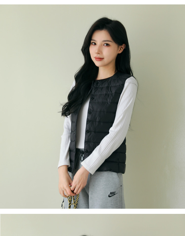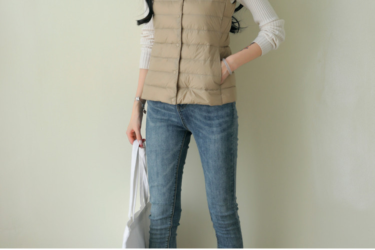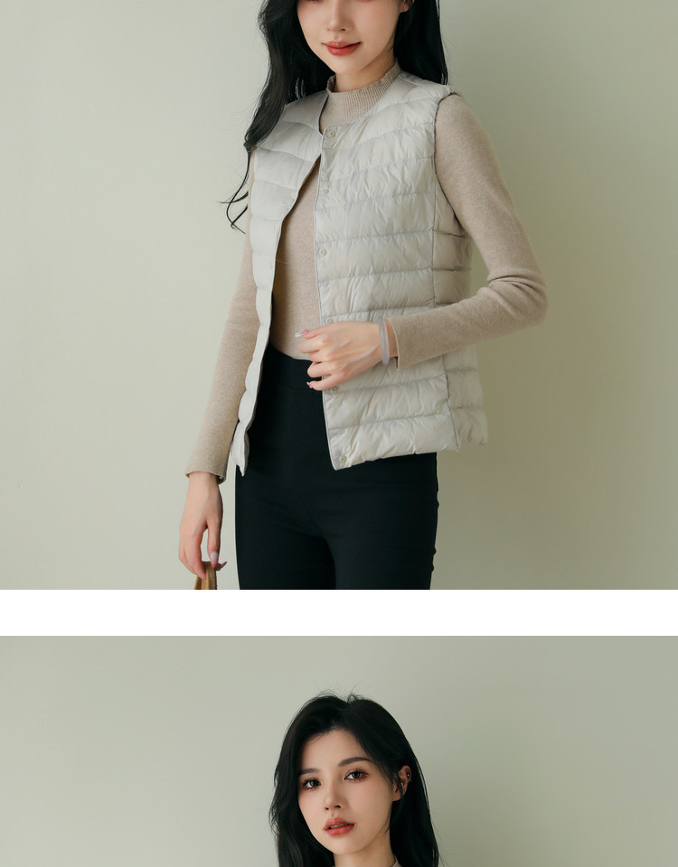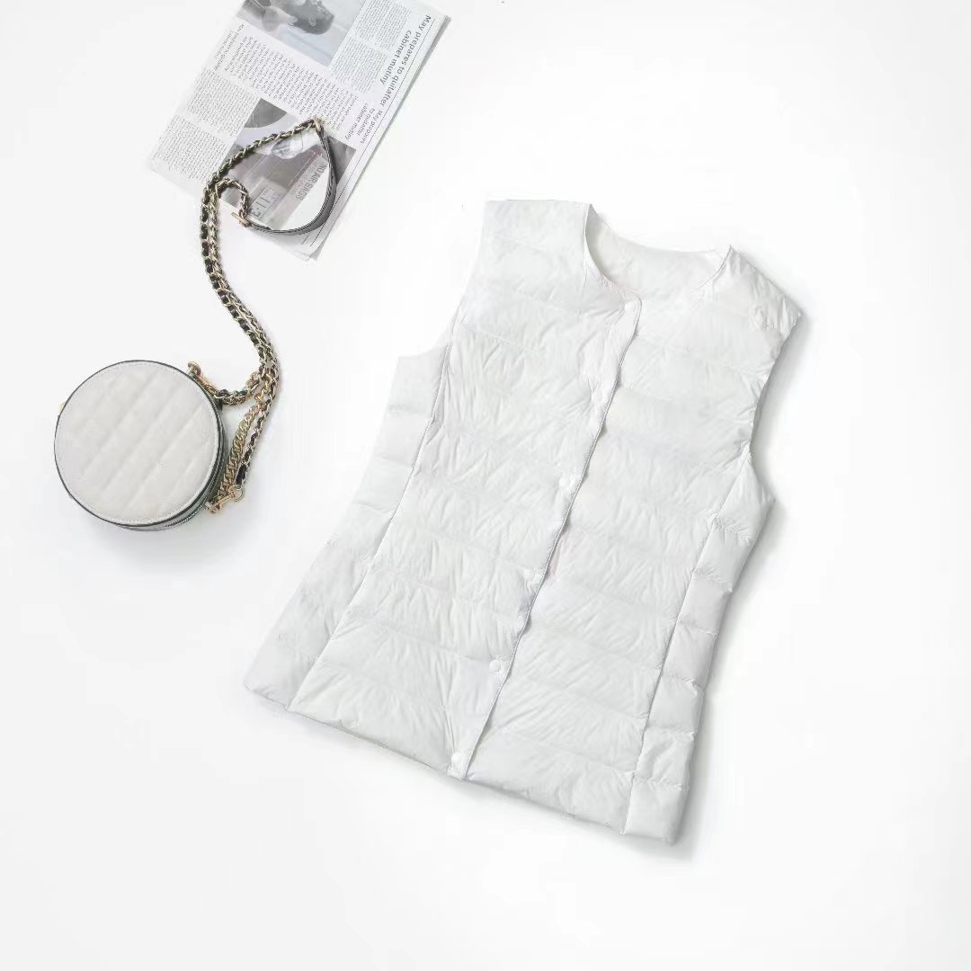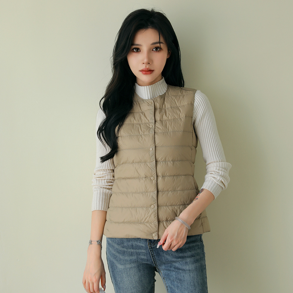 핑후 가을과 겨울 여성의 경량 라운드 넥 다운 라이너 조끼 따뜻한 화이트 오리 다운 조끼 솔리드 컬러 슬림 핏 웨이스트 코트