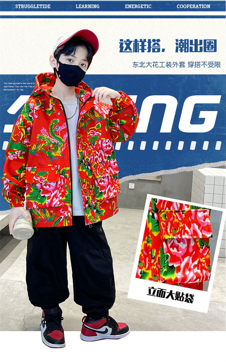소년 후드 재킷 봄과 가을 스타일 Northeastern 꽃무늬 작업 재킷 큰 어린이 2025 새로운 인터넷 연예인 잘 생긴 윈드 브레이커