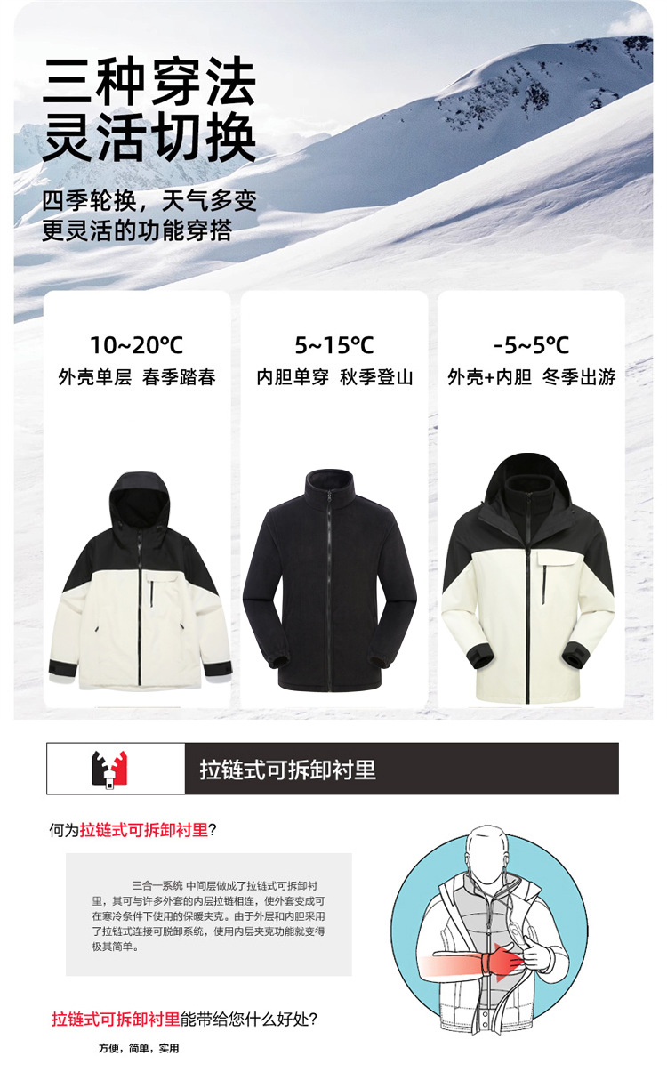 조류 충전 야외 충전 옷 3 대 1 3 층 접착 남성 및 여성 방풍 방수 따뜻한 탈착식 재킷