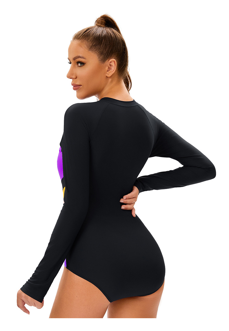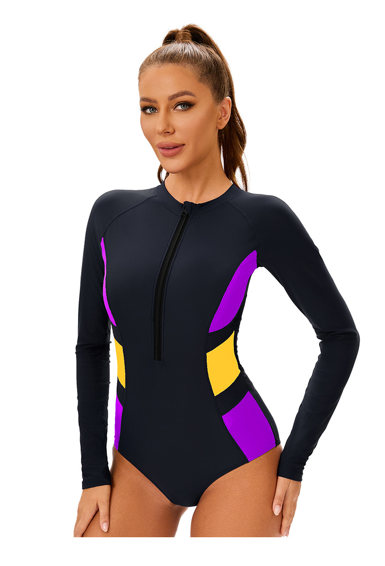 아마존 컬러 블록 긴팔 선 스크린 지퍼 서퍼 유럽과 미국의 섹시한 타이트 수영복 여성 보수적 인 라운드 넥 수영복