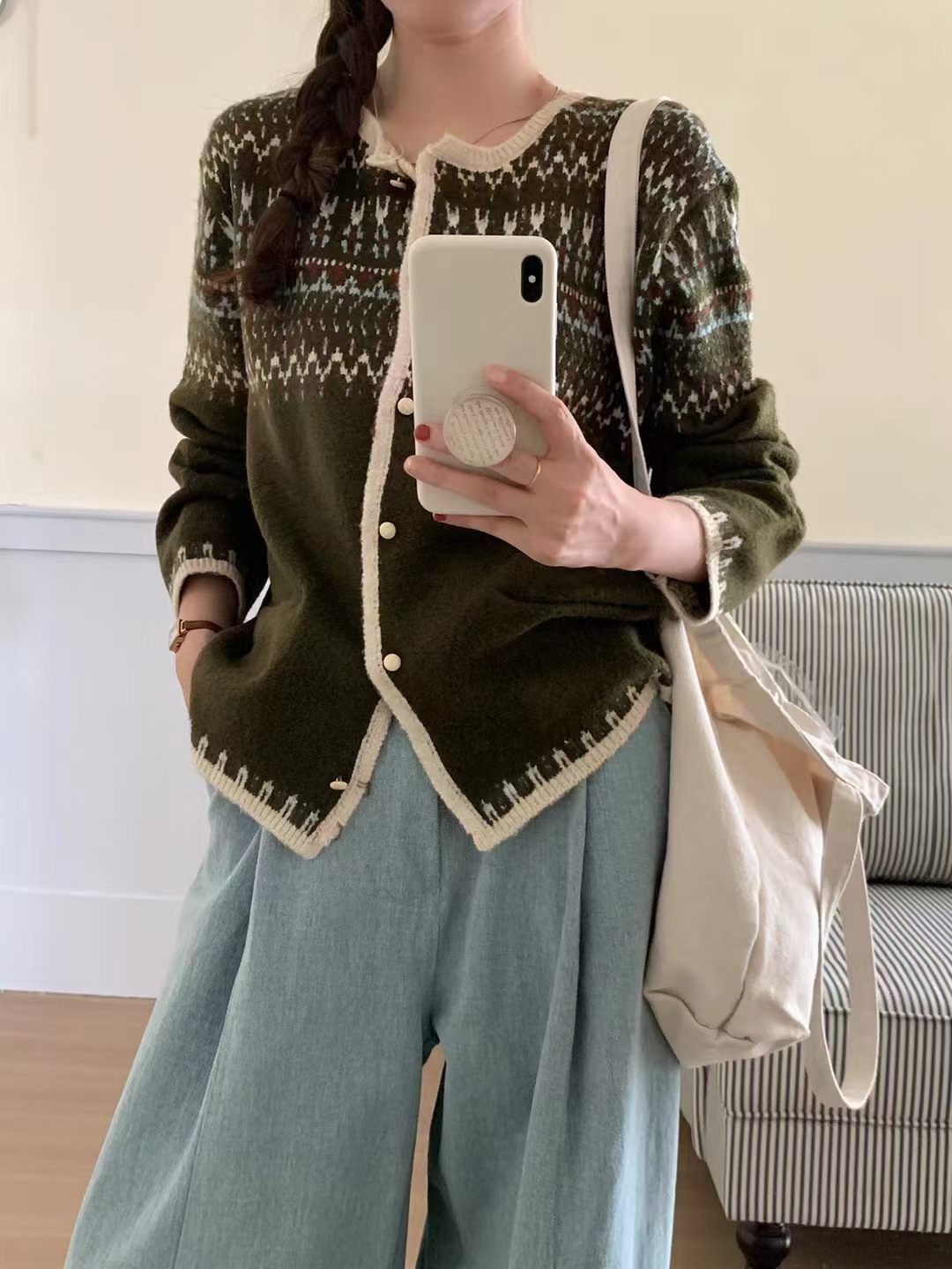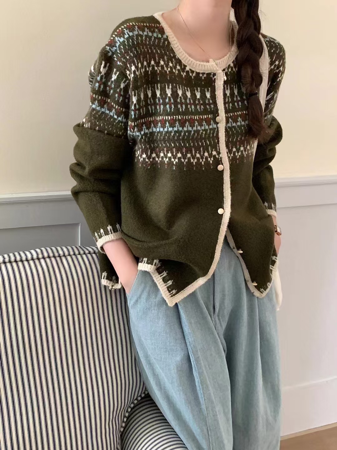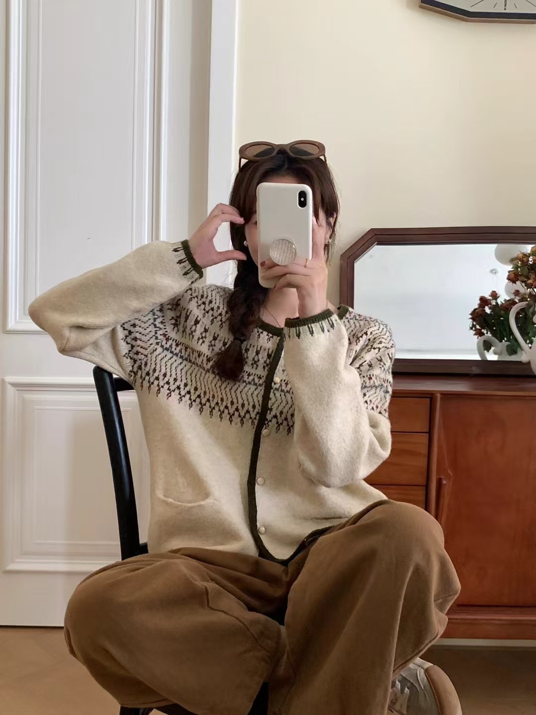 예술적 레트로 스타일 디자인 센스 자카드 니트 카디건 여성 초가을 새 라운드 넥 대조 컬러 게으른 느슨한 니트 스웨터