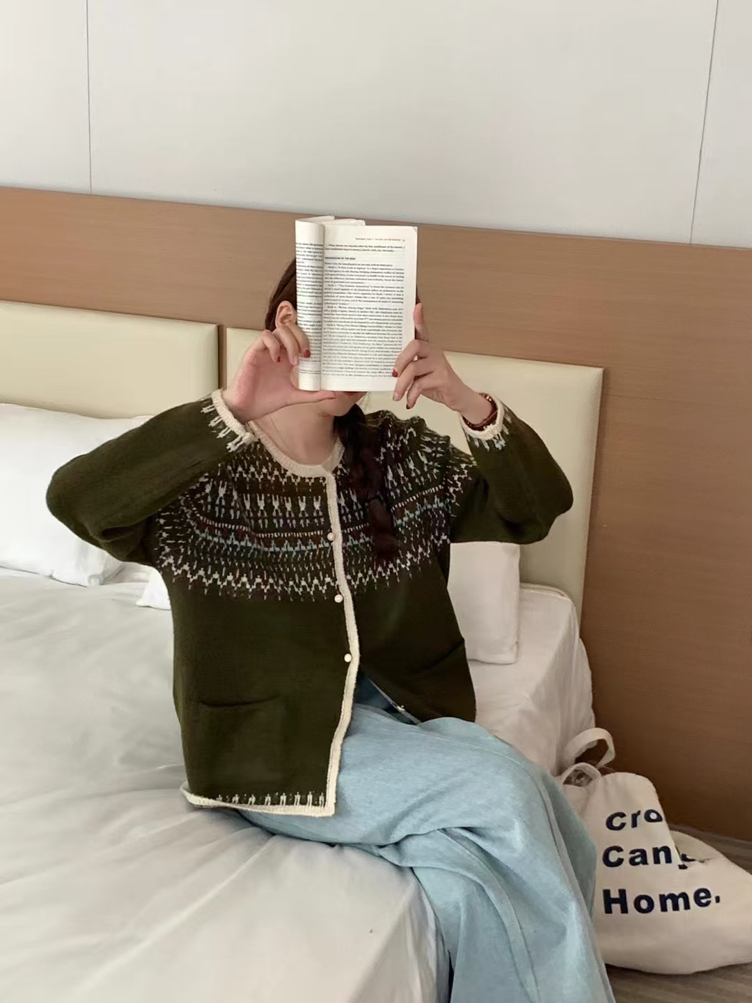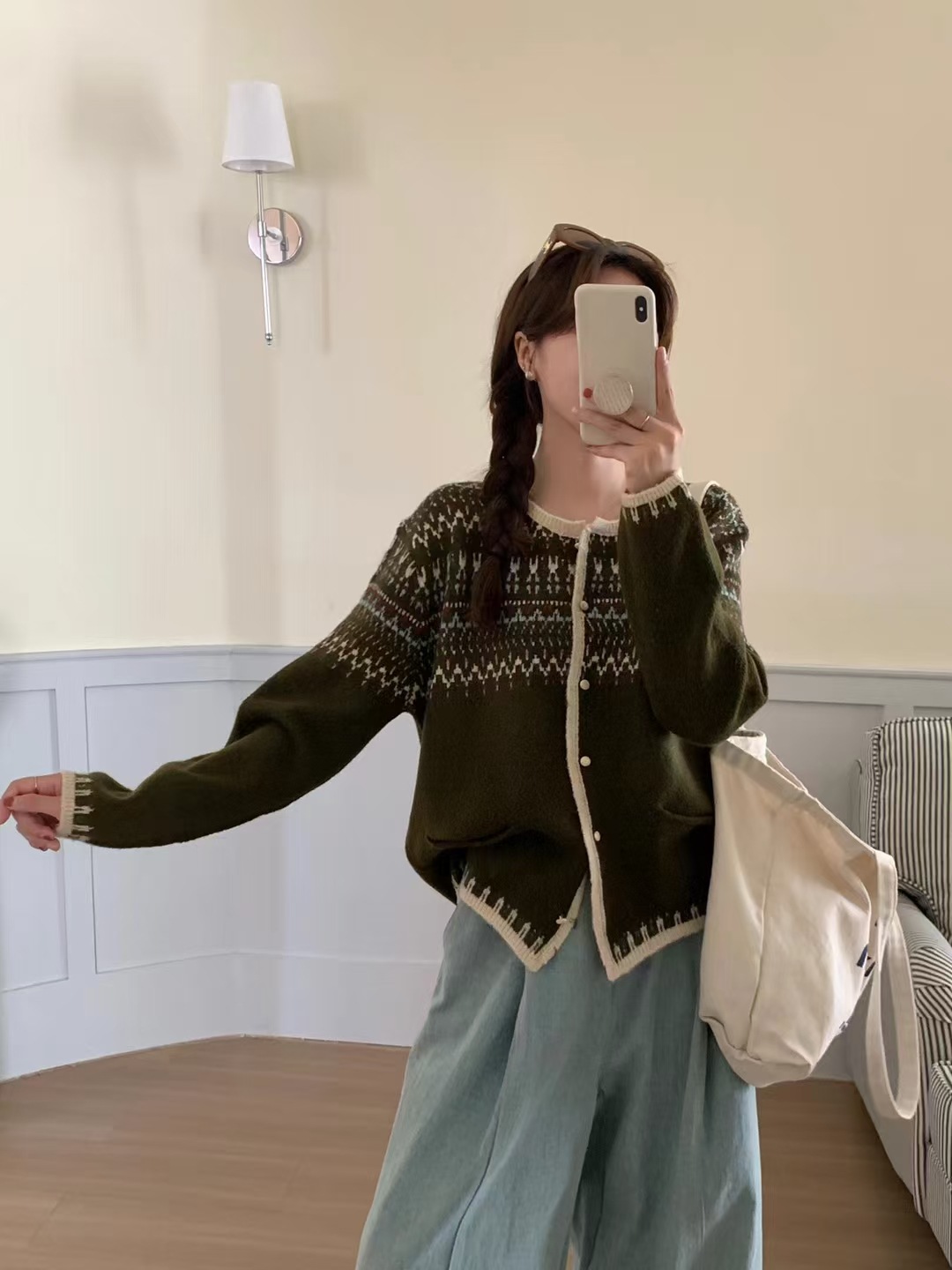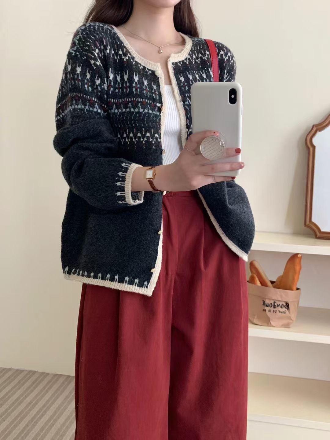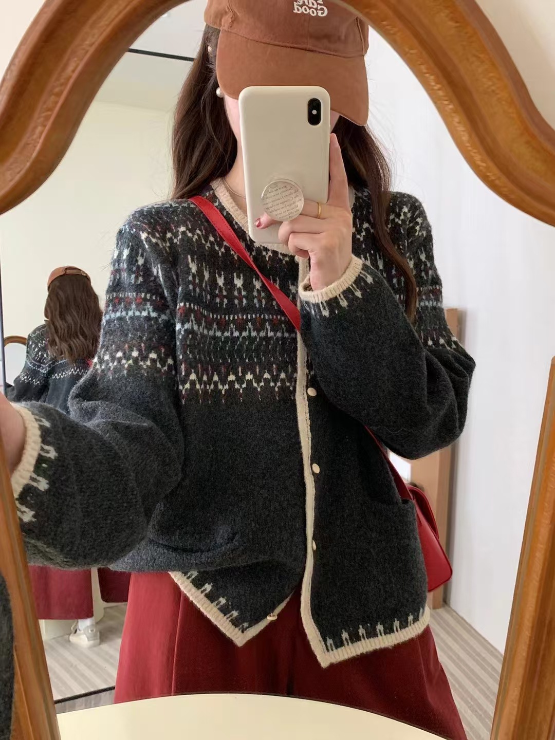 예술적 레트로 스타일 디자인 센스 자카드 니트 카디건 여성 초가을 새 라운드 넥 대조 컬러 게으른 느슨한 니트 스웨터스토어 가기