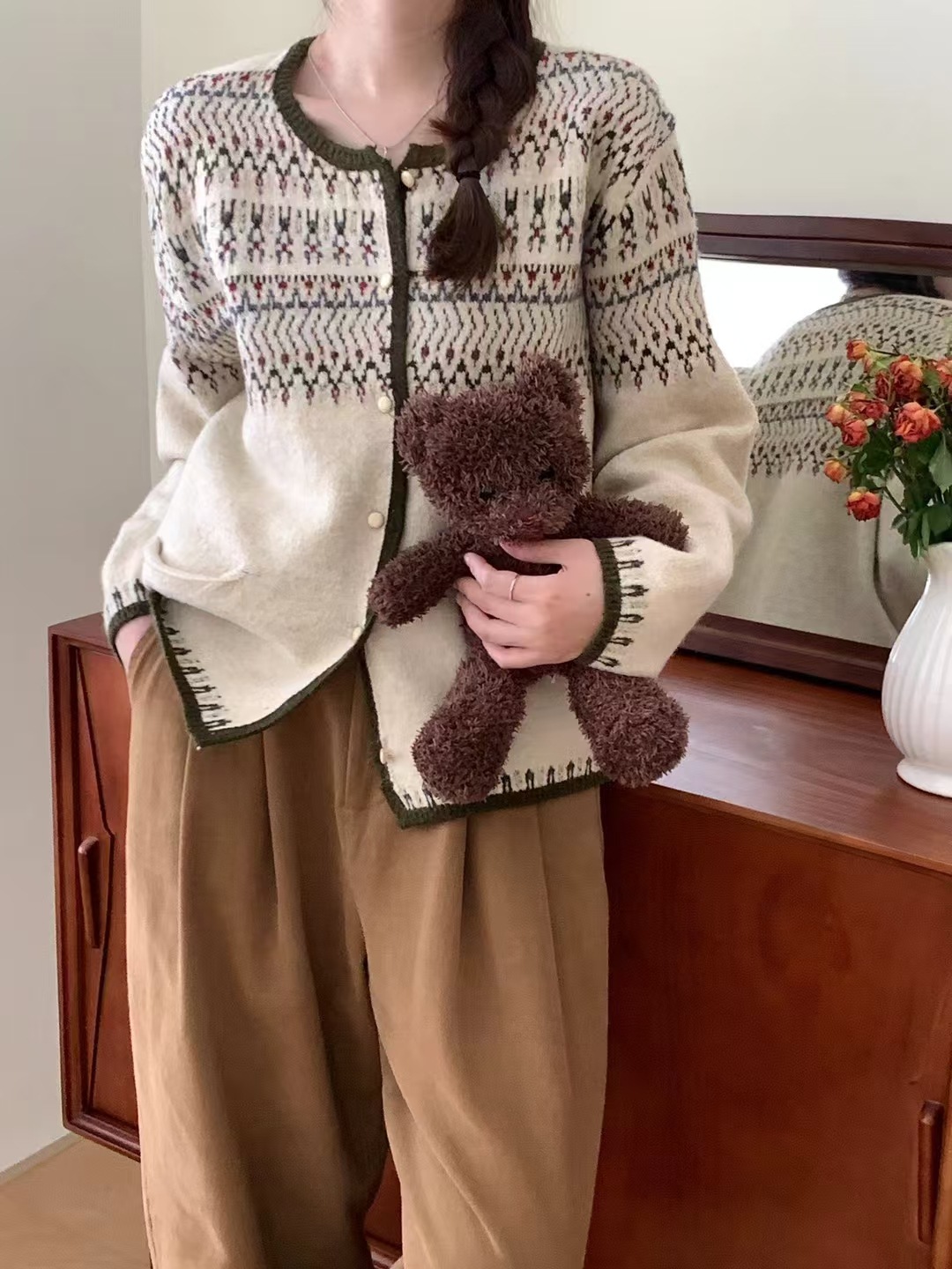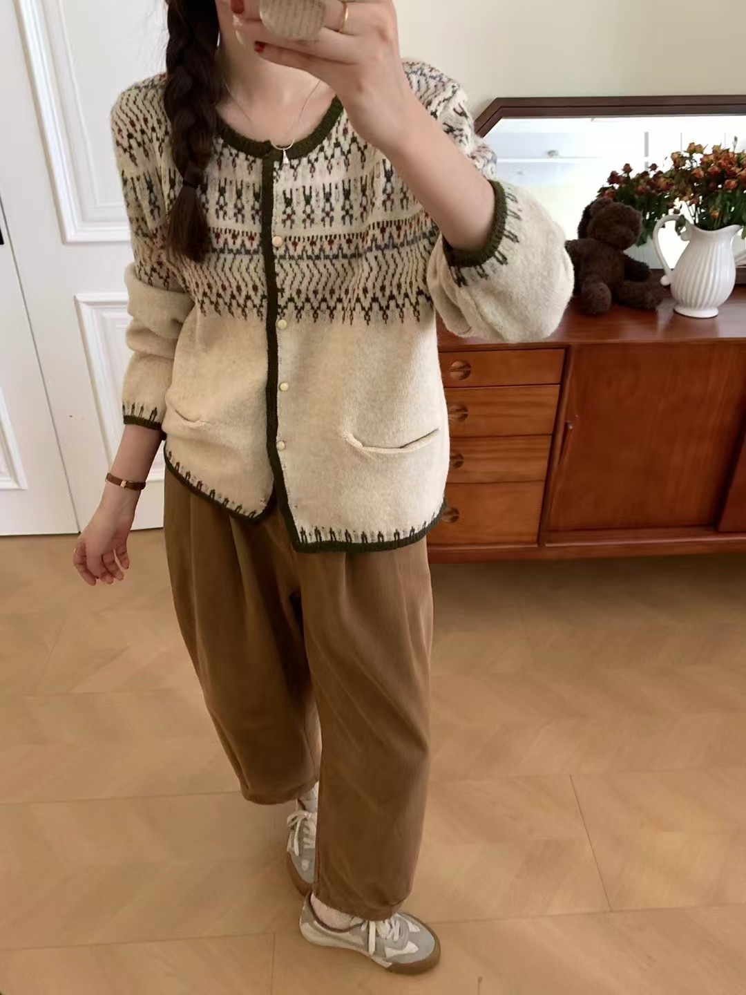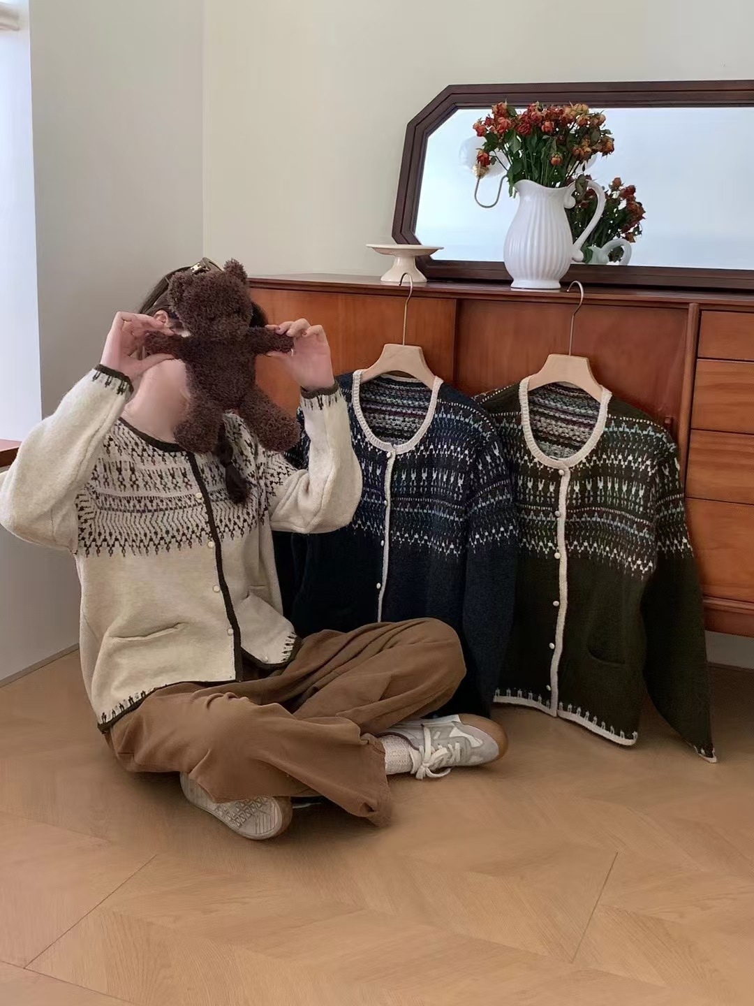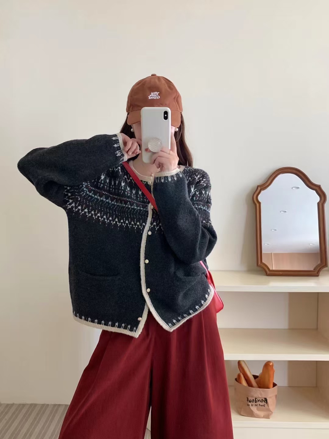 예술적 레트로 스타일 디자인 센스 자카드 니트 카디건 여성 초가을 새 라운드 넥 대조 컬러 게으른 느슨한 니트 스웨터스토어 가기