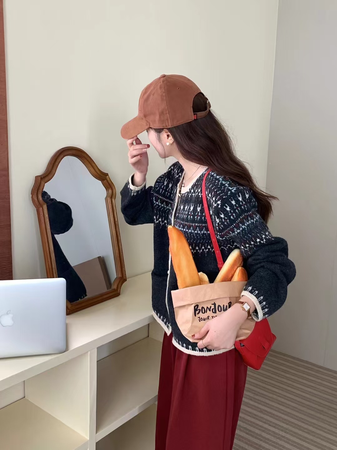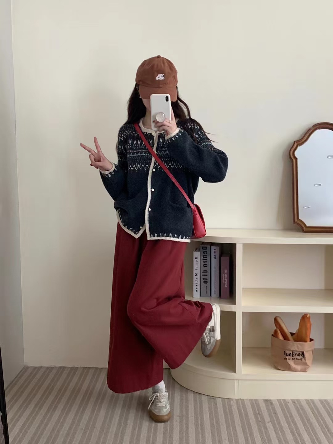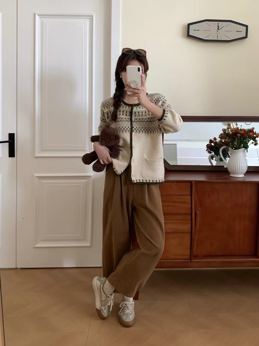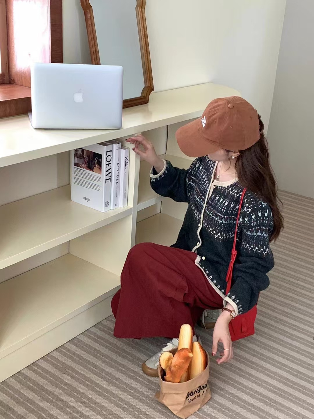 예술적 레트로 스타일 디자인 센스 자카드 니트 카디건 여성 초가을 새 라운드 넥 대조 컬러 게으른 느슨한 니트 스웨터스토어 가기