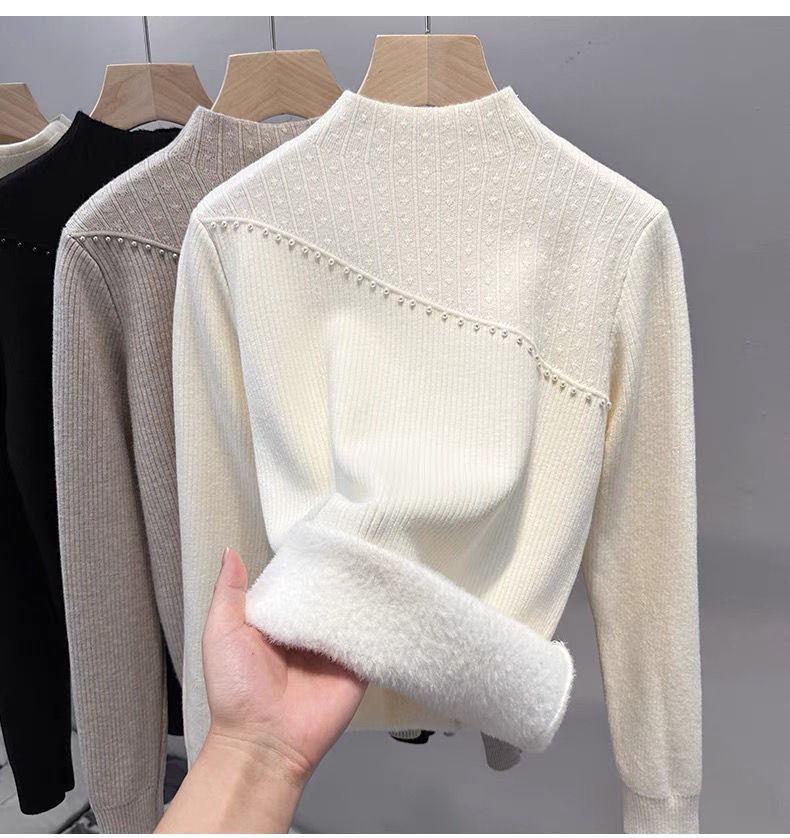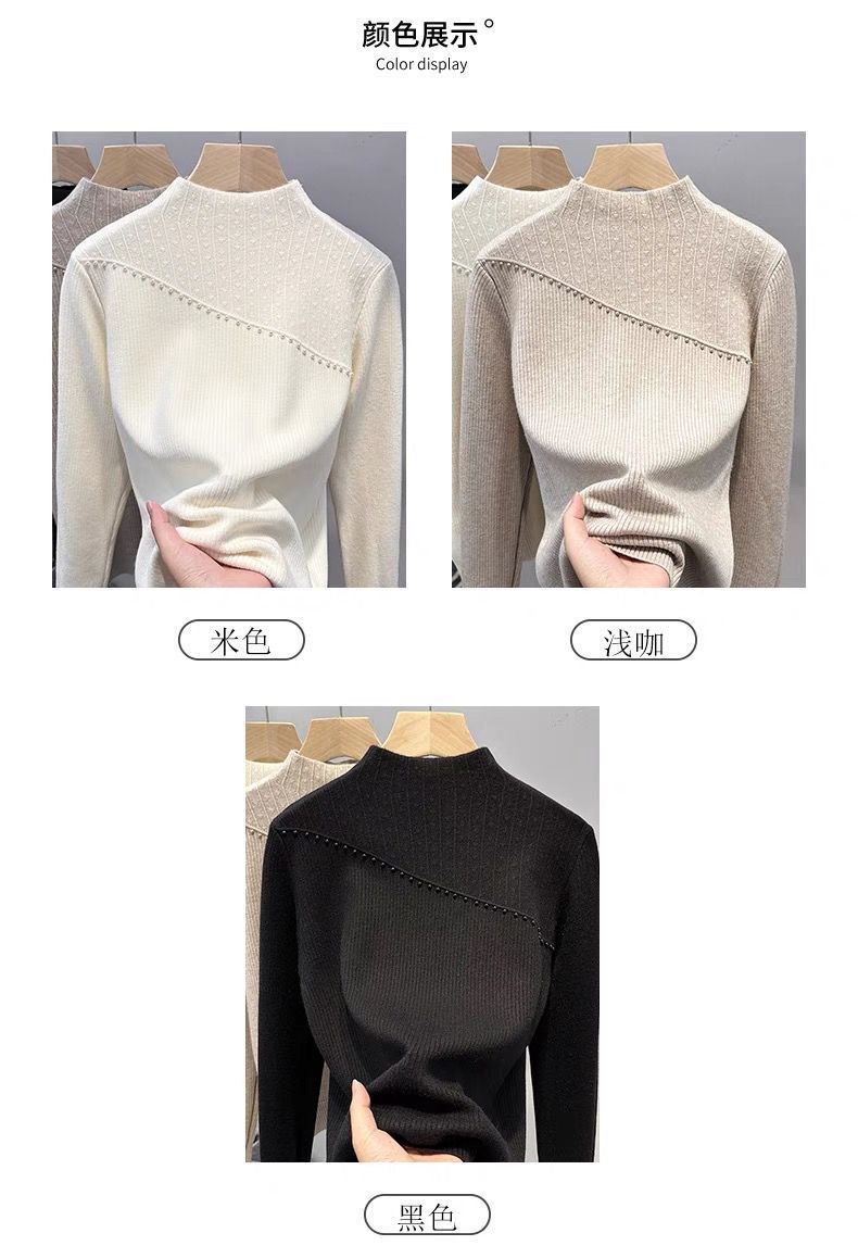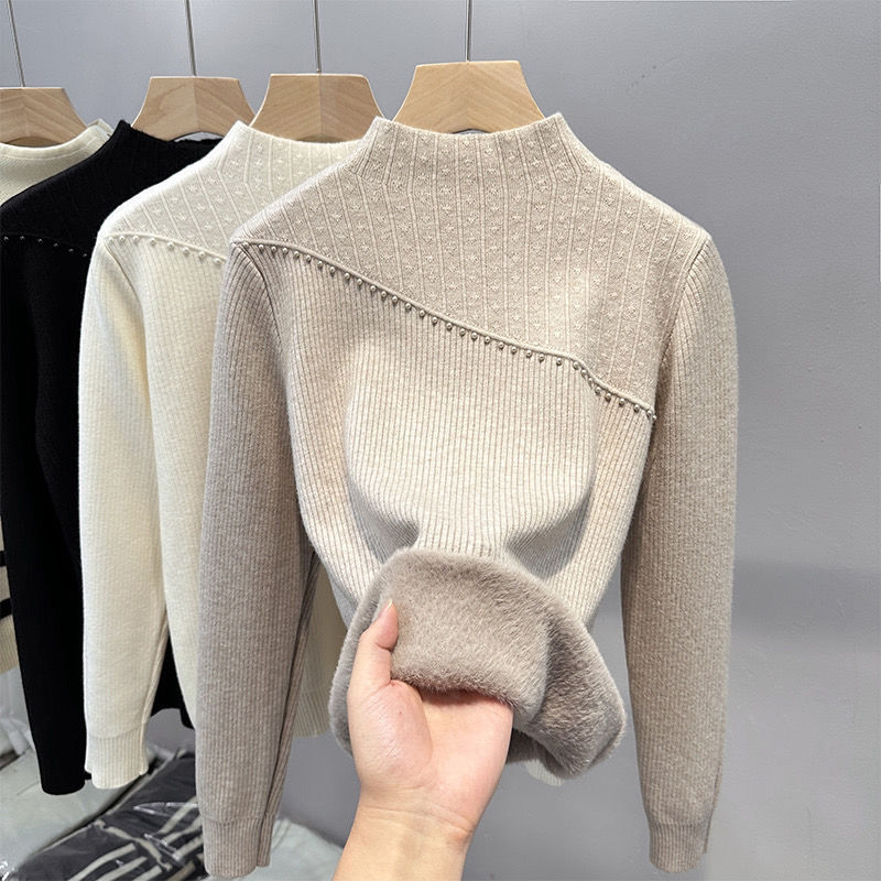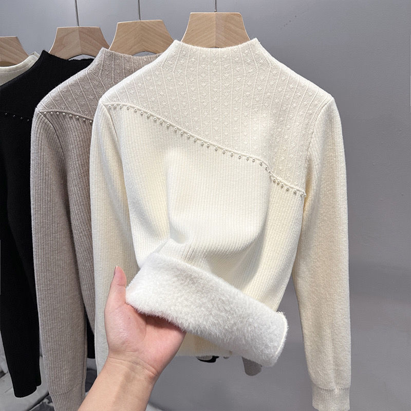 가을과 겨울 기모 두꺼운 스웨터 여성의 따뜻한 원피스 벨벳 내부 2024 새로운 반 높이 목 양모베이스 셔츠 탑