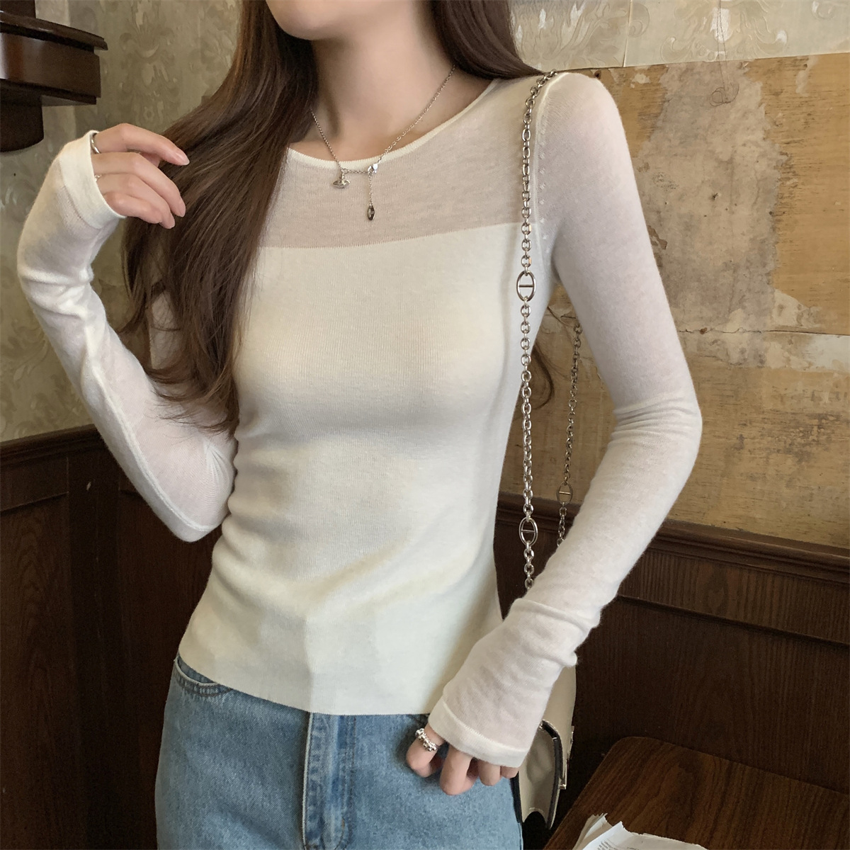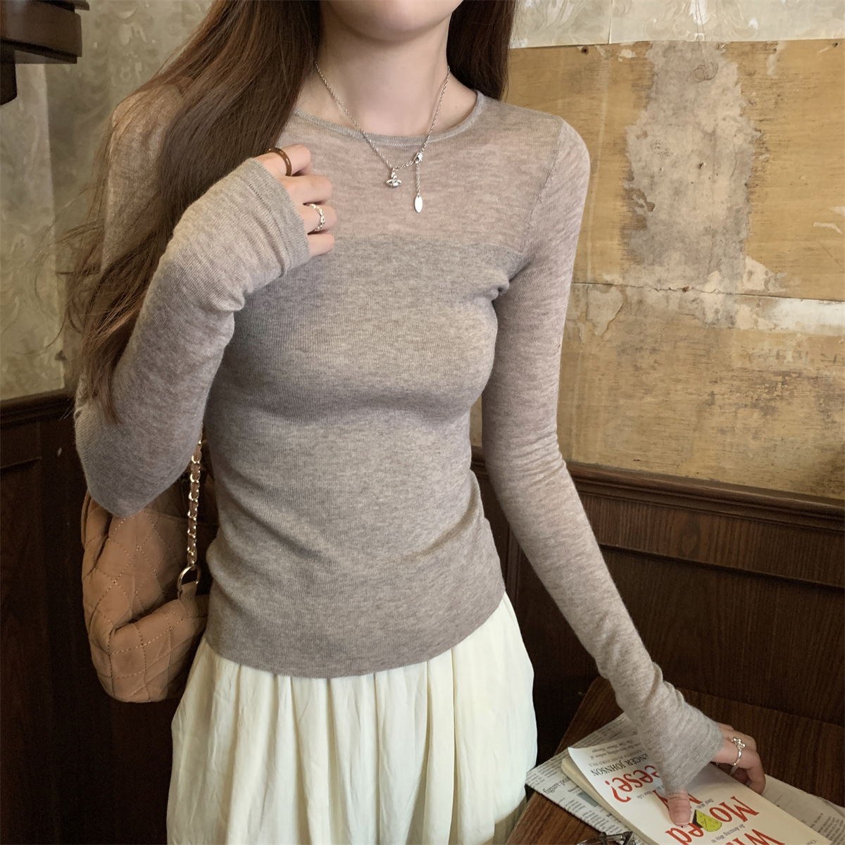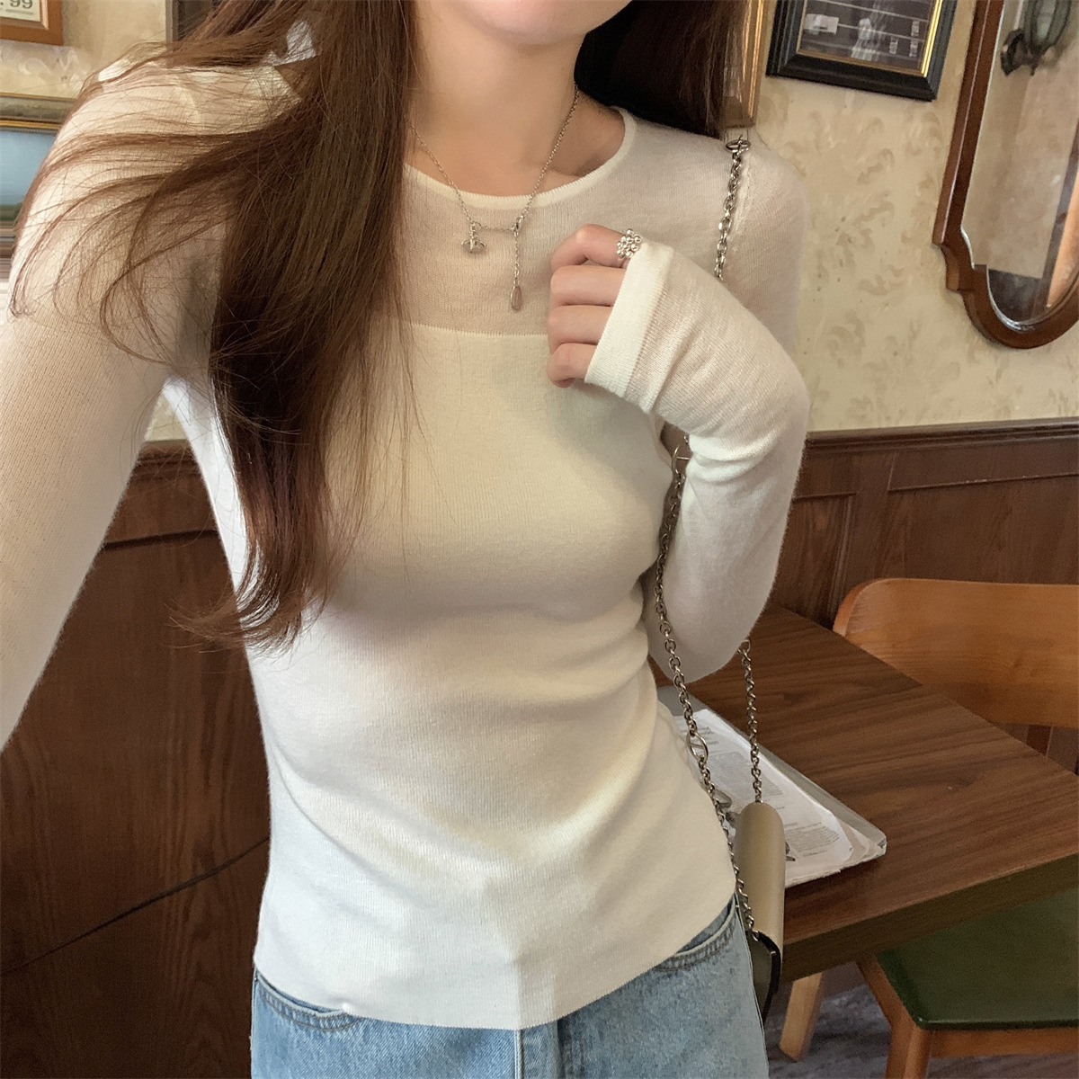 슬림핏 슬림 스티칭 원근감 순수 슬림 스웨터 여성의 2024 년 초가을 얇은 긴팔 내부 쇼트 탑