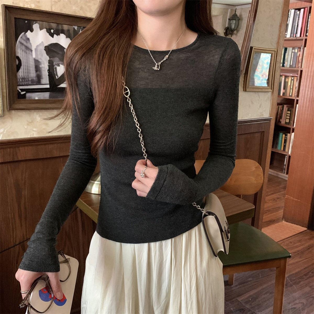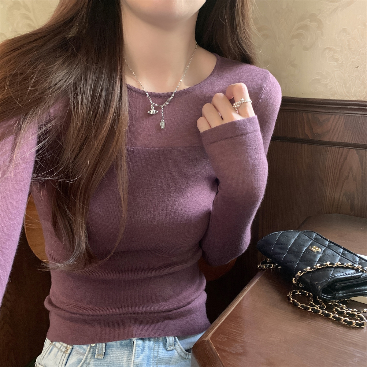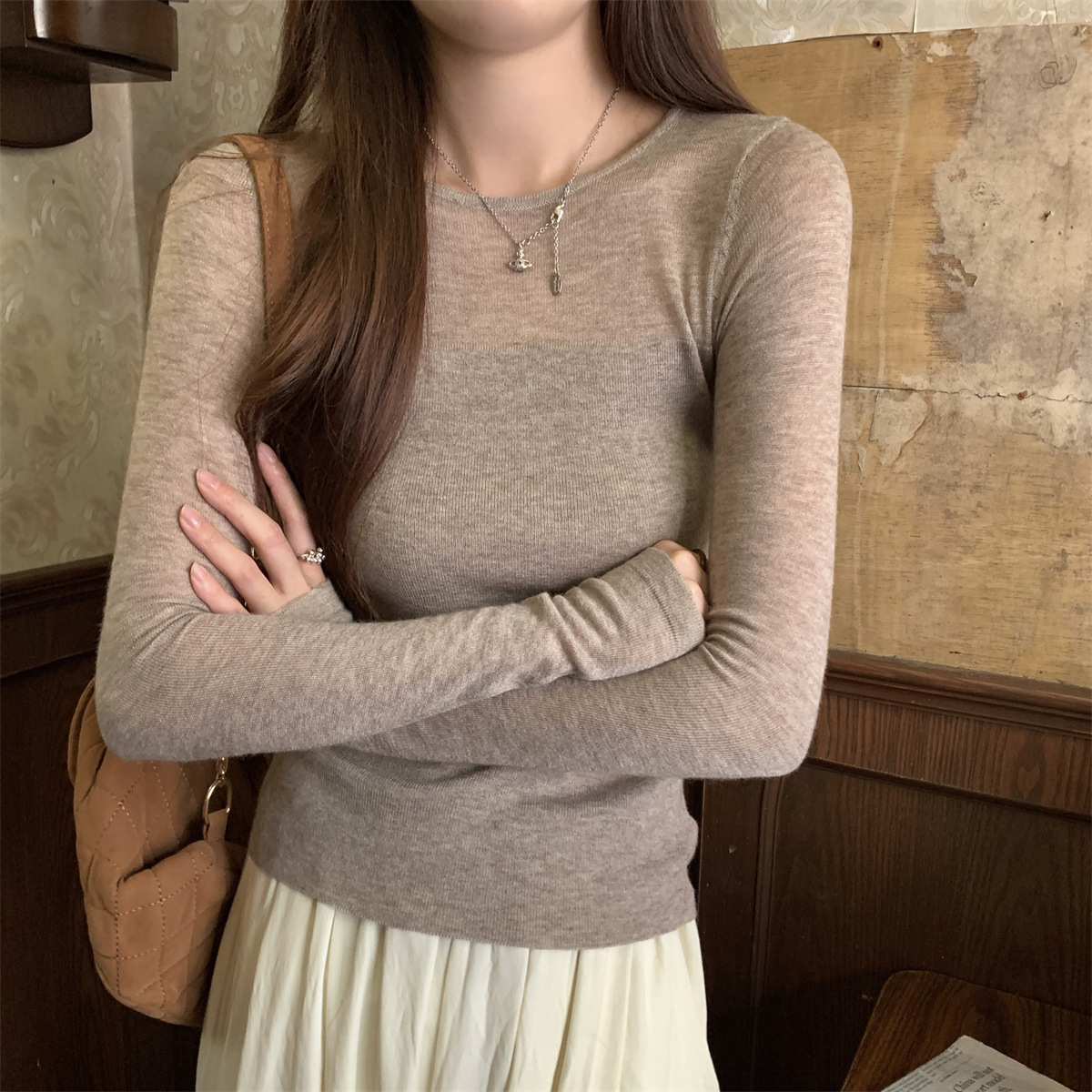 슬림핏 슬림 스티칭 원근감 순수 슬림 스웨터 여성의 2024 년 초가을 얇은 긴팔 내부 쇼트 탑