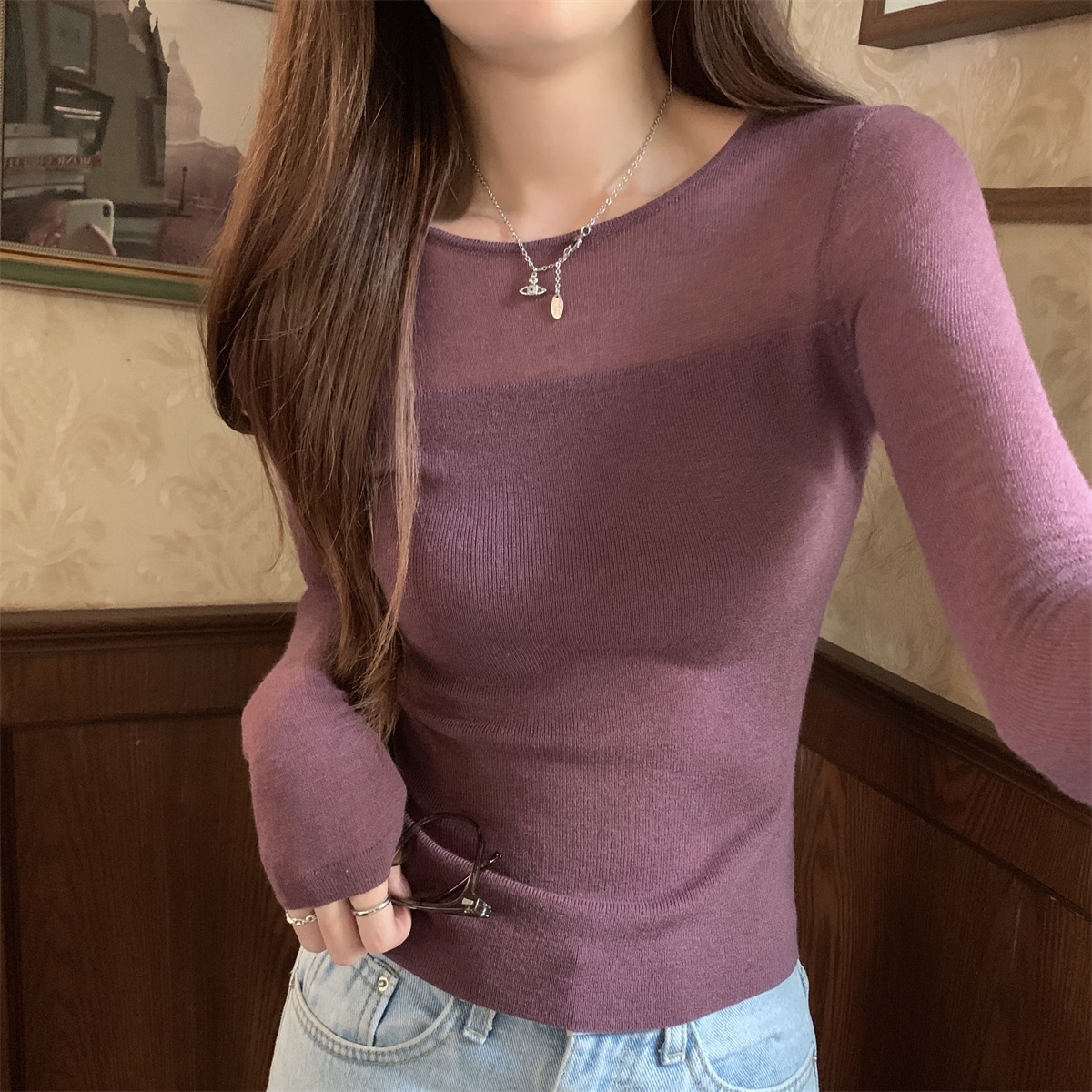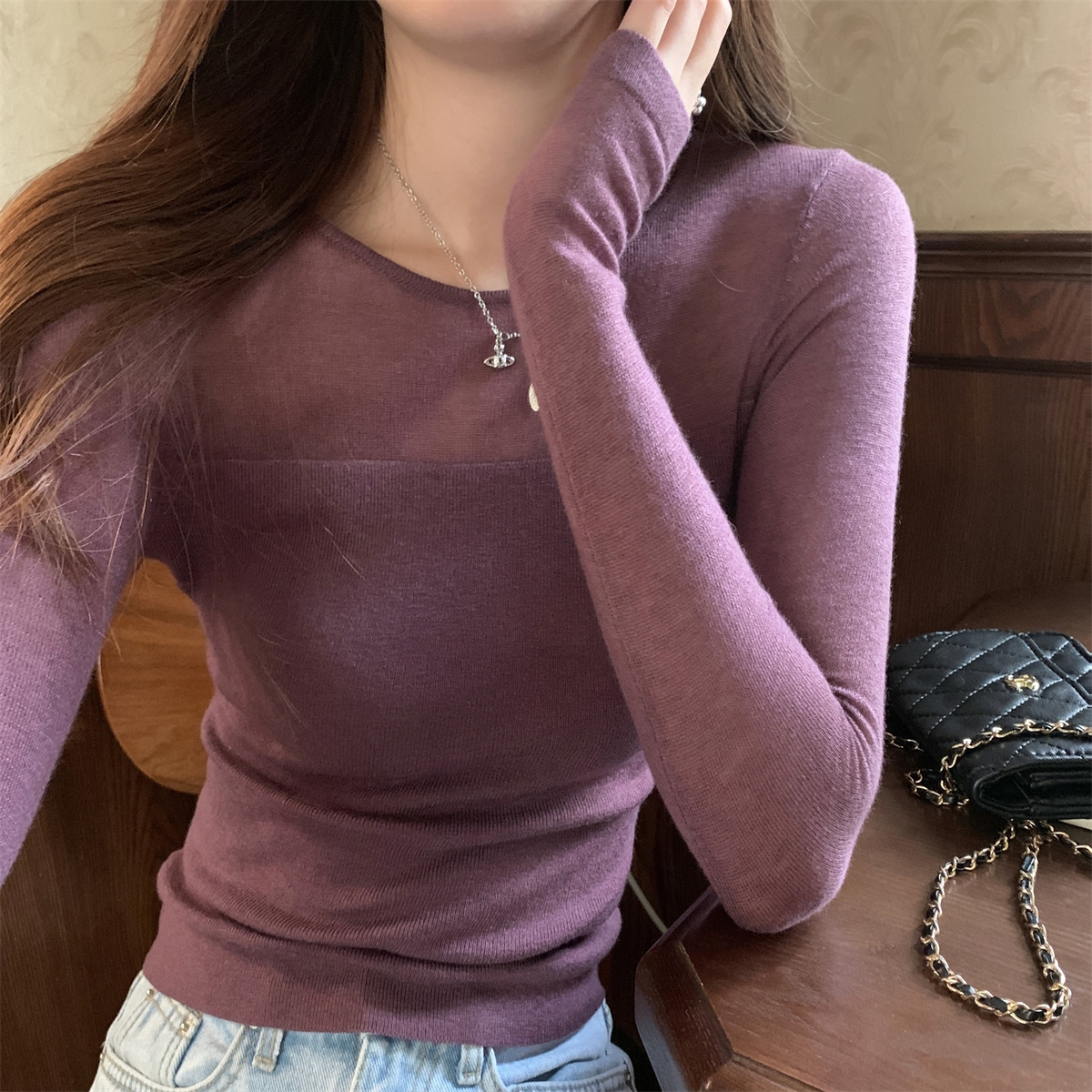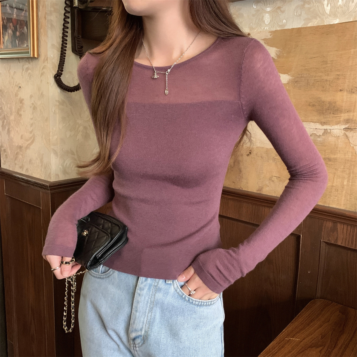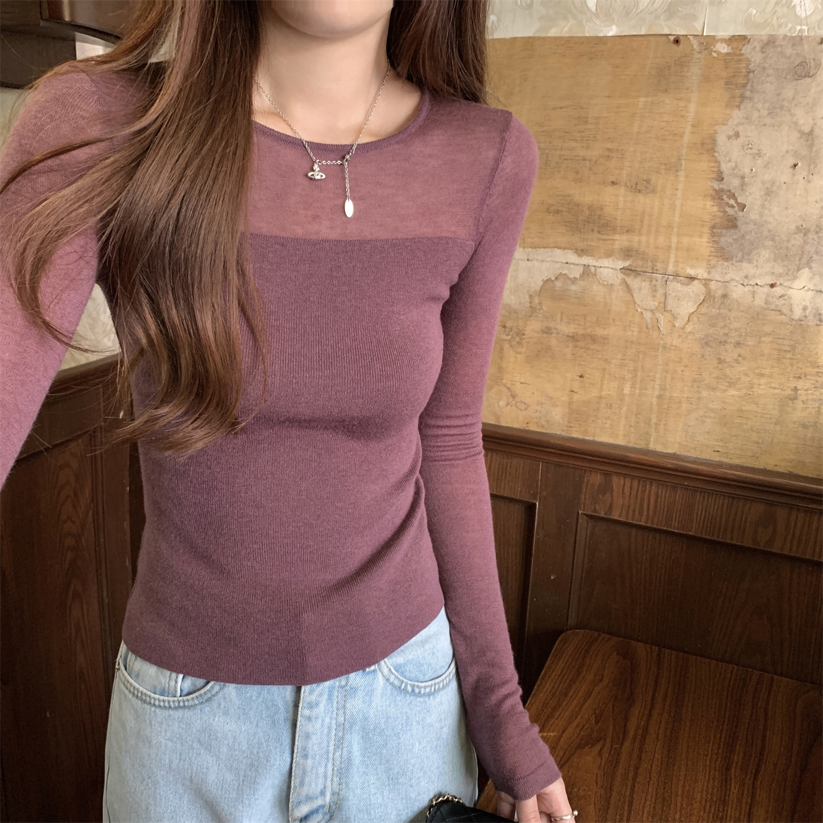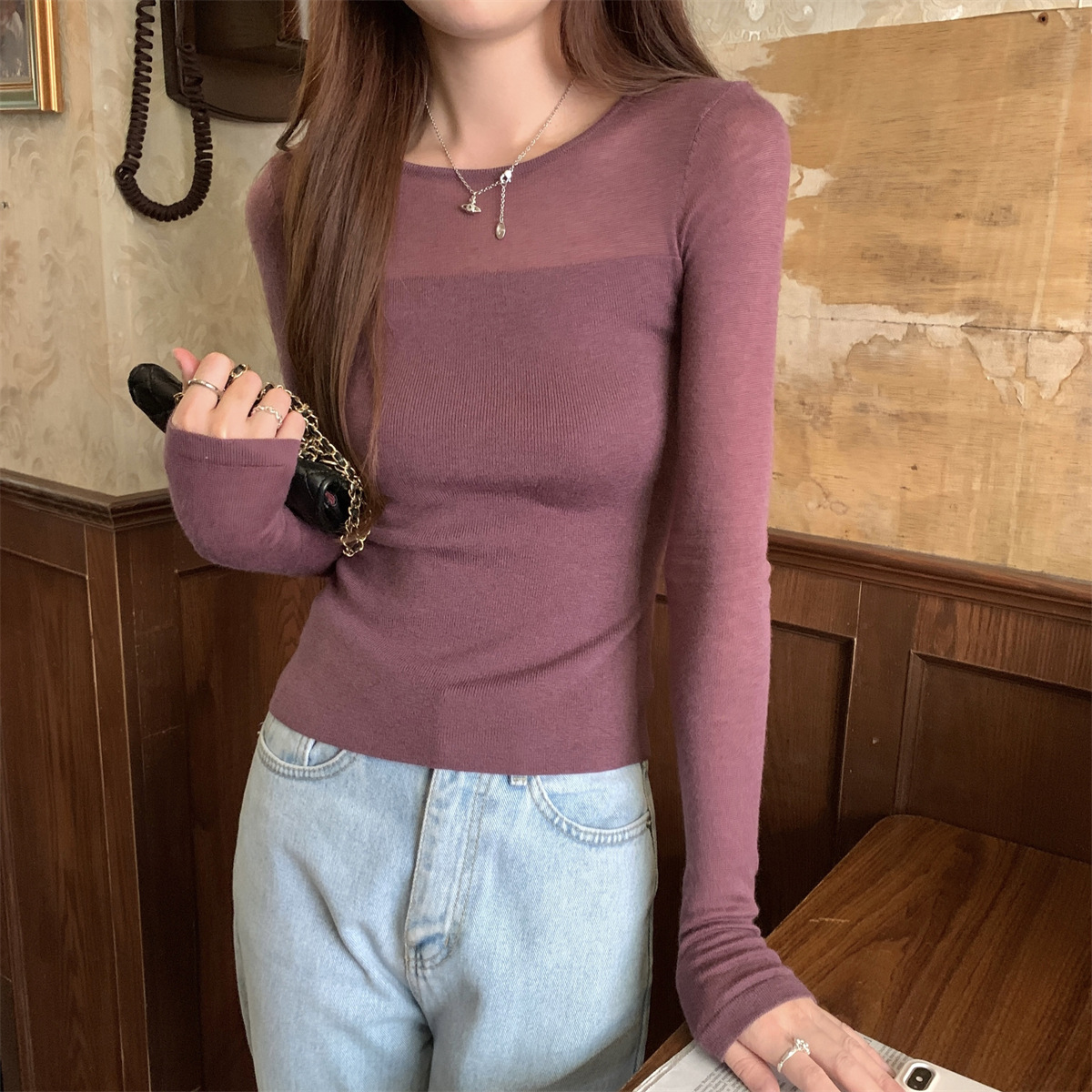 슬림핏 슬림 스티칭 원근감 순수 슬림 스웨터 여성의 2024 년 초가을 얇은 긴팔 내부 쇼트 탑스토어 가기