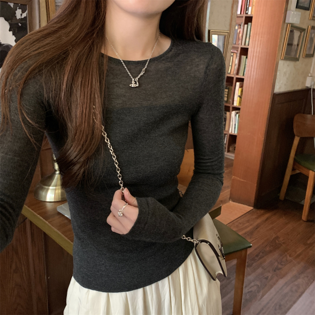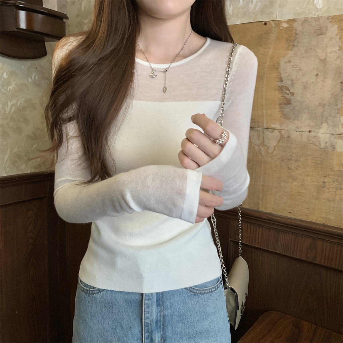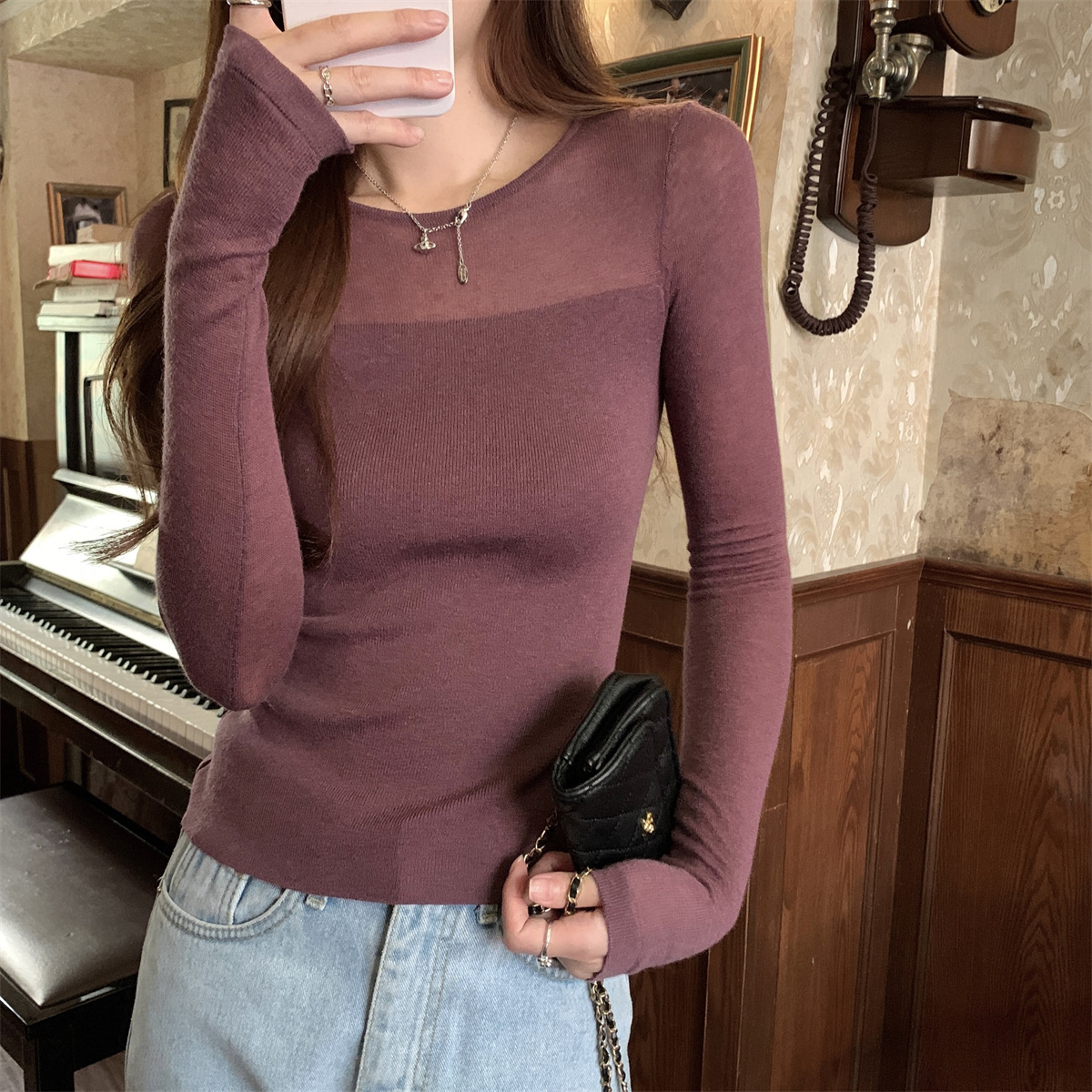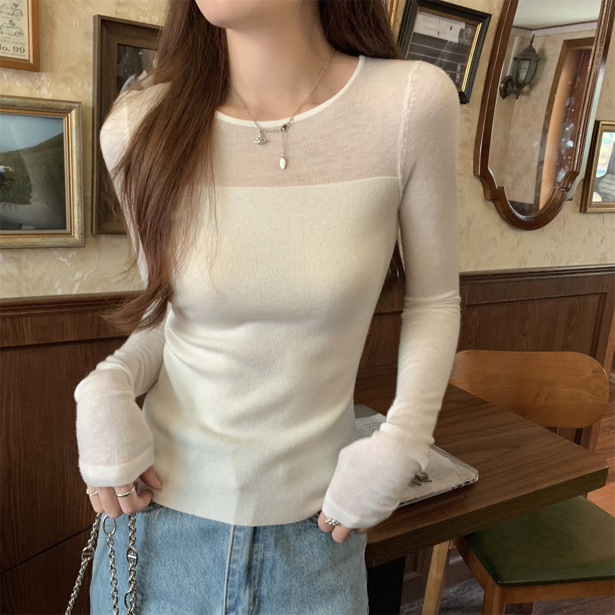 슬림핏 슬림 스티칭 원근감 순수 슬림 스웨터 여성의 2024 년 초가을 얇은 긴팔 내부 쇼트 탑스토어 가기