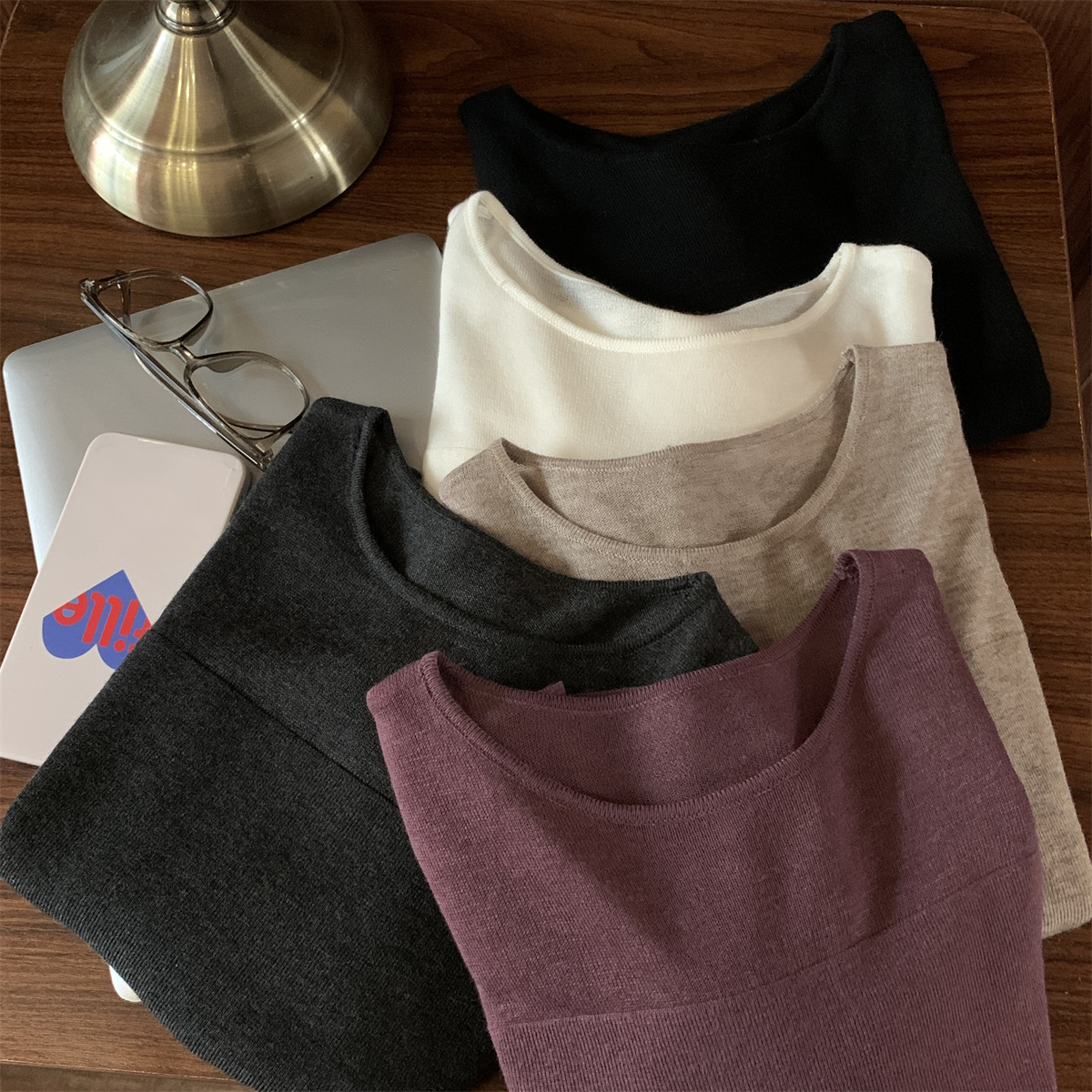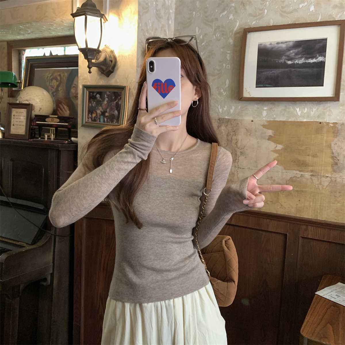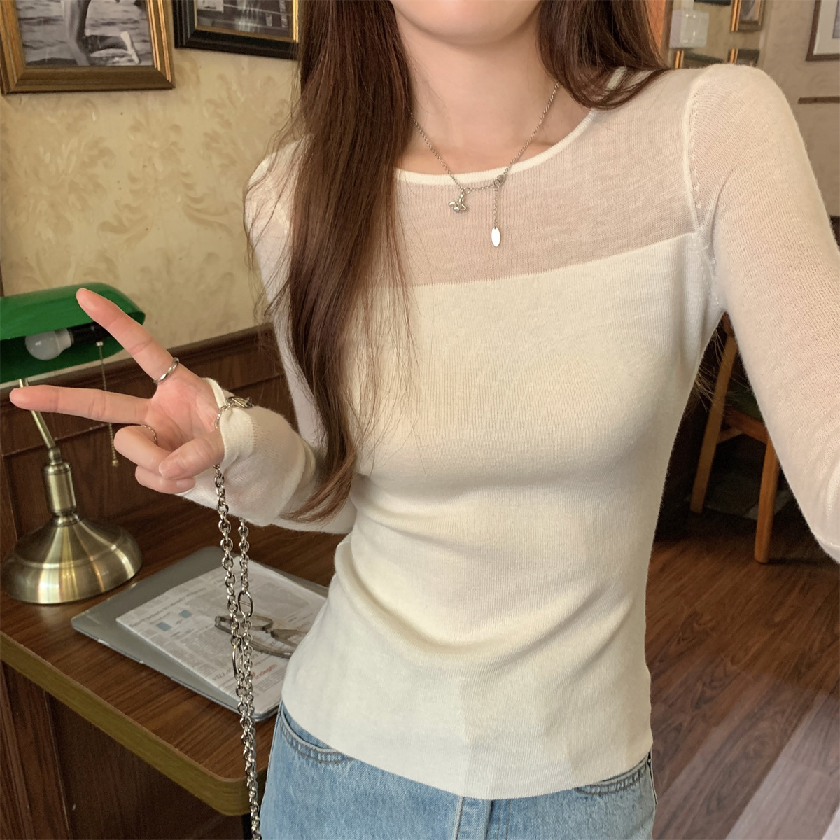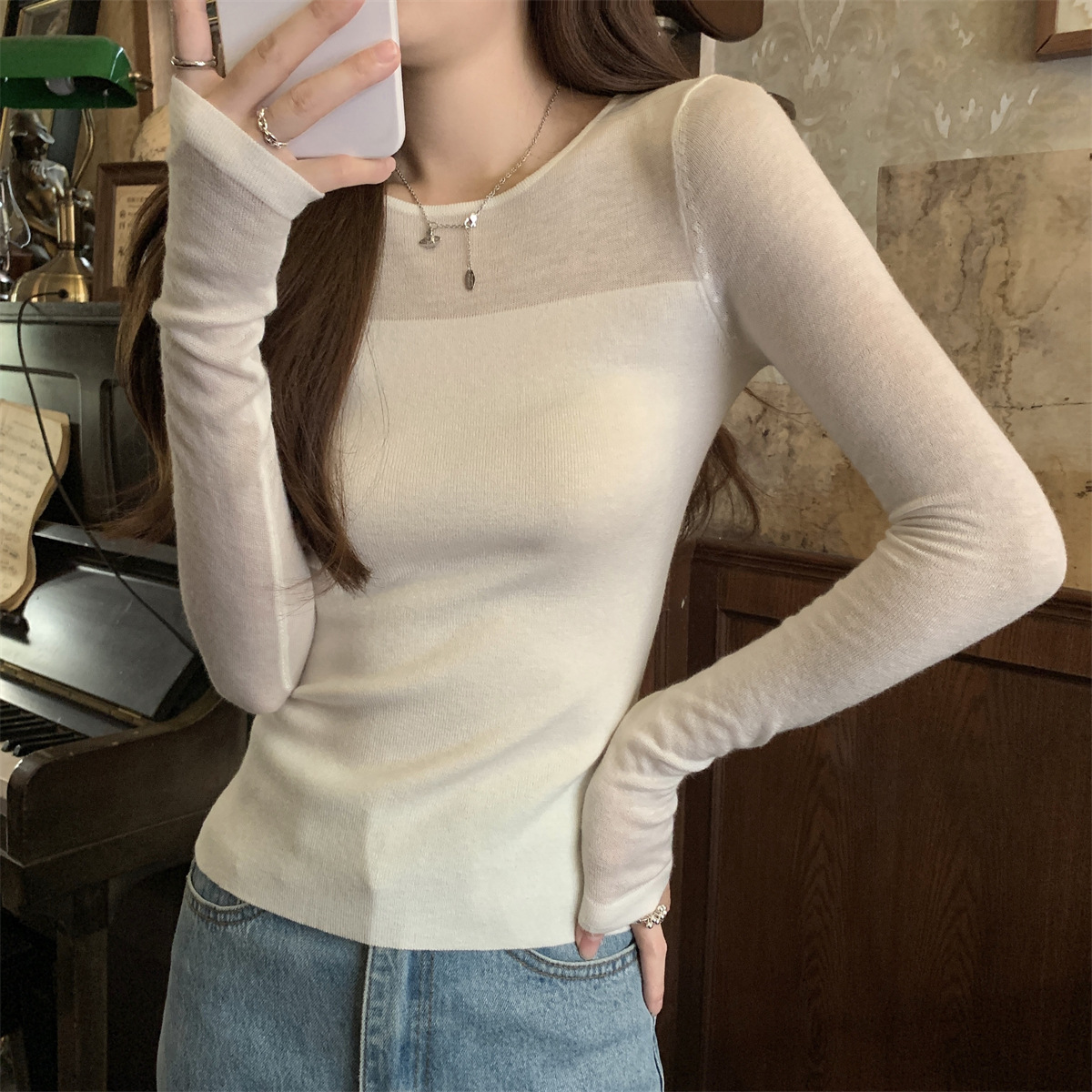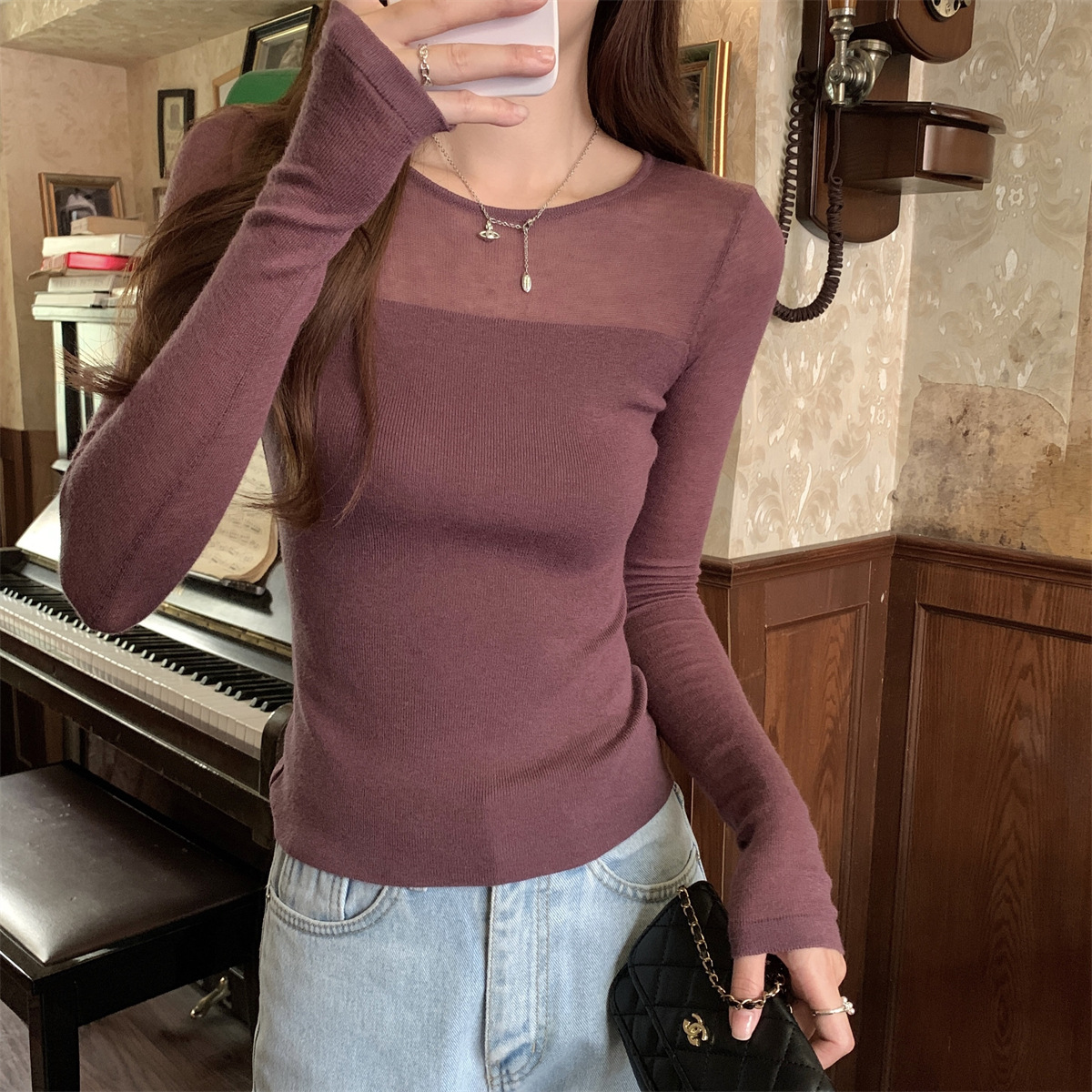 슬림핏 슬림 스티칭 원근감 순수 슬림 스웨터 여성의 2024 년 초가을 얇은 긴팔 내부 쇼트 탑스토어 가기