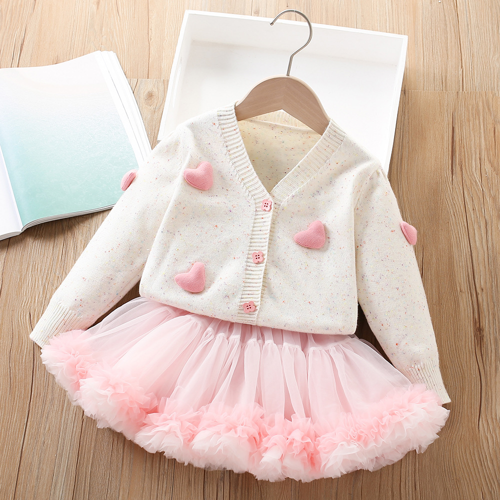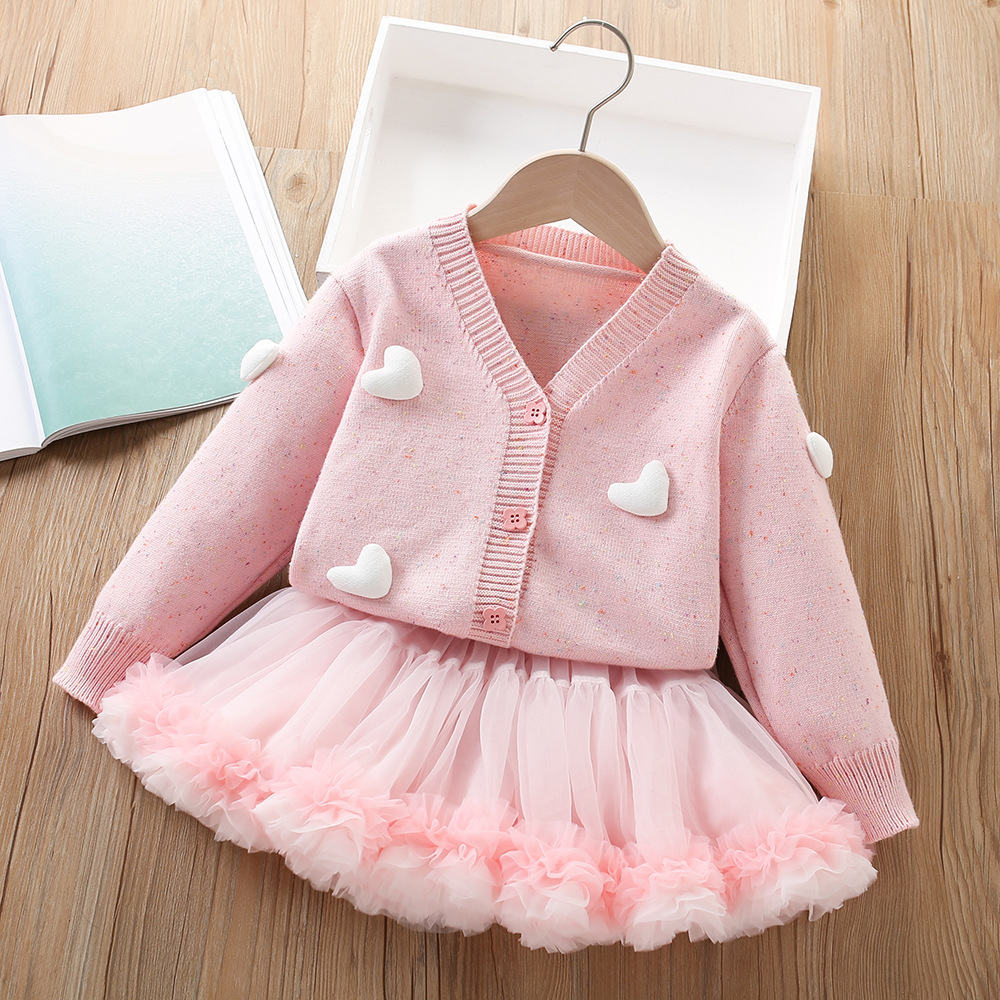 소녀 스웨터 세트 2024 가을과 겨울 새로운 달콤한 아이들의 사랑 니트 V 넥 카디건 투투 스커트 투피스 세트