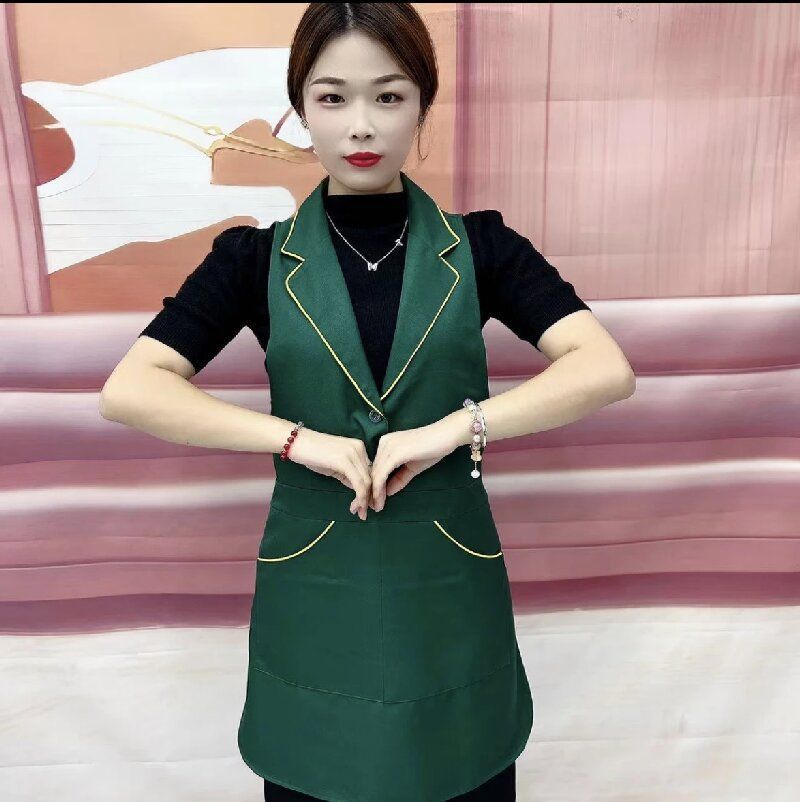 새로운 스타일의 롤업 라펠 앞치마, 주방, 가정, 레스토랑 작업복, 고급 네일샵 도매용 민소매 앞치마