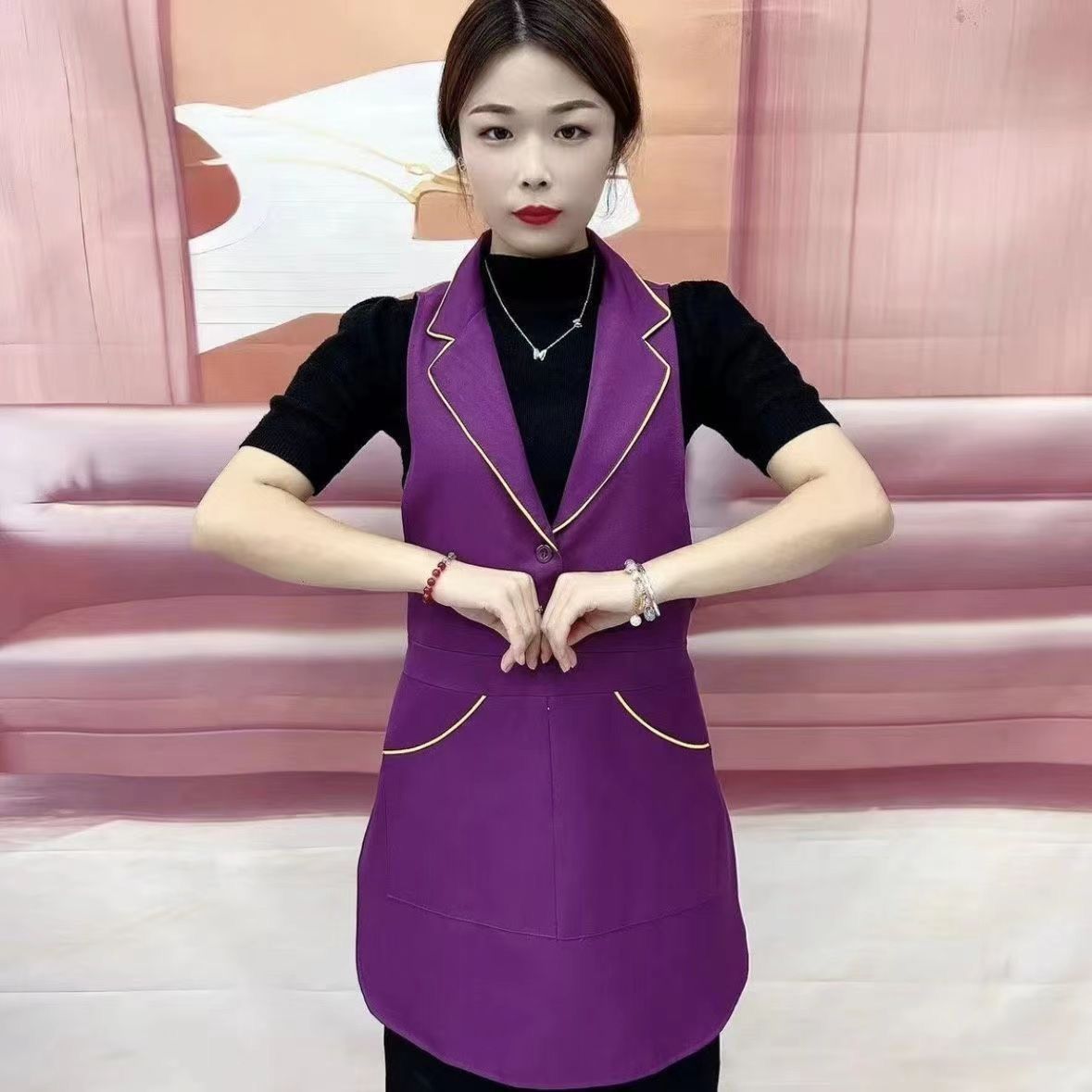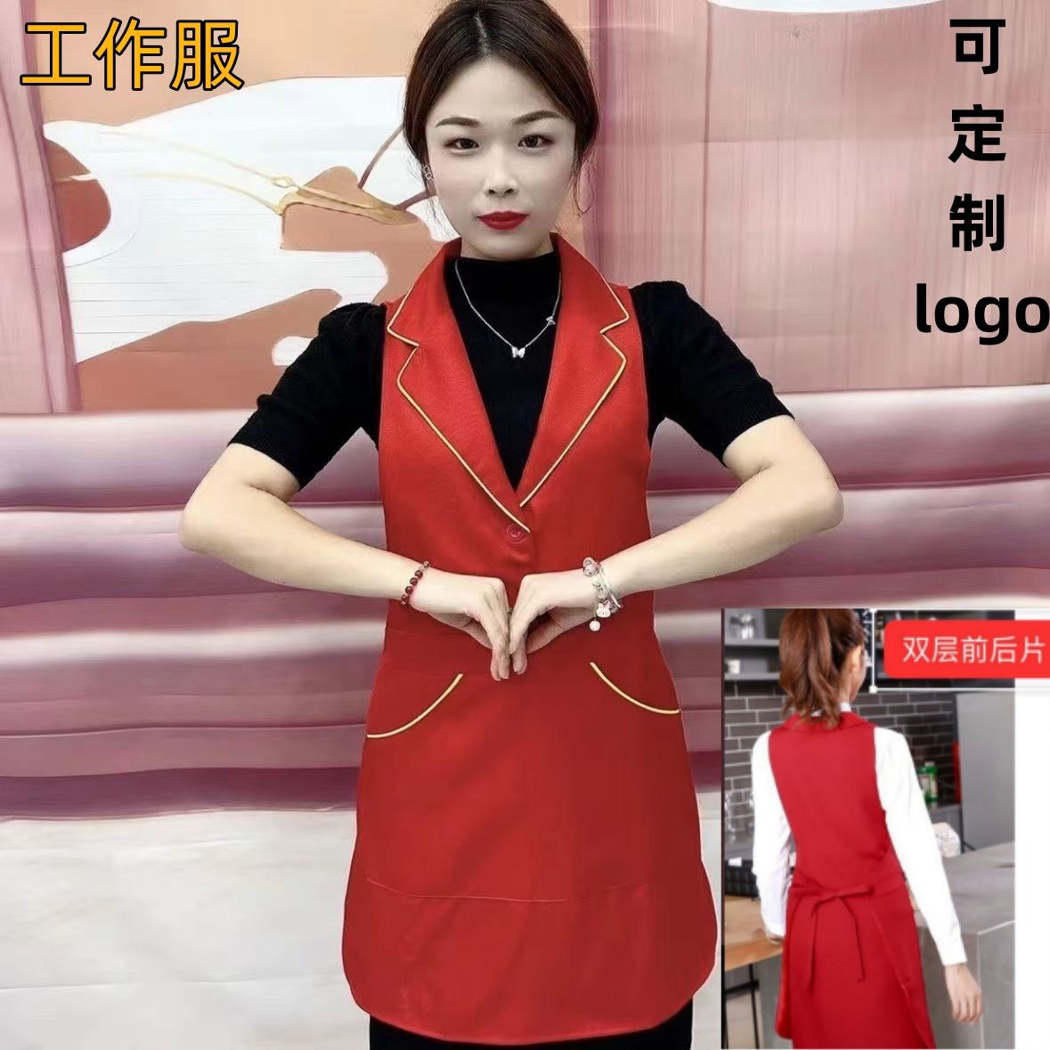 새로운 스타일의 롤업 라펠 앞치마, 주방, 가정, 레스토랑 작업복, 고급 네일샵 도매용 민소매 앞치마스토어 가기