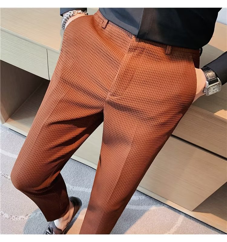 와플 캐주얼 바지 남성용 얇은 바지 사업 세트 바지 슬림 핏 작은 발 비 다림질 높은 수준의 세트 바지스토어 가기