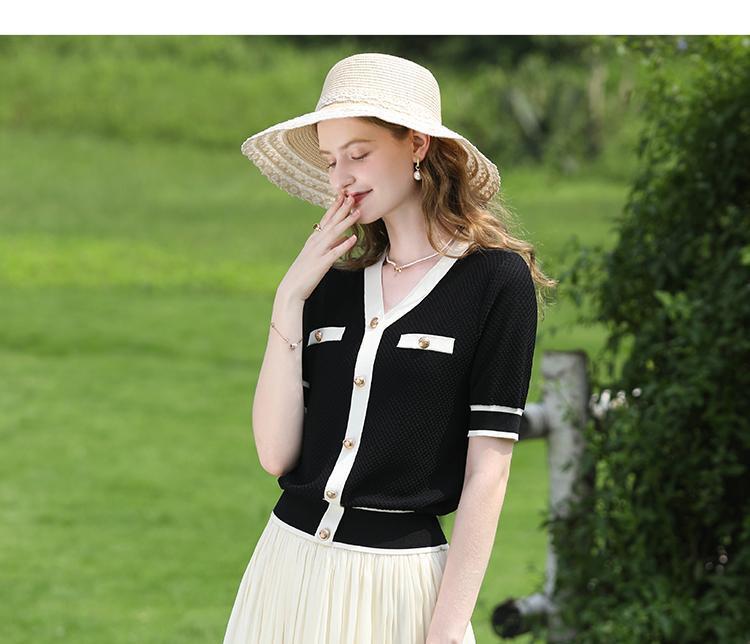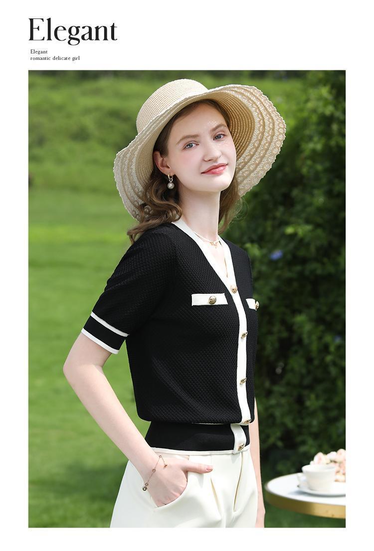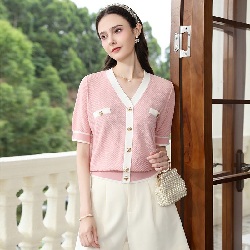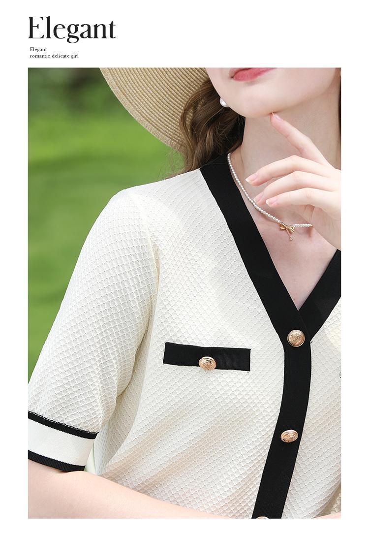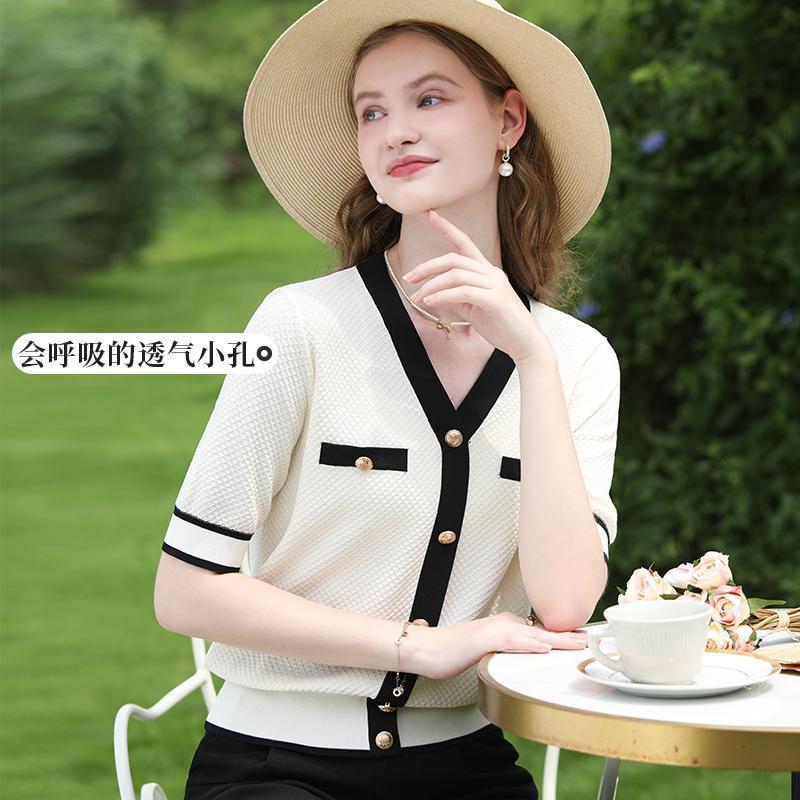 카운터 플러스 사이즈 텐셀 반팔 니트웨어 여성용 여름 새로운 V 넥 컬러 블록 카디건 얇은 루즈 탑