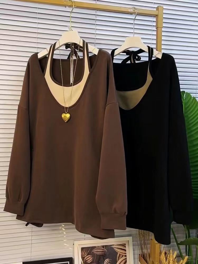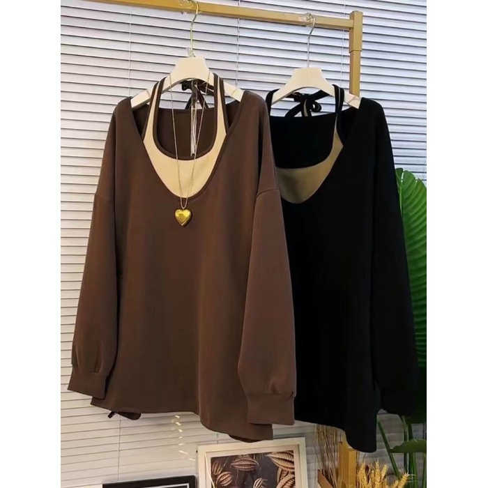뚱뚱한 자매 m300 진 슈퍼 플러스 사이즈 여자의 새로운 가짜 투피스 긴팔 티셔츠 슬림베이스 셔츠 탑 올 매치 트렌디스토어 가기